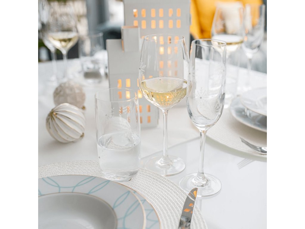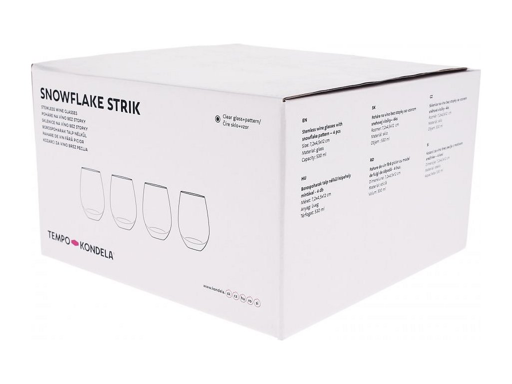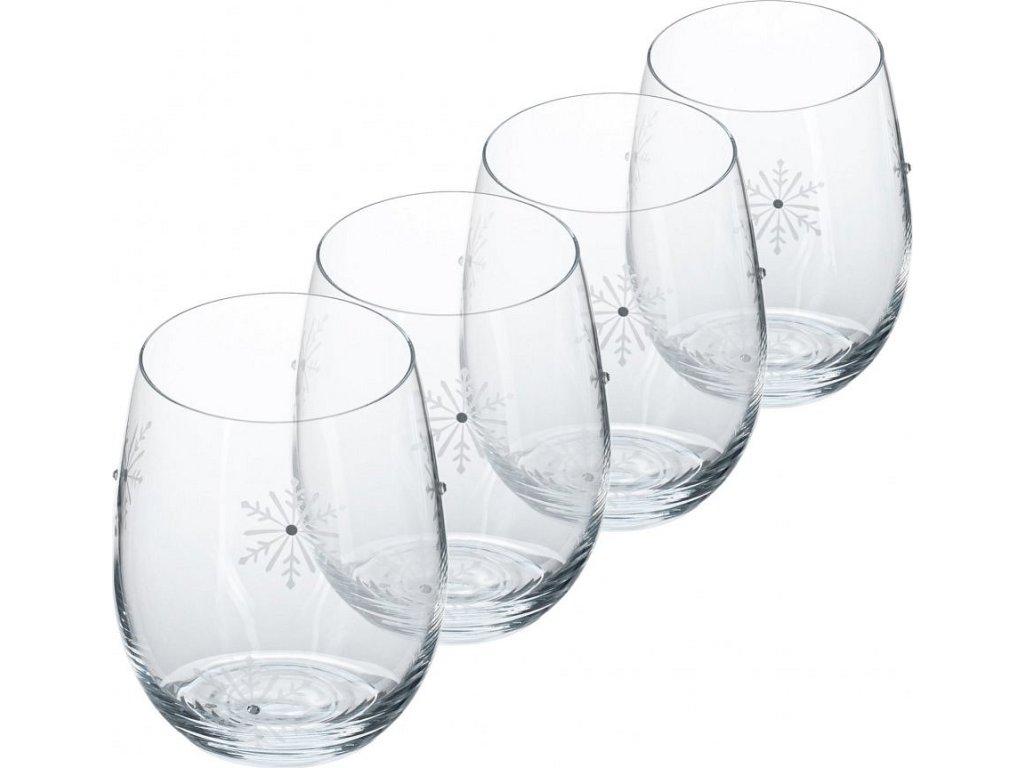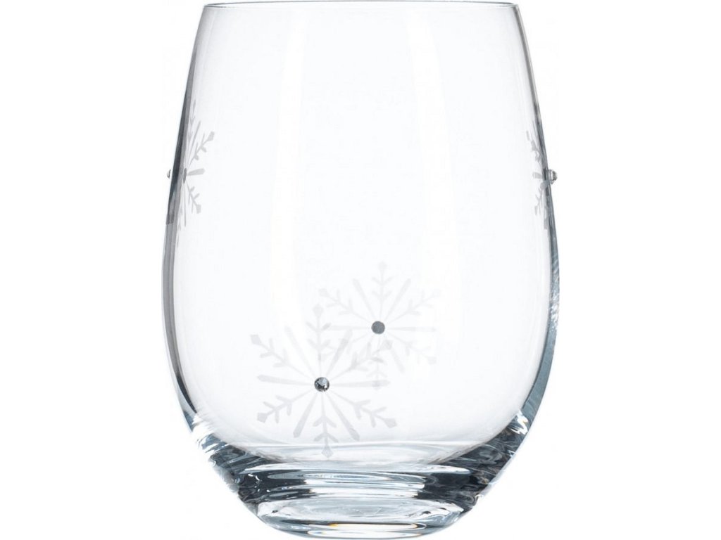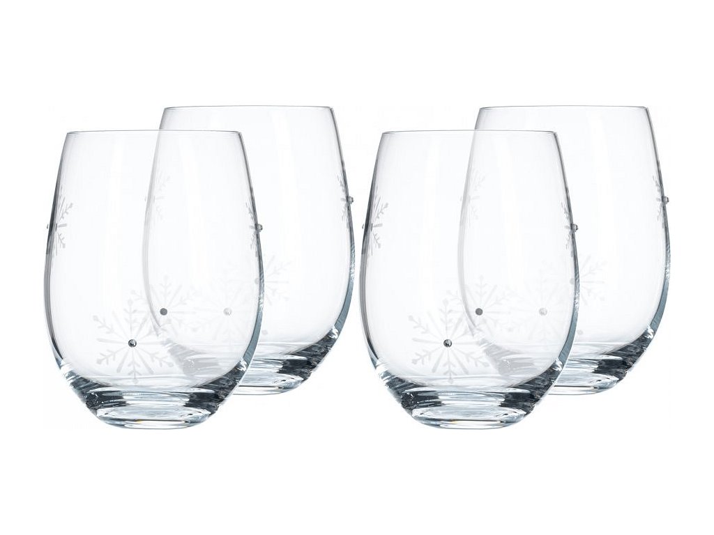 Set 4 ks sklenic na víno Materiál: sklo Barva: čirá / bílá Rozměr (průměr x V): 7,1x12 cm Spodní průměr: 4,5 cm Objem poháru: 530 ml Hmotnost poháru: 175 g Vánoční design Zdobené vločkami s umělým diamantem bez stopky Nevhodné do mikrovlnné trouby Nevhodné do myčky