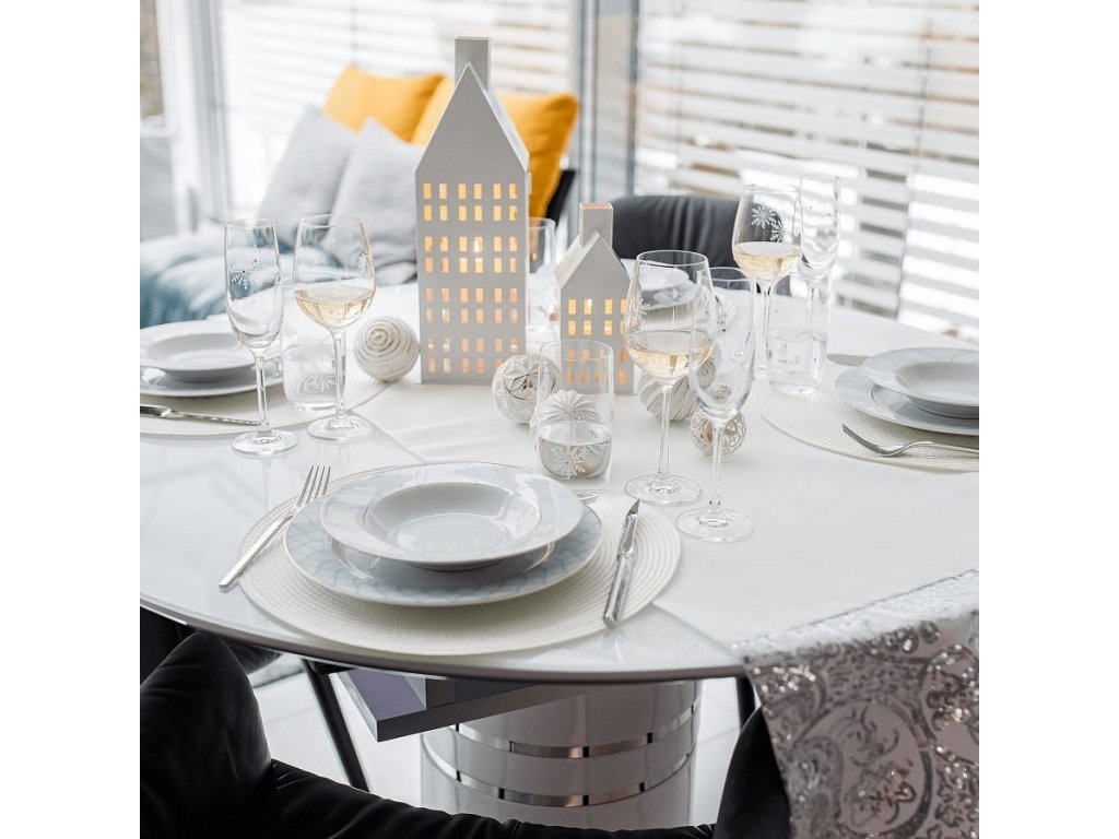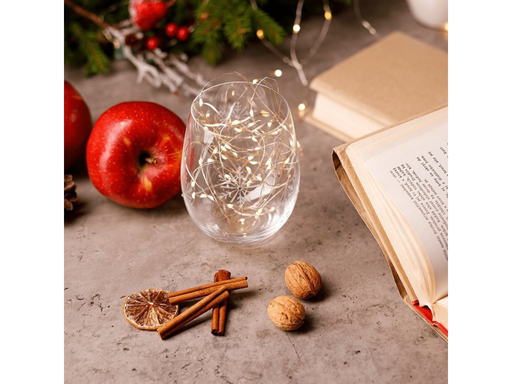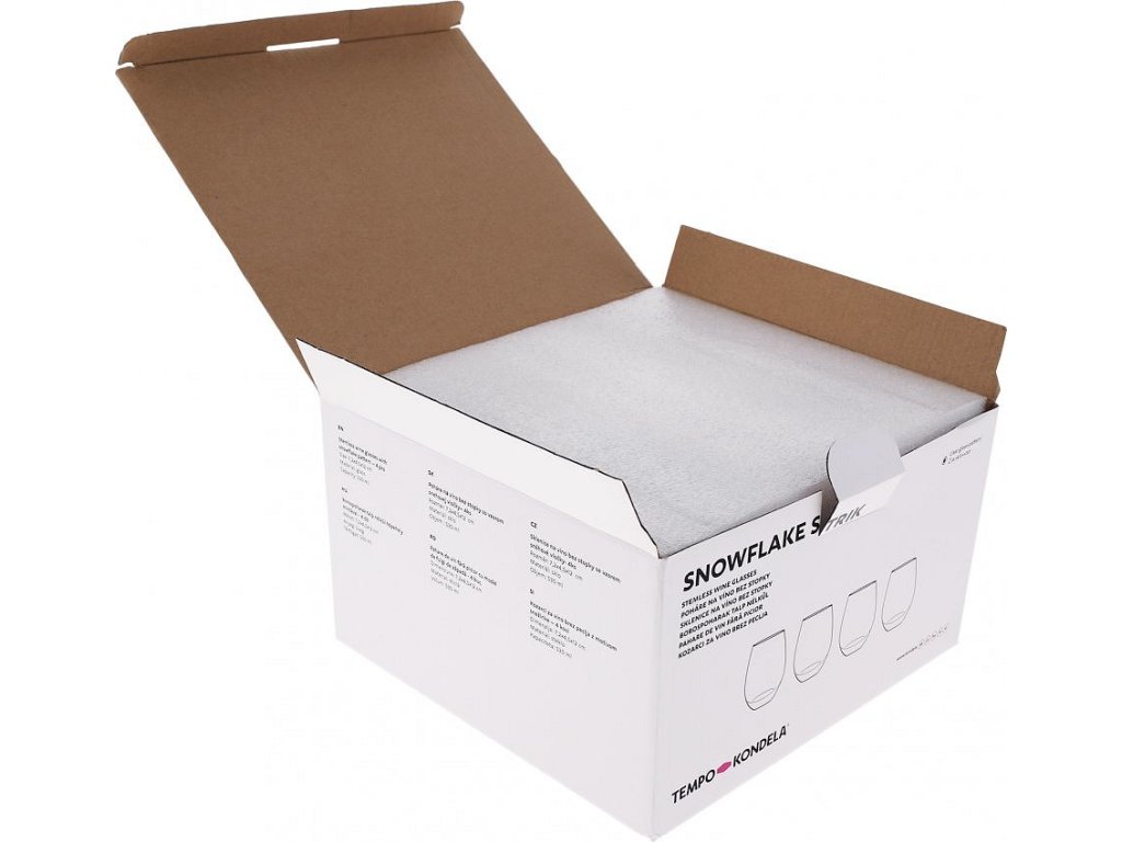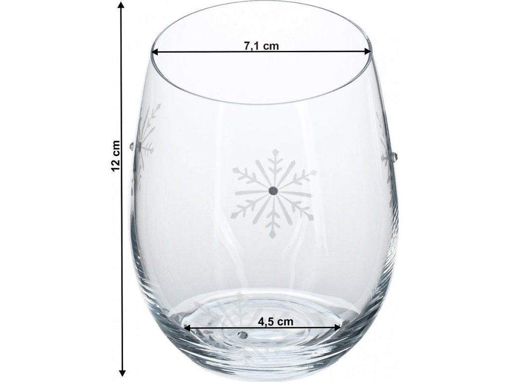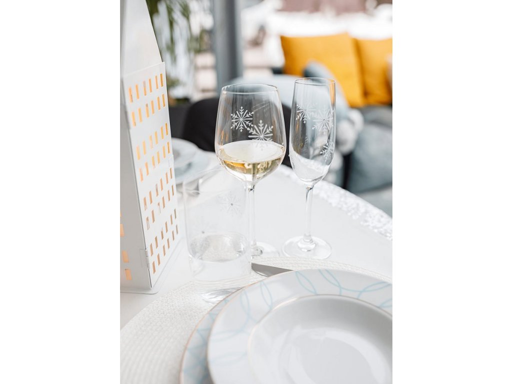 Set 4 ks sklenic na víno Materiál: sklo Barva: čirá / bílá Rozměr (průměr x V): 7,1x12 cm Spodní průměr: 4,5 cm Objem poháru: 530 ml Hmotnost poháru: 175 g Vánoční design Zdobené vločkami s umělým diamantem bez stopky Nevhodné do mikrovlnné trouby Nevhodné do myčky