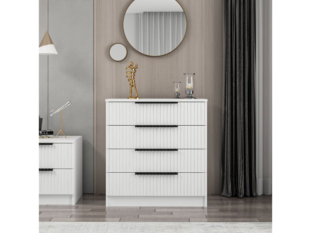 Komoda v elegantní bílé barvě je dokonalým doplňkem do moderního obývacího pokoje. Díky čtyřem praktickým zásuvkám nabízí dostatek úložného prostoru pro organizaci vašich věcí. Minimalistický design inspirovaný skandinávským stylem dodá vašemu interiéru lehkost a nadčasovou eleganci.