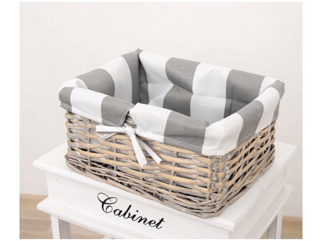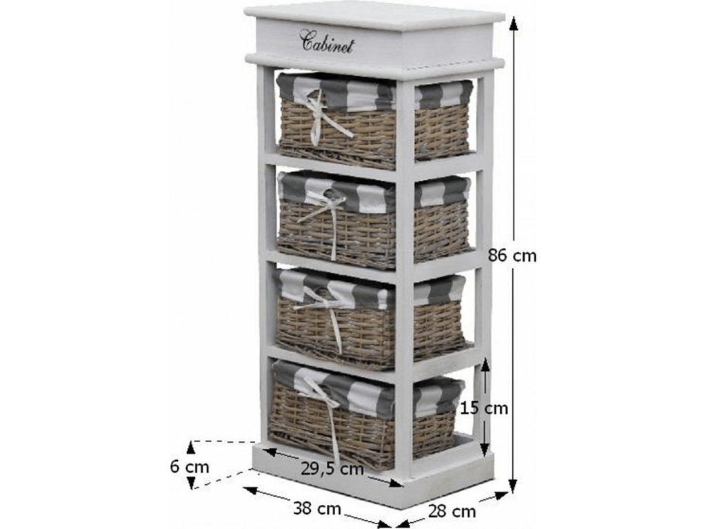 komoda se 4 proutěnými košíky v pevném dřevěném rámu, barevné provedení šedobílé, materiál: dřevo / proutí, rozměry ŠxVxH: 38x86x28 cm.