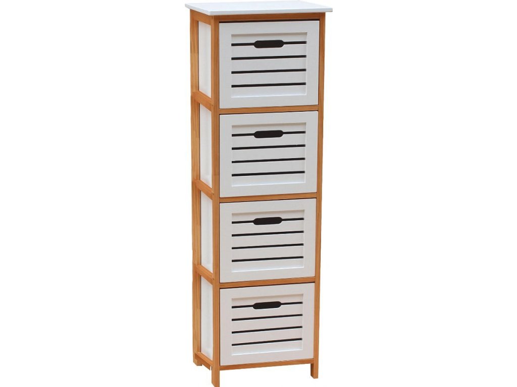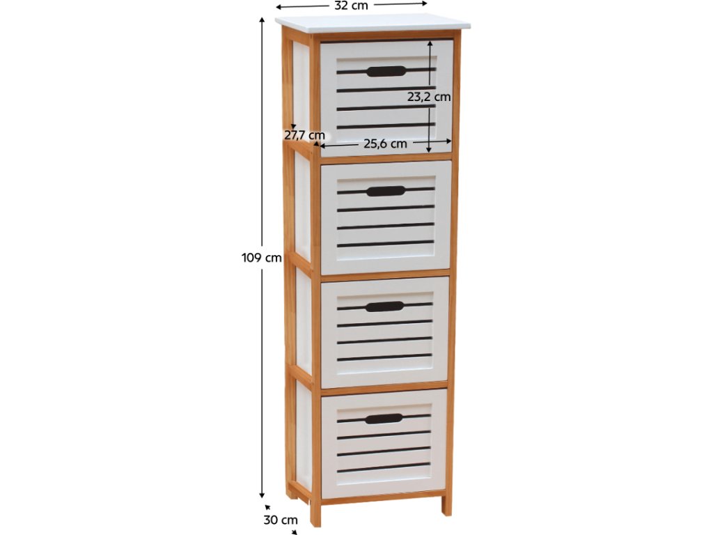 Materiál: MDF / masivní dřevo Barva: bílá / přírodní Rozměry (ŠxHxV): 32x30x109 cm čtyři šuplíky Dodávané v demontu.