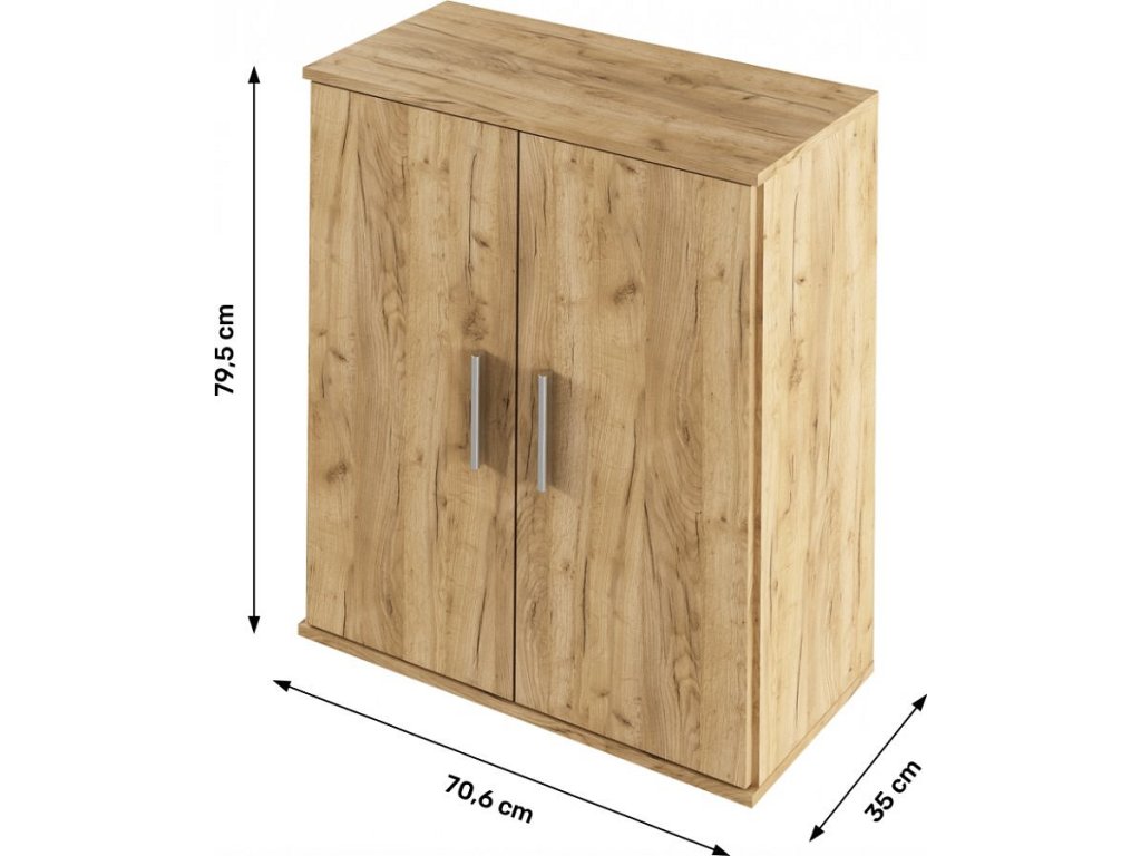 Materiál: DTD laminovaná Barva: dub artisan Rozměry (ŠxHxV): 70,6x35x79,5 cm dvoudveřová policová S úchytkami Dodávané v demontu