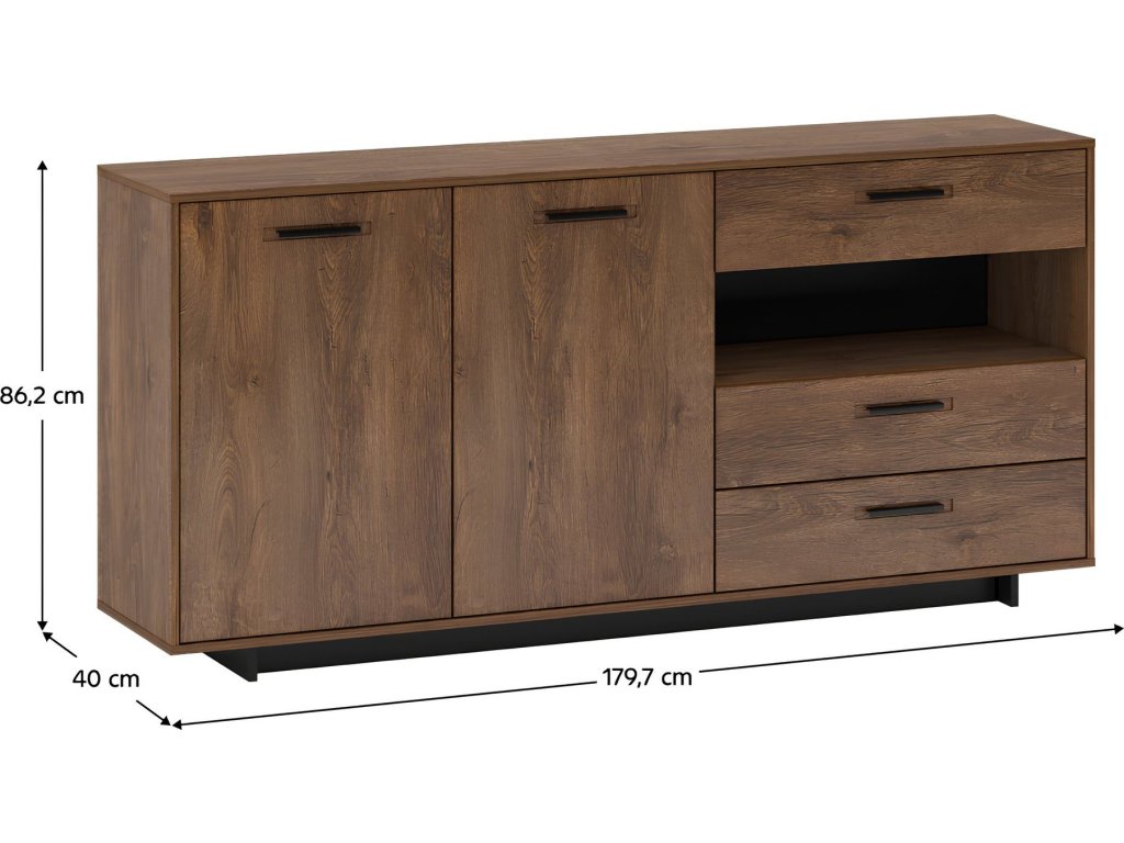 Materiál: DTD laminovaná / MDF Barva: dub bolzano / černá Rozměry (ŠxHxV): 179,7x40x86,2 cm Tloušťka materiálu: 16 mm 1 dvoudveřová skříňka s policemi 3 zásuvky Otevřený úložný prostor na podstavci Výška spodního prostoru od podlahy: 5 cm kovové úchytky originální design Krásná kresba dřeva Do tradičního i moderního interiéru Do obývacího pokoje, pracovny i studentského pokoje Dodávána v demontu