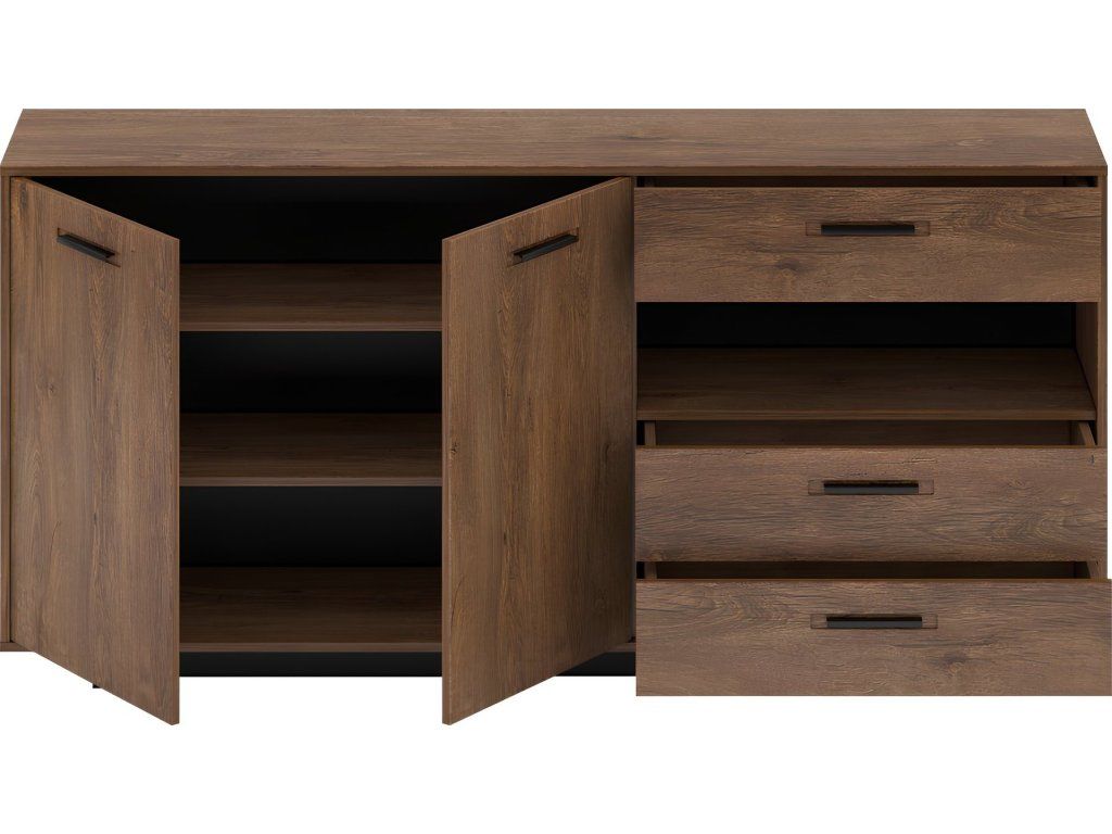 Materiál: DTD laminovaná / MDF fóliovaná Barva: dub bolzano / černá Rozměry (ŠxHxV): 179,7x40x86,2 cm Tloušťka materiálu: 16 mm 1 dvoudveřová skříňka s policemi 3 zásuvky Otevřený úložný prostor na podstavci Výška spodního prostoru od podlahy: 5 cm kovové úchytky originální design Krásná kresba dřeva Do tradičního i moderního interiéru Do obývacího pokoje, pracovny i studentského pokoje Dodávána v demontu