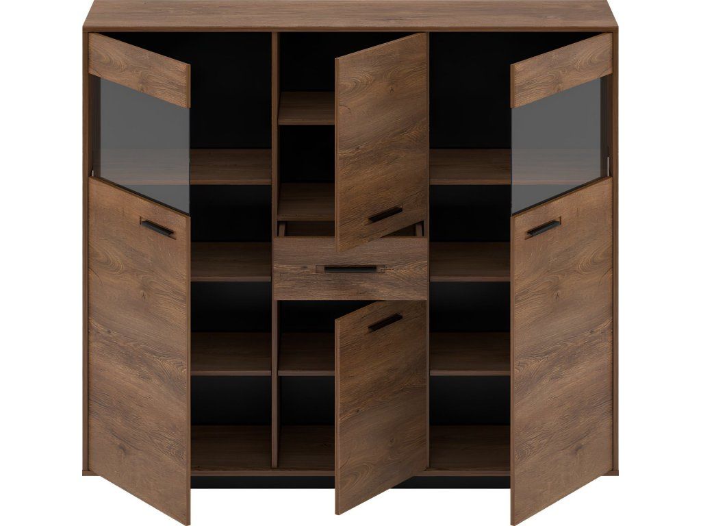 Materiál: DTD laminovaná / MDF fóliovaná/ sklo Barva: dub bolzano / černá Rozměry (ŠxHxV): 158,2x40x140 cm Tloušťka materiálu: 16 mm čtyřdveřová komoda policová 1 zásuvka na podstavci Výška spodního prostoru od podlahy: 5 cm kovová úchytka Bez LED osvětlení Možnost dokoupit LED osvětlení v bílé barvě originální design Krásná kresba dřeva Do tradičního i moderního interiéru Do obývacího pokoje, pracovny i studentského pokoje Dodávána v demontu