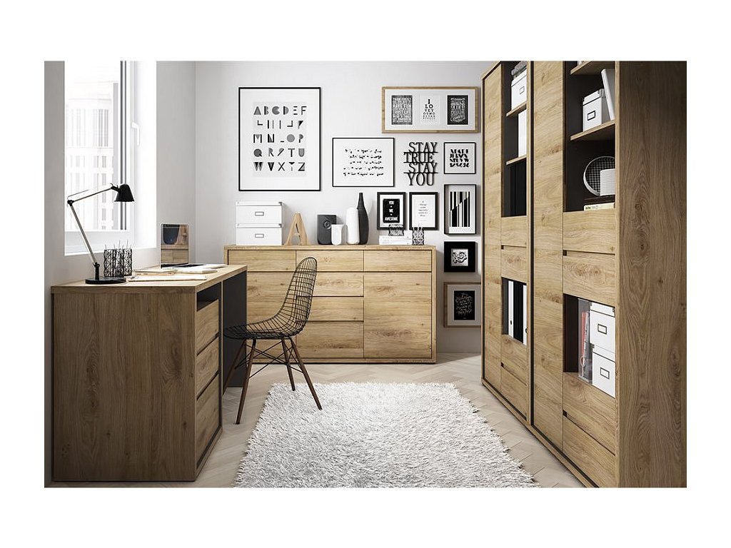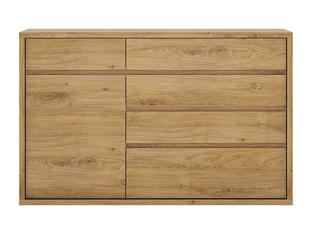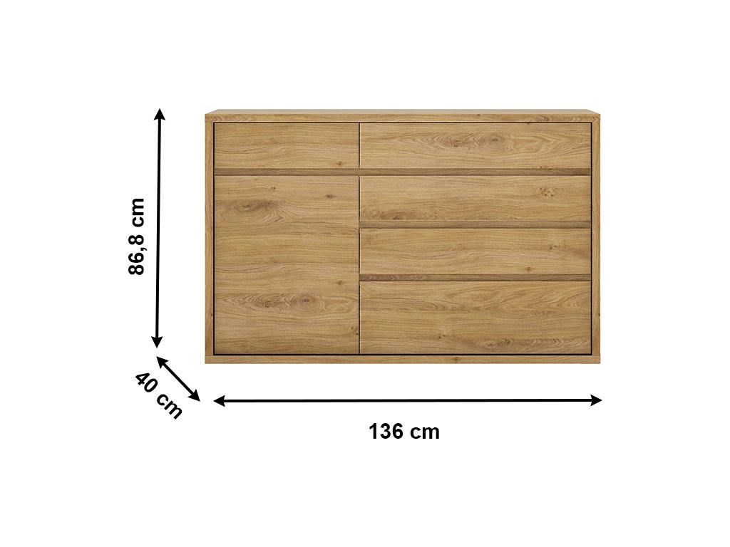 Materiál: laminovaná DTD Barevné provedení: dub Shetland/šedá Rozměry (ŠxHxV): 136x40x86,8 cm Tloušťka korpusu: 2,8 cm bez úchytová Jednoduchá a elegantní hrubý korpus 5 šuplíků 1 poličky 1 jednodveřová skříňka moderní styl vysoká kvalita precizní zpracování Odolná vůči poškrábání, UV záření, vysokým teplotám Nosnost poličky: 5 kg Nosnost šuplíku: 5 kg Dodávané v demontu