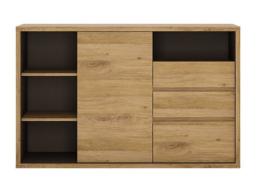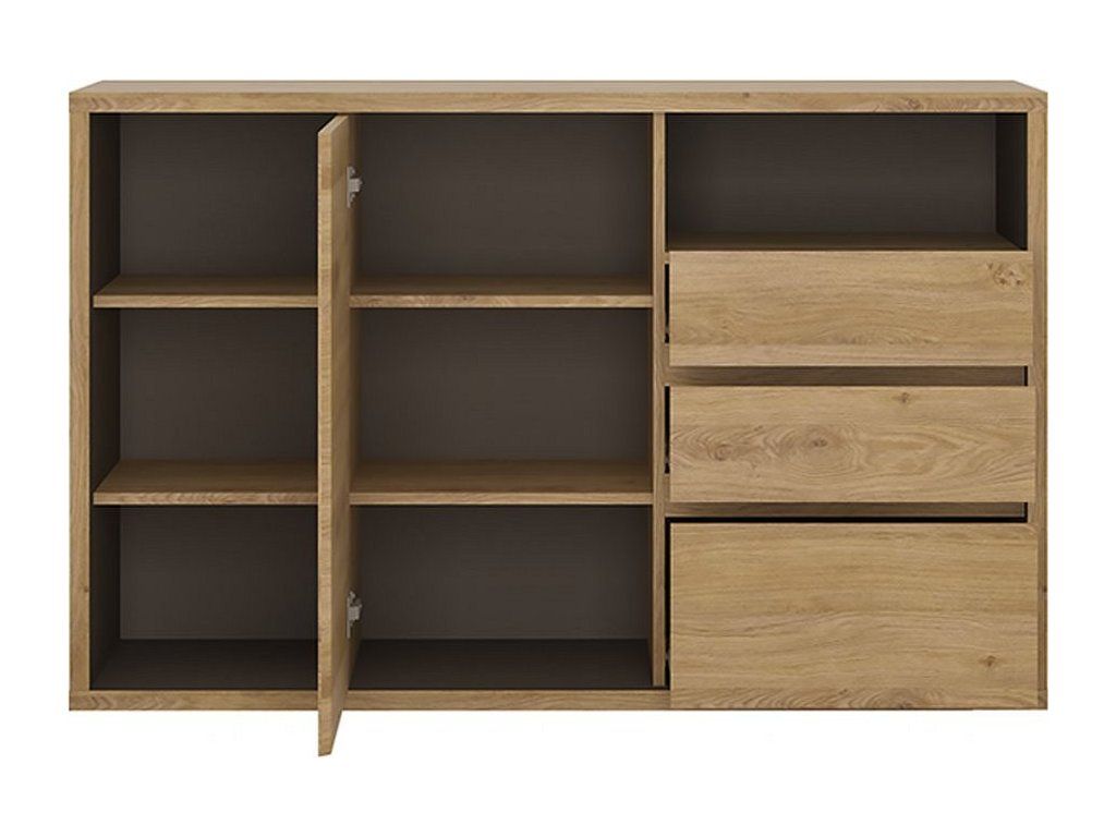 Materiál: laminovaná DTD Barevné provedení: dub Shetland/šedá Rozměry (ŠxHxV): 136x40x86,8 cm Tloušťka korpusu: 2,8 cm bez úchytová Jednoduchá a elegantní hrubý korpus 3 šuplíky 4 poličky 1 jednodveřová skříňka 1 otevřená skříňka moderní styl vysoká kvalita precizní zpracování Odolná vůči poškrábání, UV záření, vysokým teplotám Nosnost poličky: 5 kg Nosnost šuplíku: 5 kg Dodávané v demontu