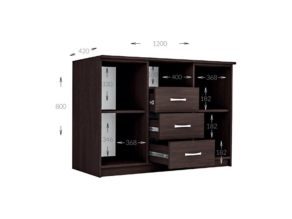 Komoda dvoudveřová se třemi zásuvkami je vyrobená z kvalitní laminátové desky v barevném provedení wenge. Úchyty jsou kovové. Dodáváme v demontovaném stavu.Doplňkové parametry