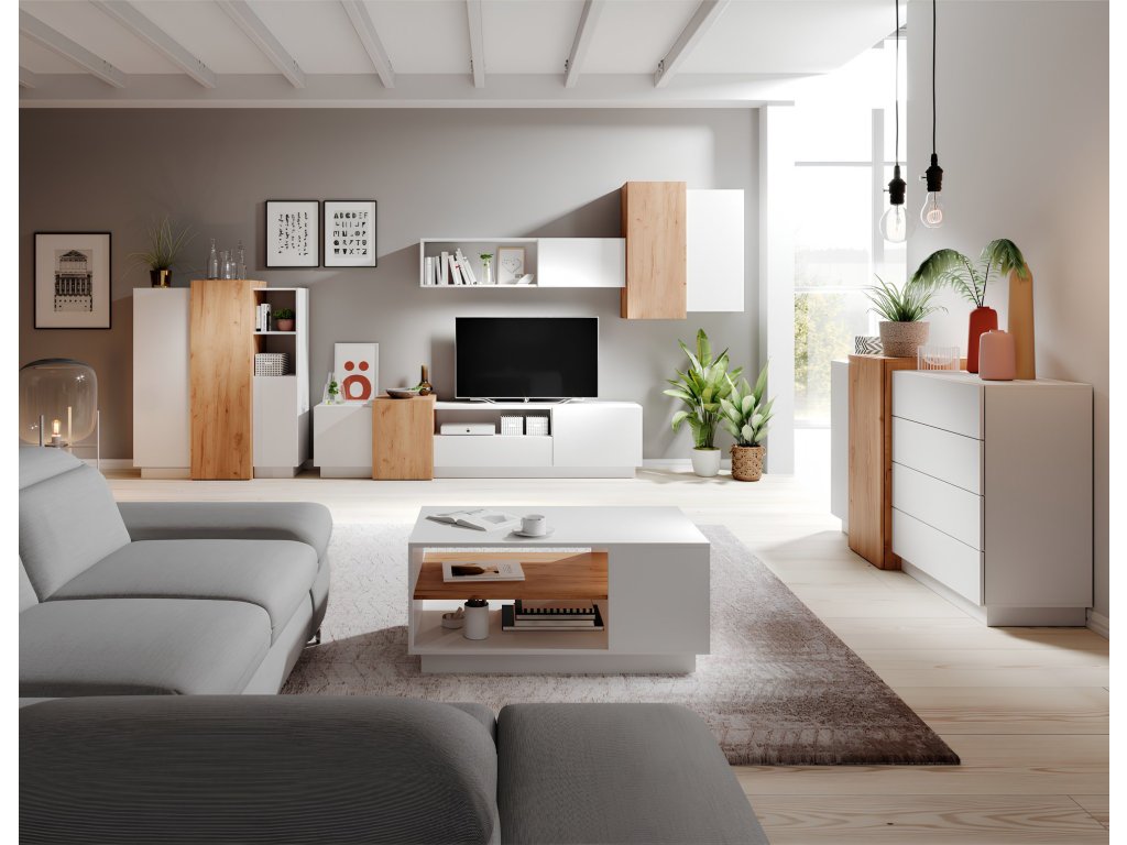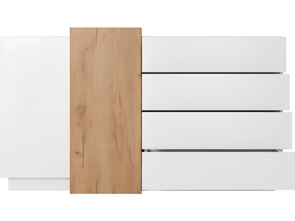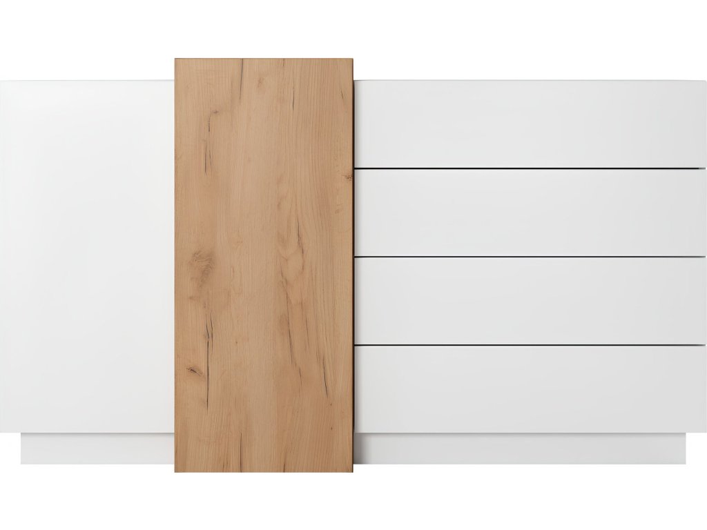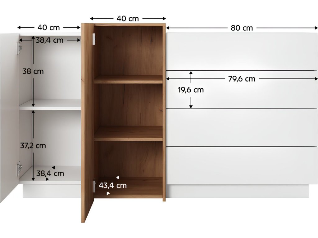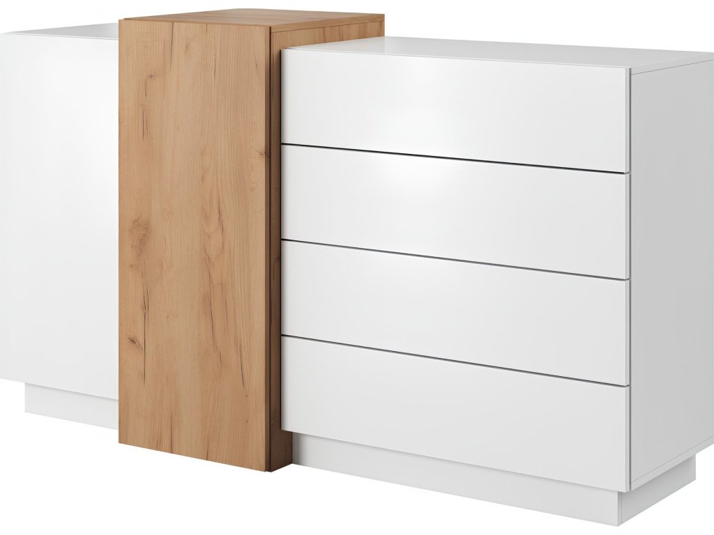 Materiál: DTD laminovaná / ABS hrany Barva: bílá / dub craft zlatý Rozměry (ŠxHxV): 160x45x93,5 cm Hloubka užší skříňky a šuplíkové části: 40,4 cm Výška užší skříňky a šuplíkové části: 88,5 cm Šířka skříněk: 40 cm Šířka šuplíkové části: 80 cm Rozměry šuplíku (ŠxHxV): 79,6x33,4x19,6 cm dvoudveřová čtyři šuplíky S dotykovým systémem PUSH UP designová Dodávané v demontu