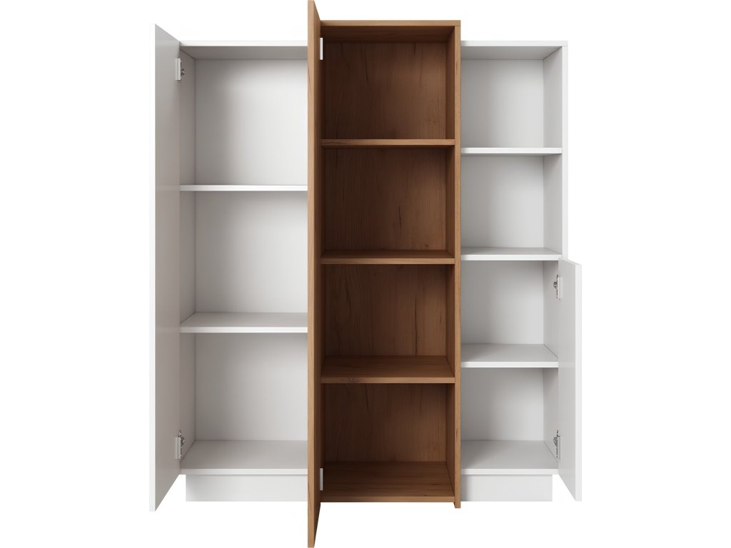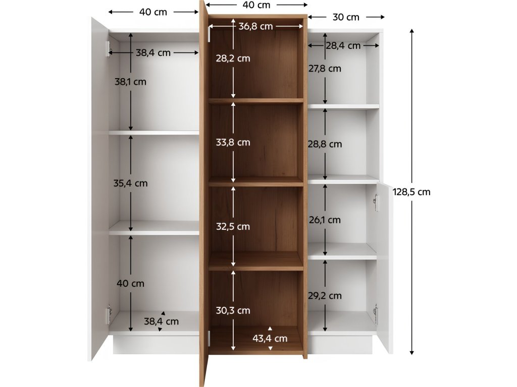 Materiál: DTD laminovaná / ABS hrany Barva: bílá / dub craft zlatý Rozměry (ŠxHxV): 110x45x133,5 cm Šířka pravé úzké a střední vyšší skříňky: 40 cm Šířka levé úzké skříňky: 30 cm Výška užších skříněk: 128,5 cm Výška střední skříňky: 133,5 cm Hloubka užších skříněk: 40,4 cm Hloubka střední skříňky: 45,4 cm Rozměry šuplíku (ŠxHxV): 79,6x33,4x19,6 cm třídveřová Otevřený úložný prostor S dotykovým systémem PUSH UP designová Dodávané v demontu