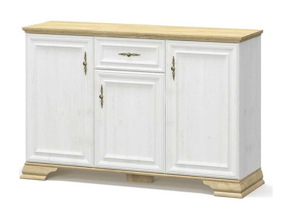 Komoda třídveřová se zásuvkou ze sektorové řady nábytku v romantickém stylu. Nábytek je vyroben z kvalitní LTD v kombinaci s MDF v barevné kombinaci borovice andersen/zlatý dub. V naší nabídce najdete další jednotlivé prvky tohoto nábytku, ze kterého si můžete zařídit obývací pokoj dle vlastních potřeb. Dodáváme v demontovaném stavu.Doplňkové parametry