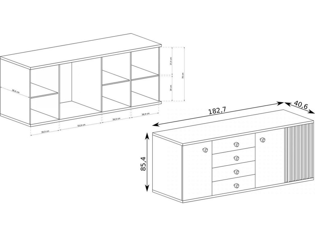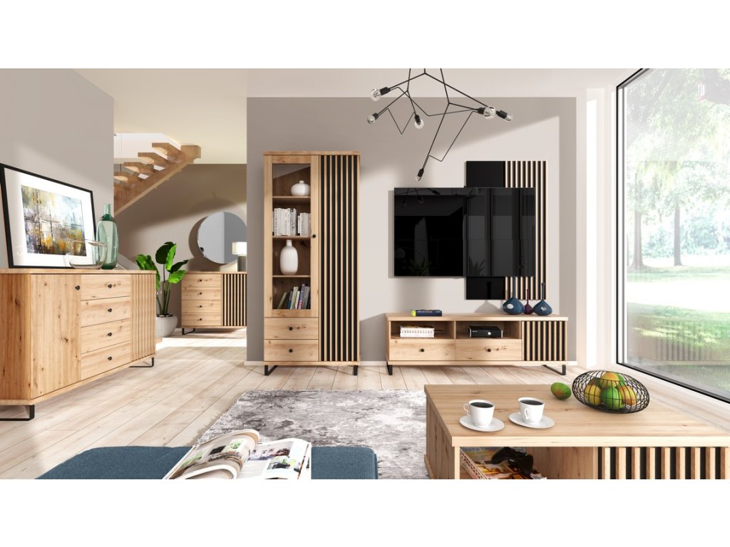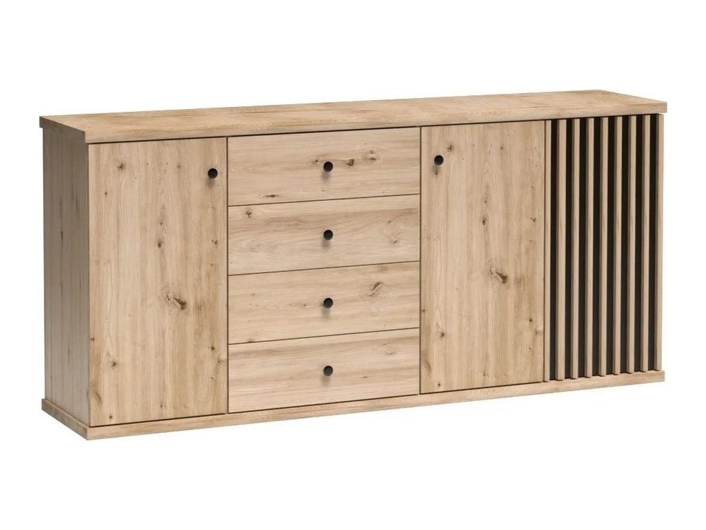 Komoda třídveřová se čtyřmi zásuvkami s netradičním provedením detailu dvířek s lamelami. Kolekce nábytku v sobě spojuje jednoduchost, originální vzhled a funkčnost. Barevné provedení je v kombinaci dub artisan/černá mat. Nábytek je vyroben z kvalitního lamina ohraničeného ABS páskou, dekorační lamely jsou vyrobeny z desky MDF. Zásuvky jsou vybaveny kovovými pojezdy se systémem tichého dovírání. Kolekce se skládá z mnoha prvků a tento široký výběr Vám zaručí sestavit si nábytek podle svých vlastních představ a přání. Dodáváme v demontovaném stavu.Doplňkové parametry