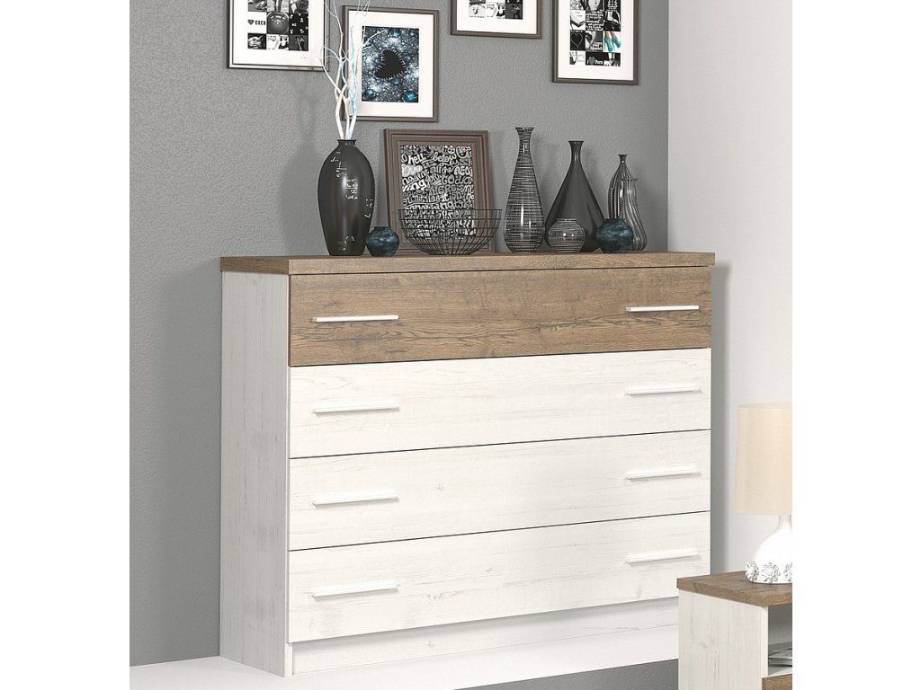 Komoda se 4 zásuvkami z ložnicové řady. Moderní provedení v barvě borovice andersen v kombinaci s dubem april dokonale doplní váš interiér. Komoda je vyrobena z kvalitní LTD desky. Nabídka komponentů této sektorové řady umožňuje sestavit si nábytek do ložnice nebo studentského pokoje dle vlastních představ. Dodáváme v demontovaném stavu.Doplňkové parametry