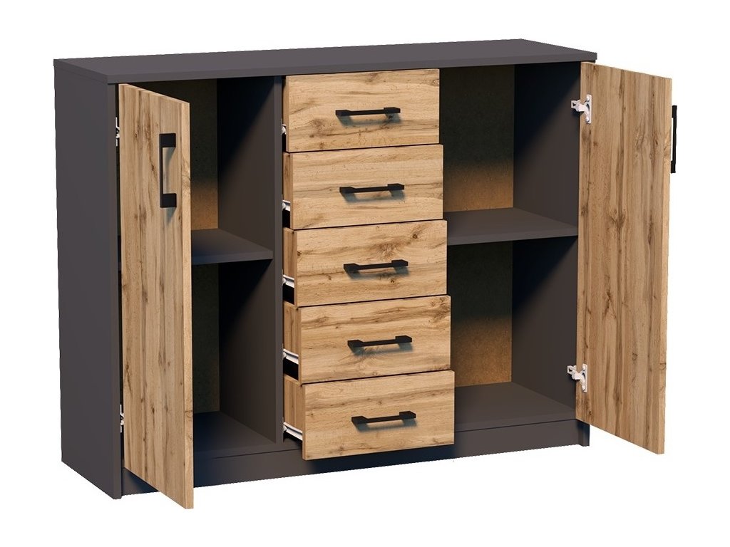 Dvoudveřová komoda s 5 zásuvkami v moderním provedení. Korpus i dvířka jsou z kvalitní LTD, korpus v barvě grafit a dvířka v barvě dub wotan. Lamino je odolné vůči vysokým teplotám, poškrábání a nárazům, hraněné ABS páskou. Jasně viditelná struktura dřeva. Pojezdy v zásuvkách jsou kovové s plastovými kolečky. Dodáváme v demontovaném stavu.Doplňkové parametry