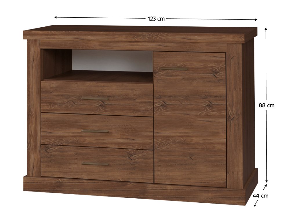 Materiál: DTD laminovaná / ABS hrany Barva: dub stirling Rozměry (ŠxHxV): 123x44x88 cm Tloušťka materiálu: 50 mm 3D efekt kovové úchytky ABS hrany tři šuplíky skříňka otevřený prostor Dodávané v demontu