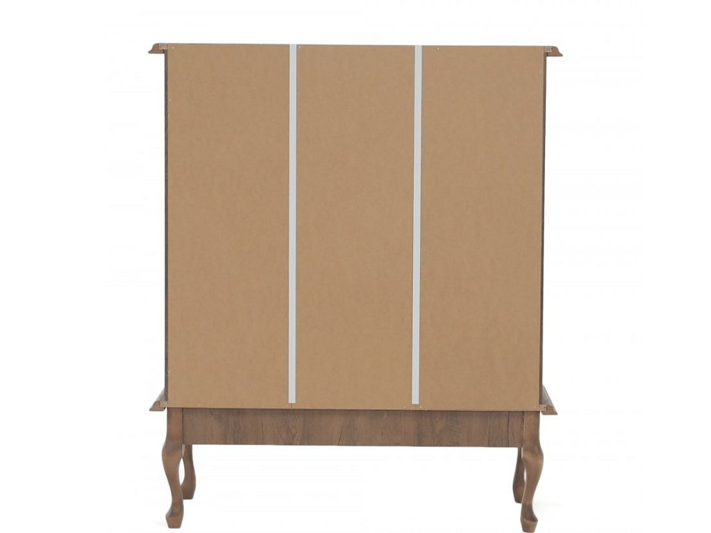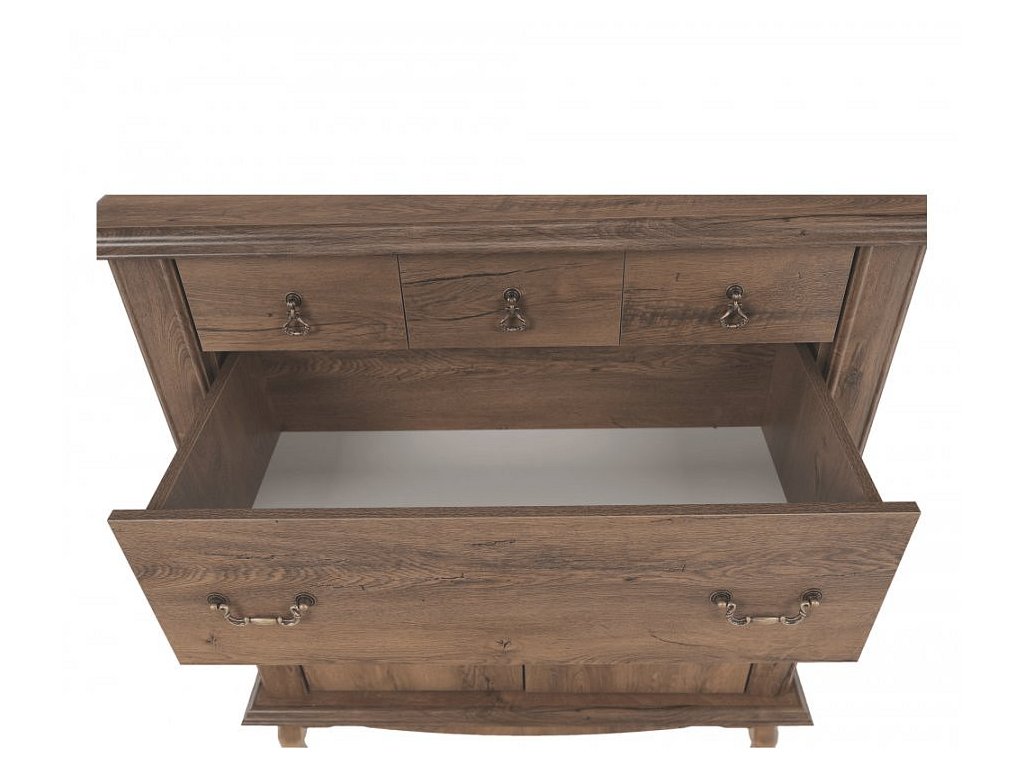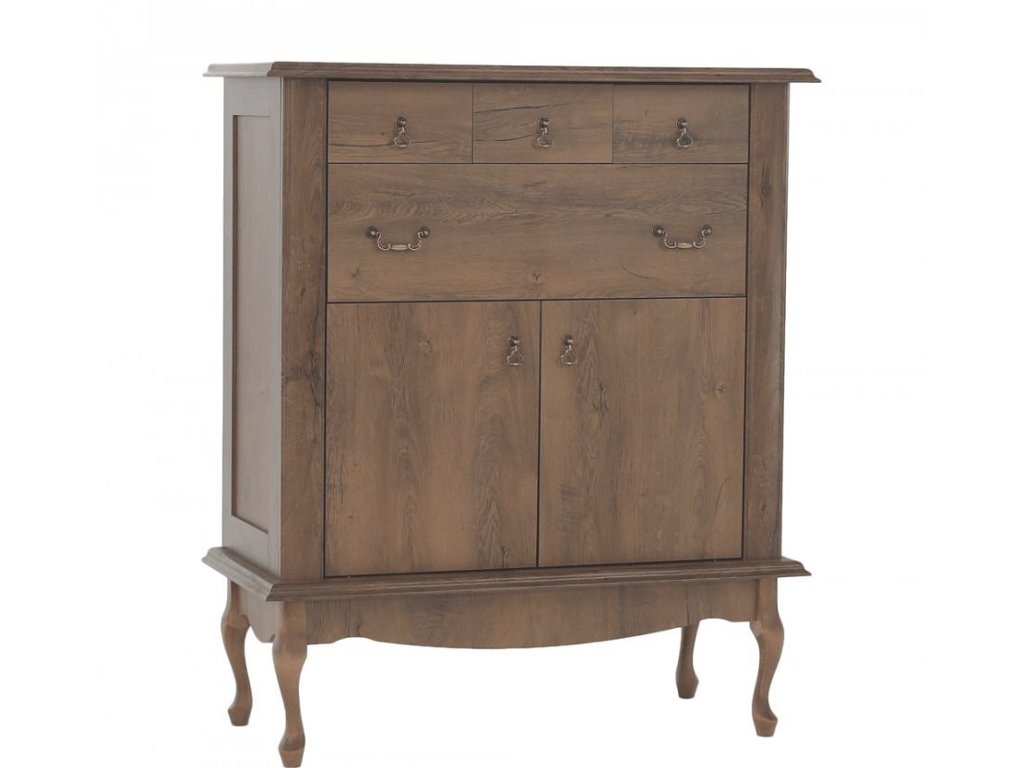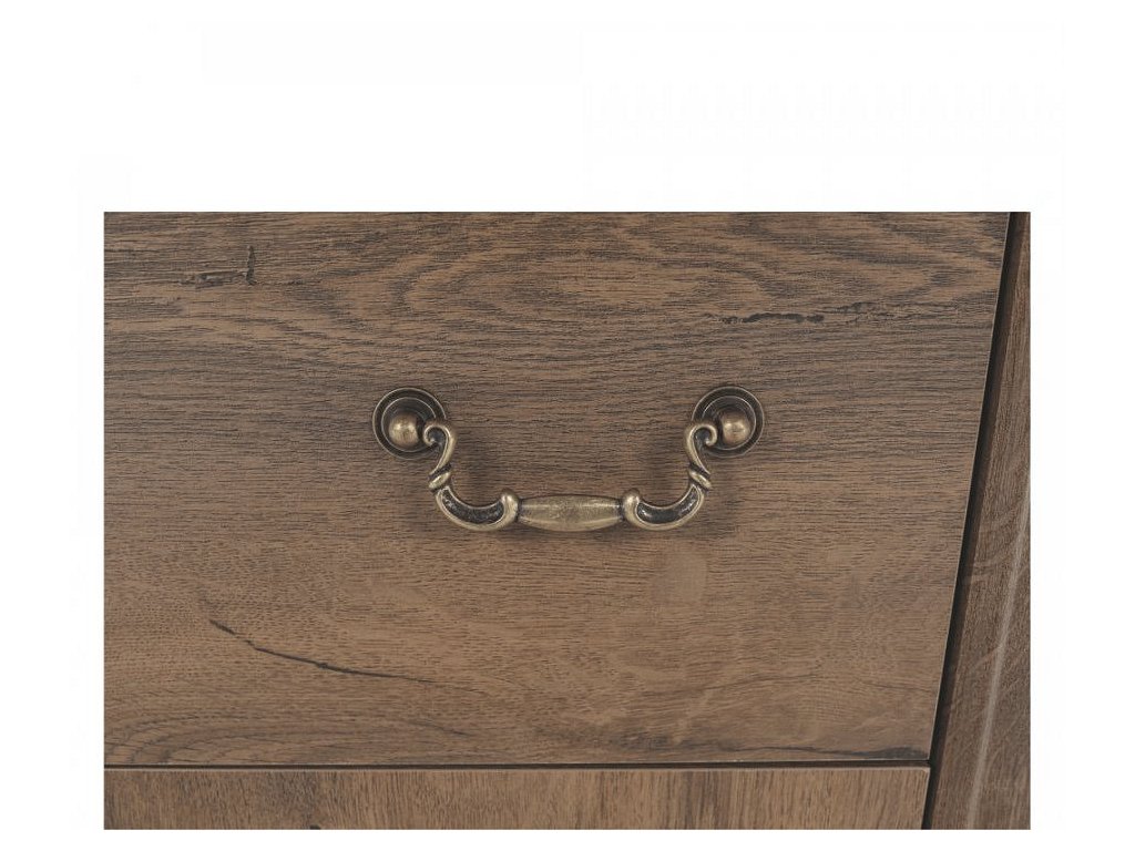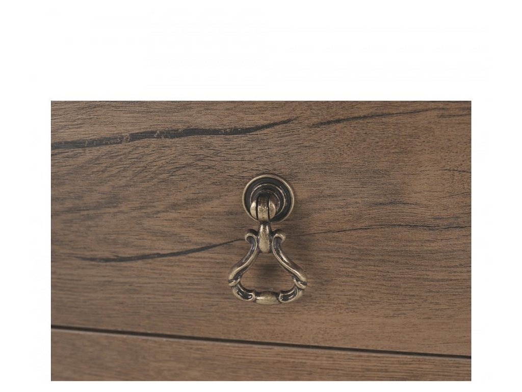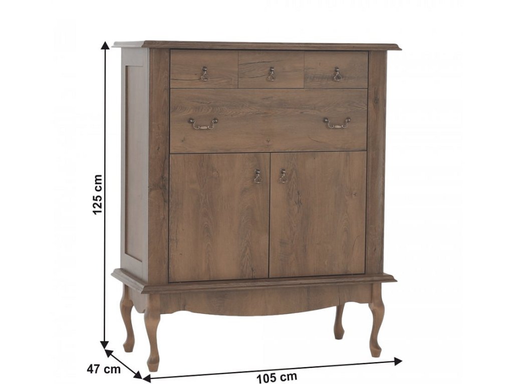 Materiál: DTD laminovaná / ABS hrany Barva: dub lefkas Rozměry (ŠxHxV): 105x47x125 cm Výška spodního prostoru od podlahy: 25 cm Tloušťka materiálu: 30 mm čtyři šuplíky 3D efekt kovové úchytky Dřevěné nožičky ABS hrany barokní styl
