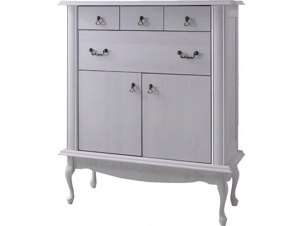 Materiál: DTD laminovaná / ABS hrany Barva: sosna bílá Rozměry (ŠxHxV): 105x47x125 cm Výška spodního prostoru od podlahy: 25 cm Tloušťka materiálu: 30 mm čtyři šuplíky 3D efekt kovové úchytky Dřevěné nožičky ABS hrany barokní styl