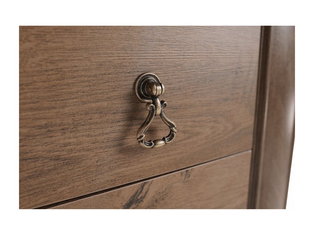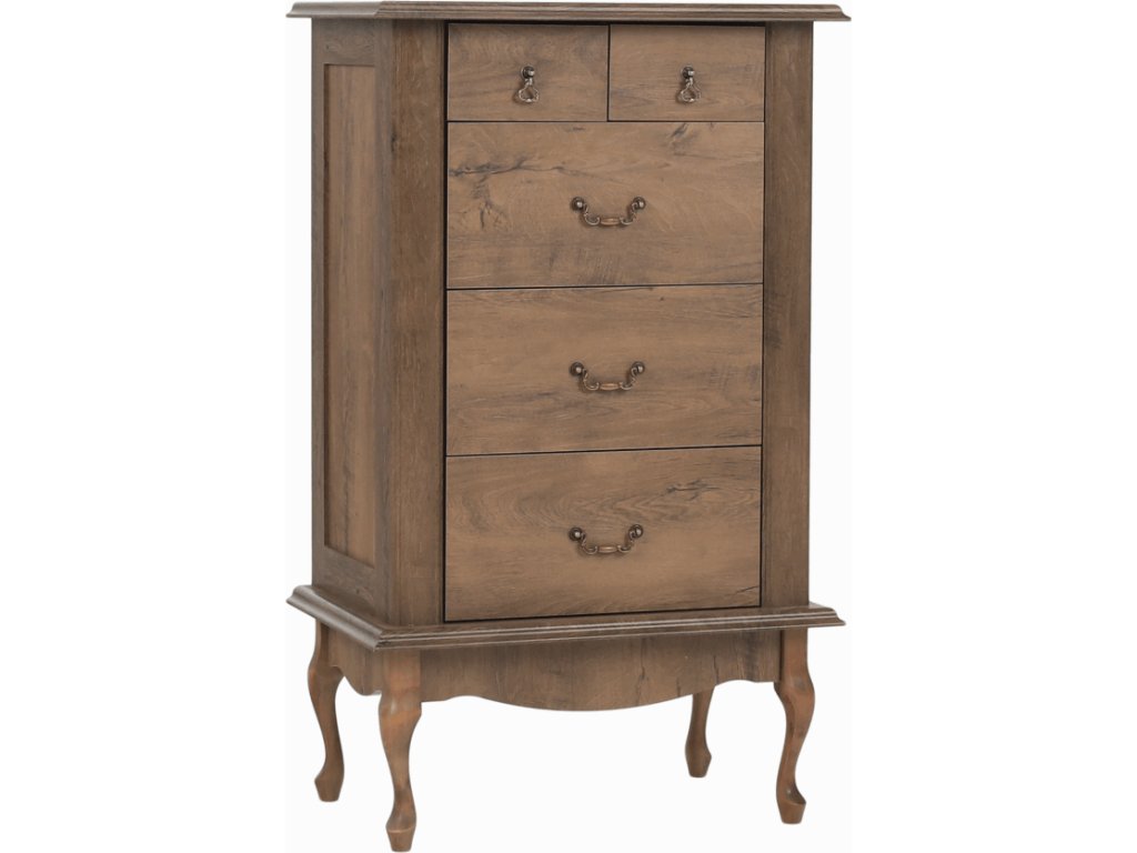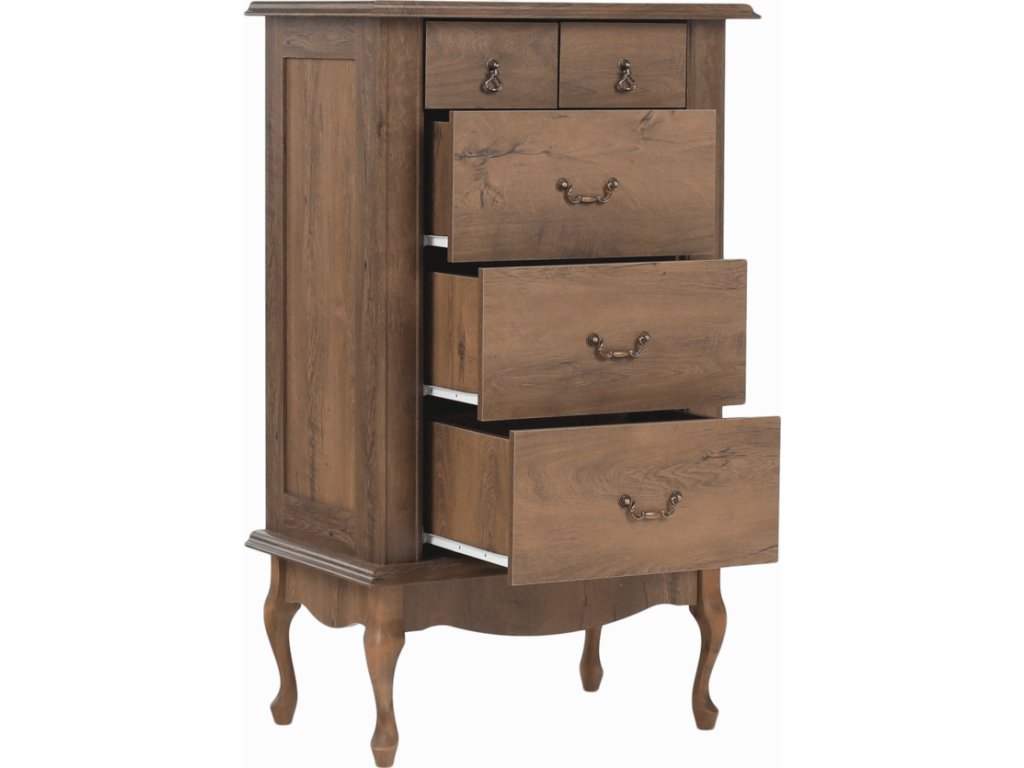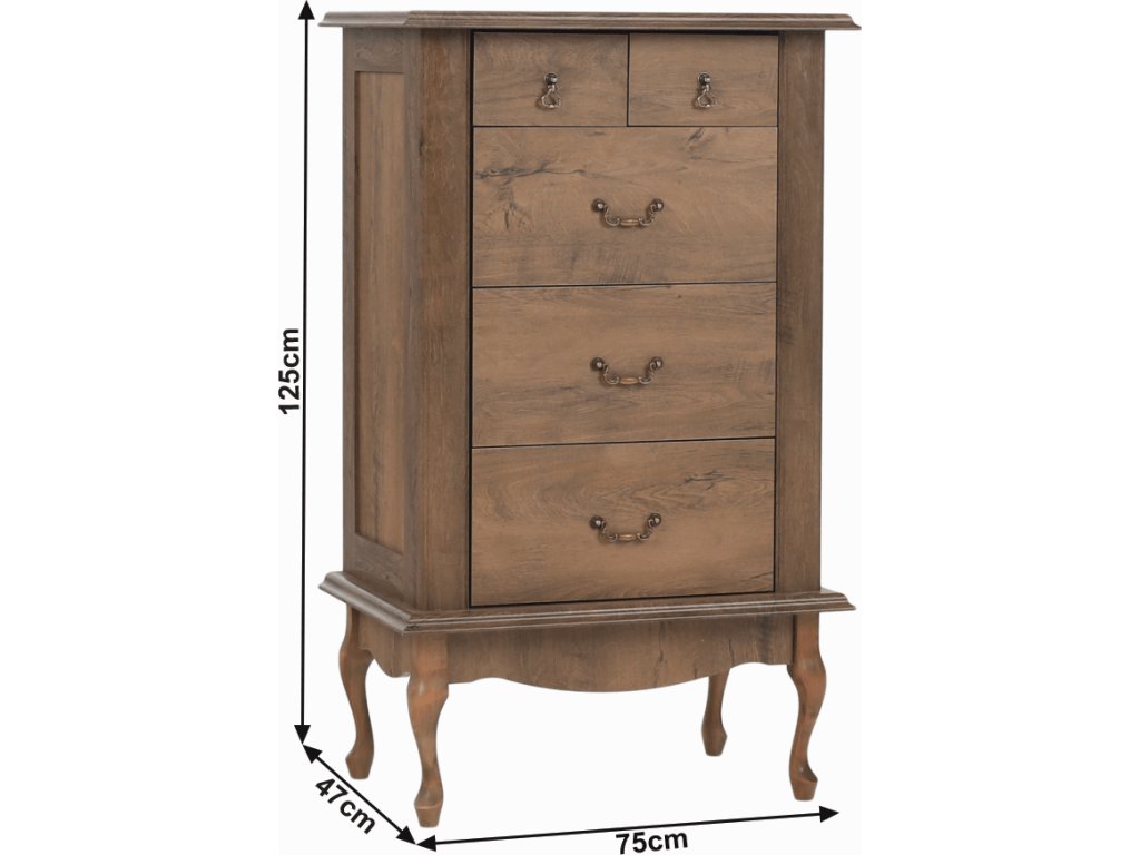 Materiál: DTD laminovaná / ABS hrany Barva: dub lefkas Rozměry (ŠxHxV): 75x47x125 cm Výška spodního prostoru od podlahy: 25 cm Tloušťka materiálu: 30 mm Pět šuplíků 3D efekt kovové úchytky Dřevěné nožičky ABS hrany barokní styl