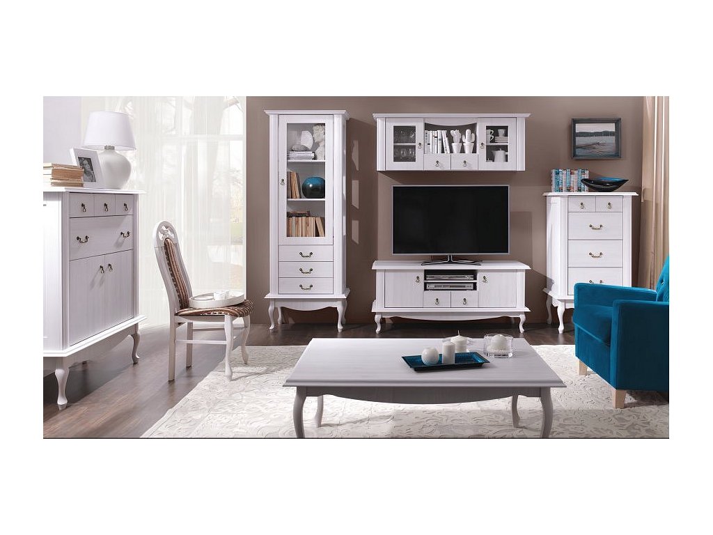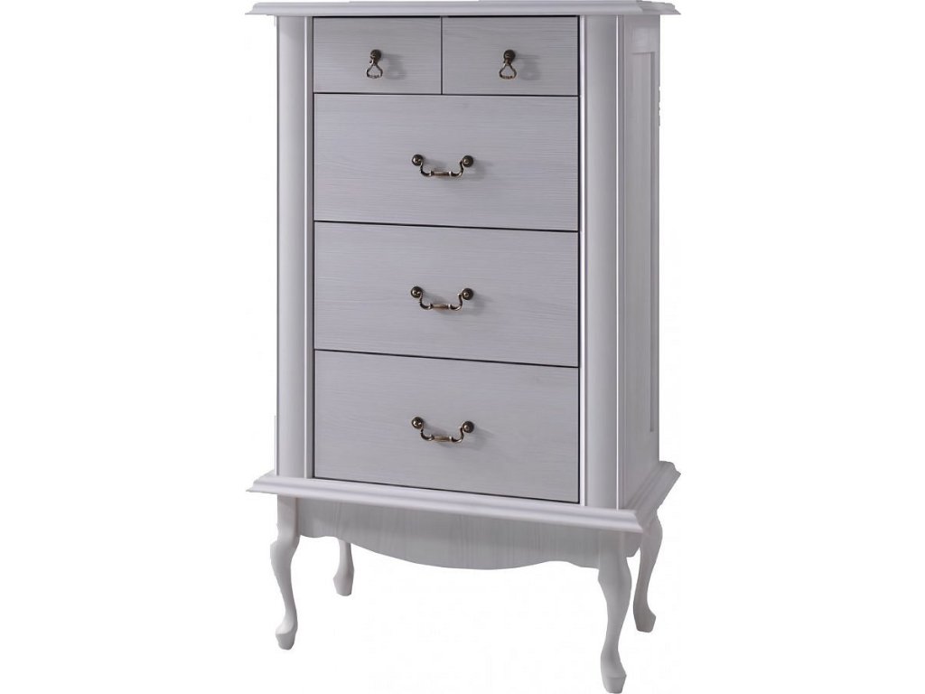 Materiál: DTD laminovaná / ABS hrany Barva: sosna bílá Rozměry (ŠxHxV): 75x47x125 cm Výška spodního prostoru od podlahy: 25 cm Tloušťka materiálu: 30 mm Pět šuplíků 3D efekt kovové úchytky Dřevěné nožičky ABS hrany barokní styl