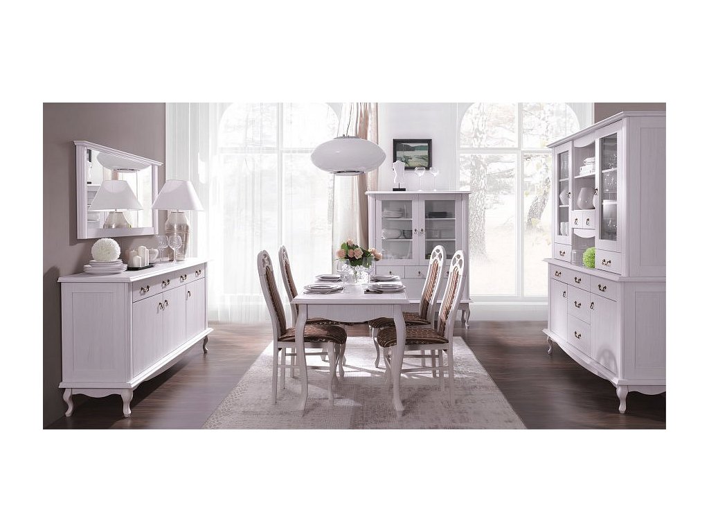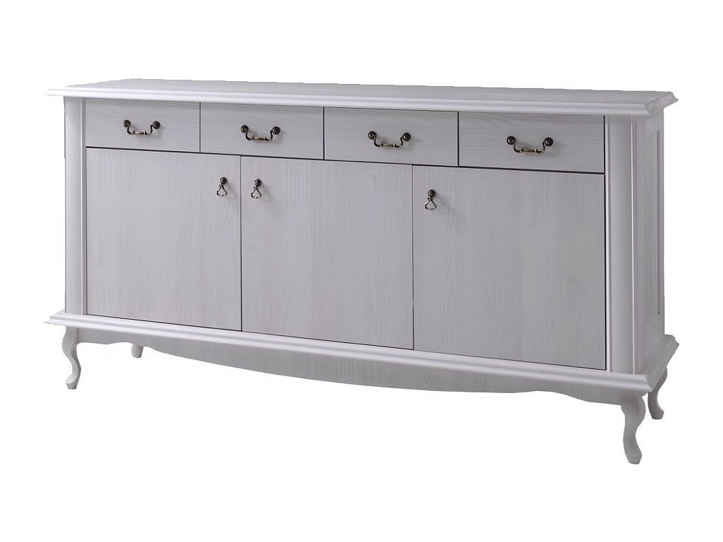 Materiál: DTD laminovaná / ABS hrany Barva: sosna bílá Rozměry (ŠxHxV): 175x47x89 cm Výška spodního prostoru od podlahy: 15 cm Tloušťka materiálu: 30 mm dvě skříňky čtyři šuplíky 3D efekt kovové úchytky Dřevěné nožičky ABS hrany barokní styl