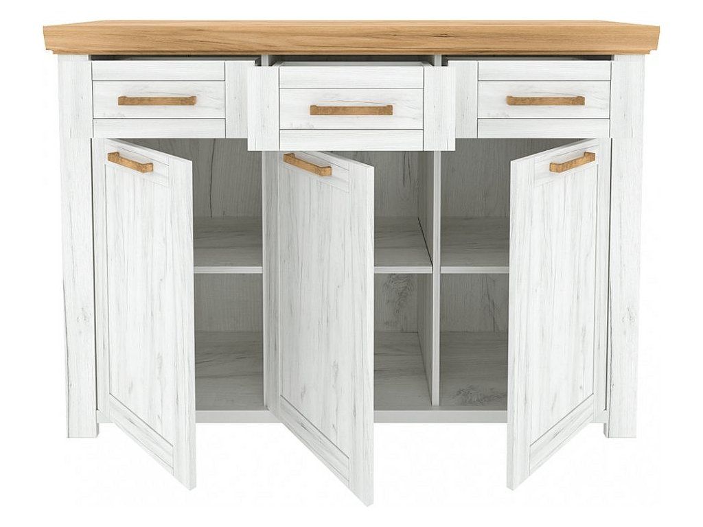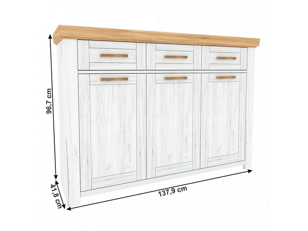 Materiál: DTD laminovaná / MDF laminovaná Barva: dub craft zlatý / dub craft bílý Rozměry (ŠxHxV): 137,9x41,8x96,7 cm Tloušťka materiálu korpus: 16 mm Tloušťka materiálu vrchní deska: 22 mm Tloušťka materiálu dvířka: 19 mm Výška spodního prostoru od podlahy je 4,2 cm tři šuplíky tři skříňky Dodávané v demontu