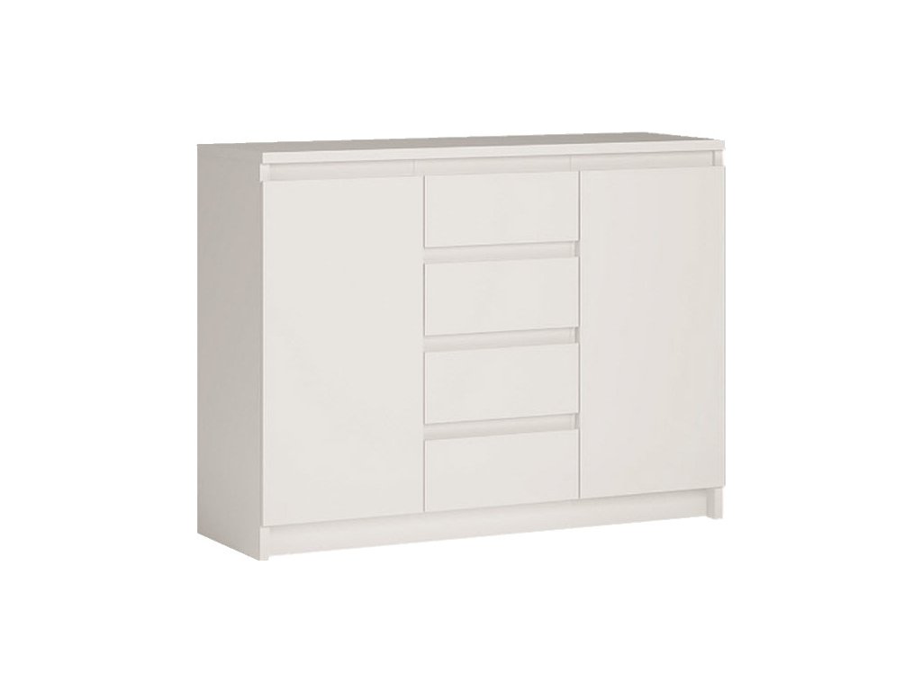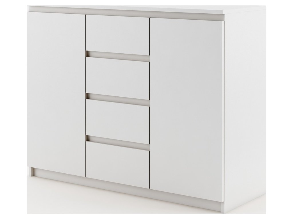 Dvoudveřová komoda se 4 zásuvkami v moderním provedení. Korpus i dvířka jsou z kvalitní LTD v bílé barvě. LTD je odolné vůči vysokým teplotám, poškrábání a nárazům, hraněné ABS páskou. Výhodou je i bezúchytový systém. Dodáváme v demontovaném stavu.Doplňkové parametry