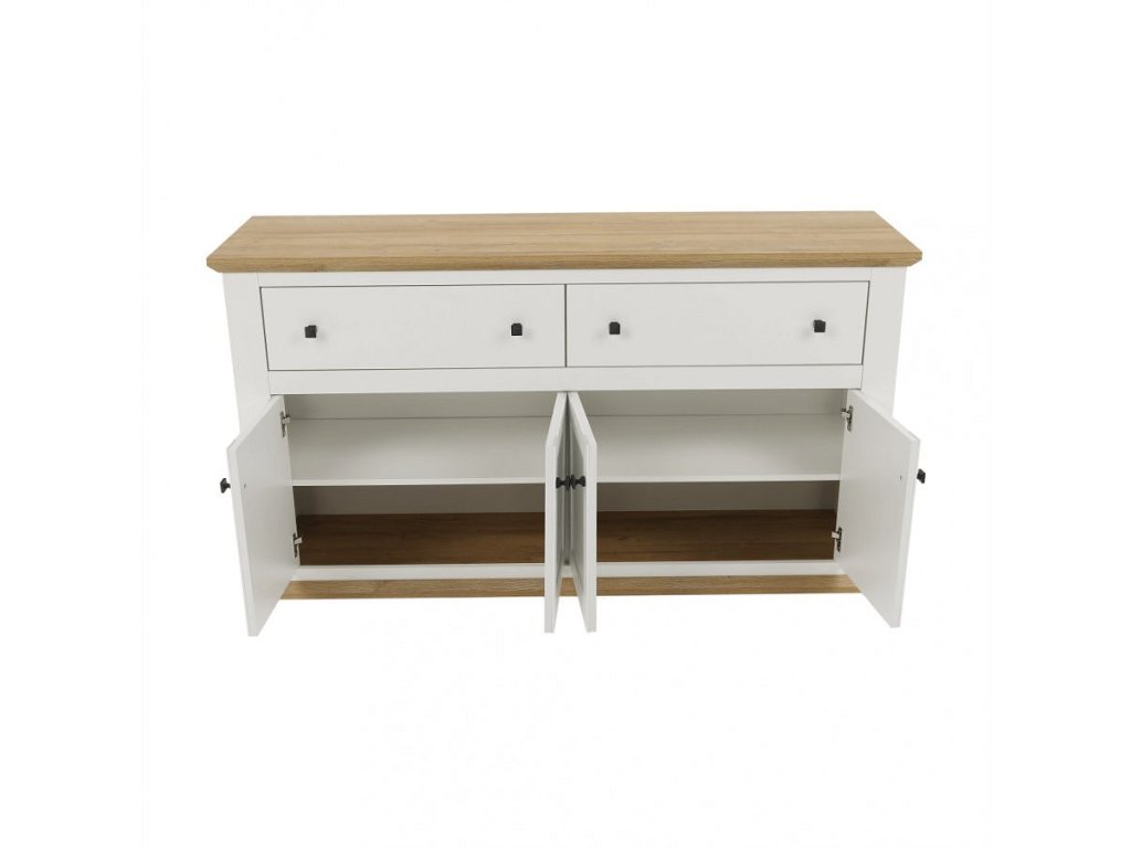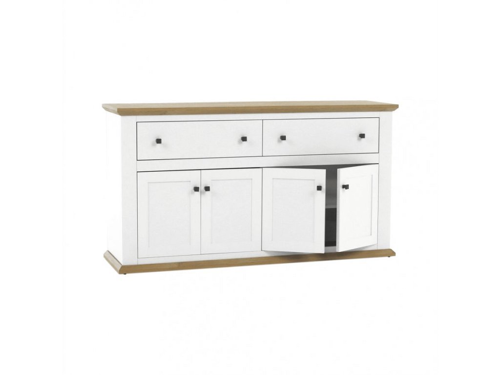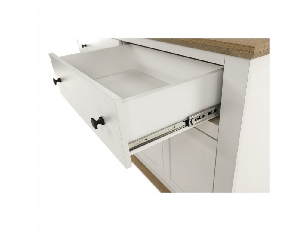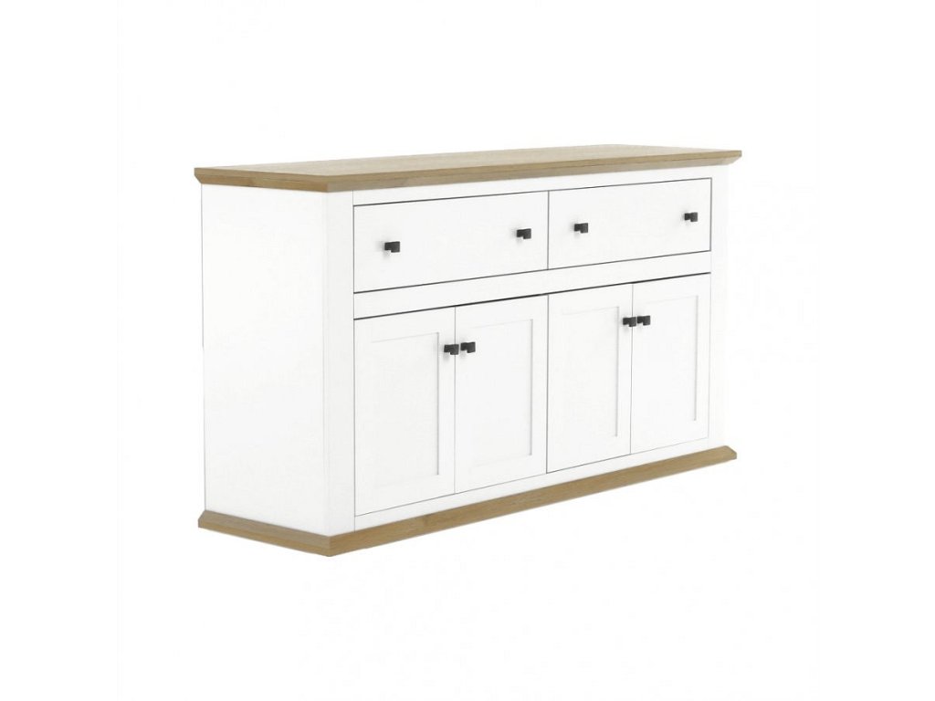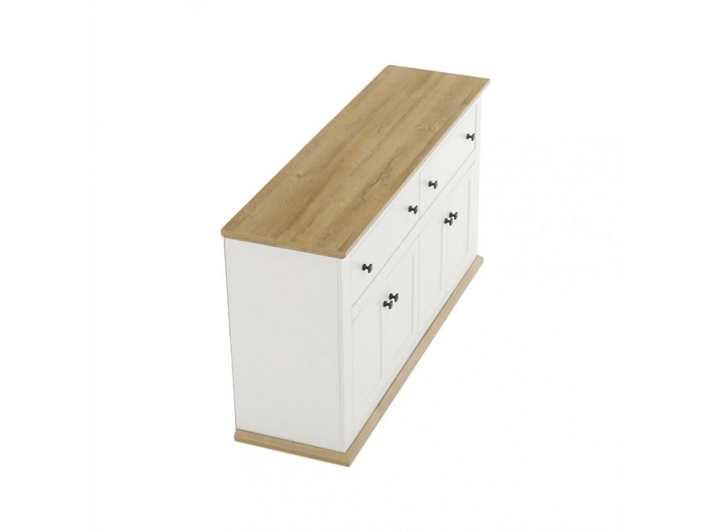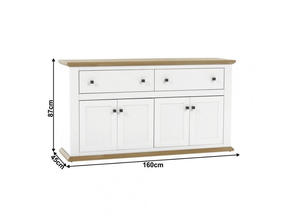 Materiál: DTD laminovaná / ABS hrany Barva: bílá / dub grand Rozměry (ŠxHxV): 160x45x87 cm Tloušťka materiálu: 40 mm čtyřdveřová čtyři skříňky dva šuplíky S úchytkami S 3D efektem elegantní V provensálském stylu kovové úchytky Dodávané v demontu
