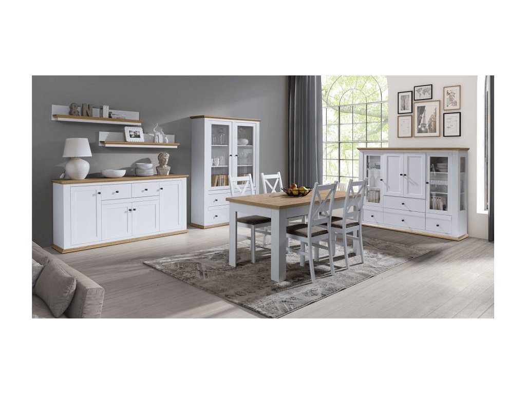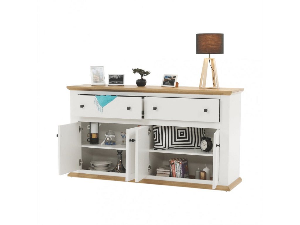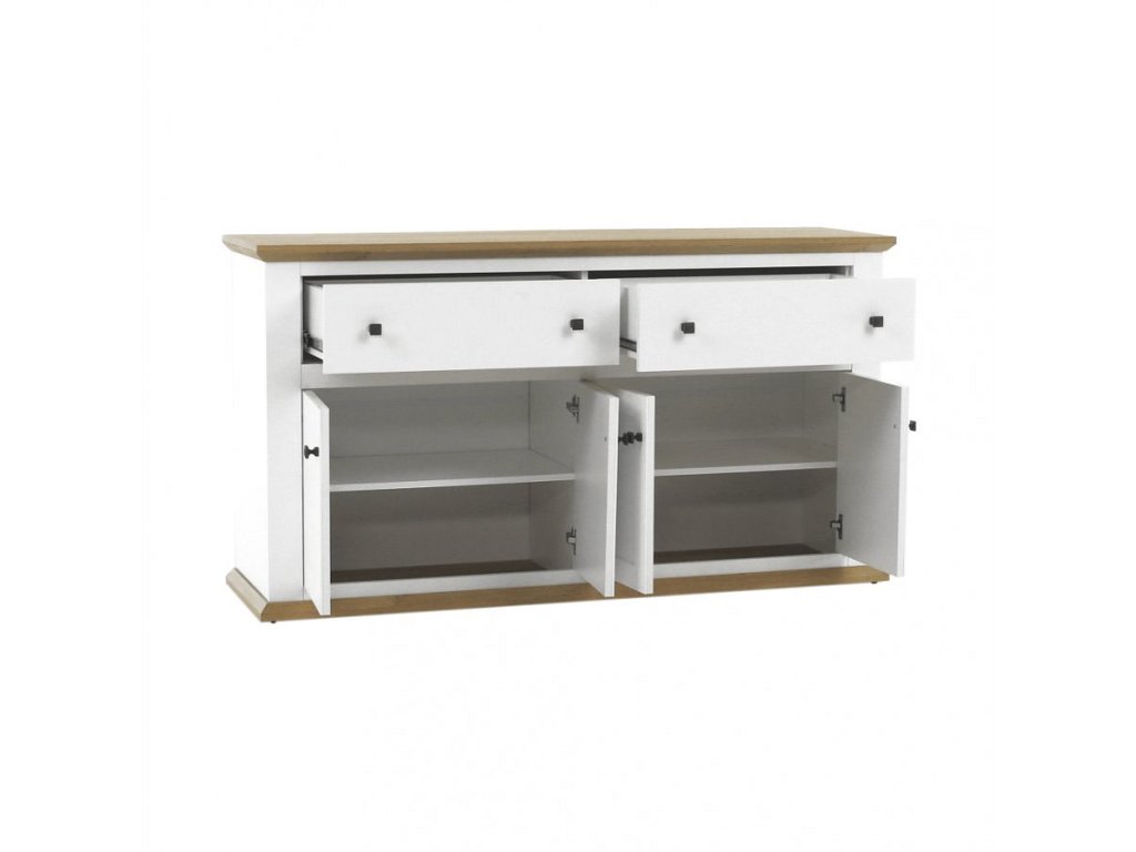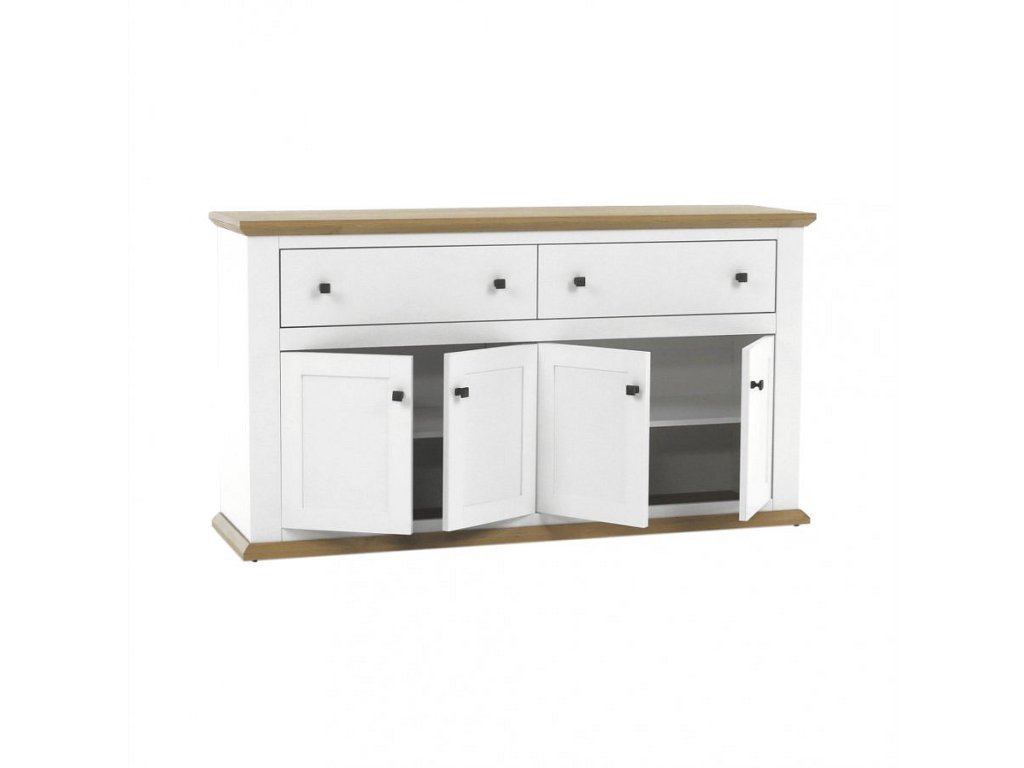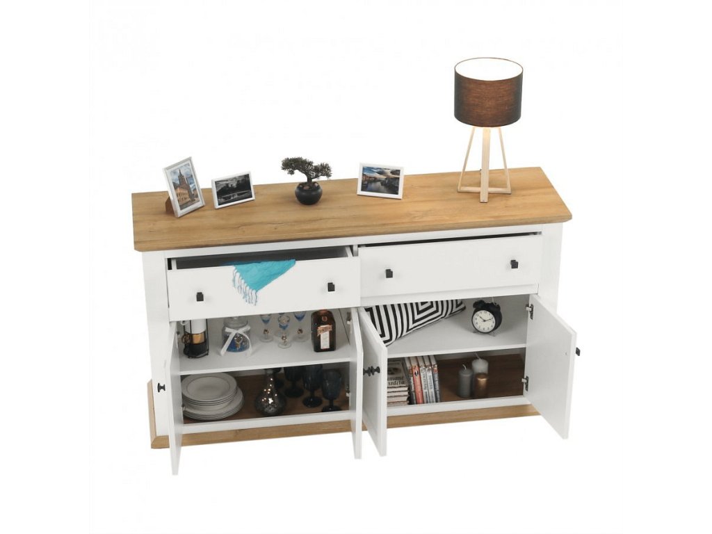 Materiál: DTD laminovaná / ABS hrany Barva: bílá / dub grand Rozměry (ŠxHxV): 160x45x87 cm Tloušťka materiálu: 40 mm čtyřdveřová čtyři skříňky dva šuplíky S úchytkami S 3D efektem elegantní V provensálském stylu kovové úchytky Dodávané v demontu