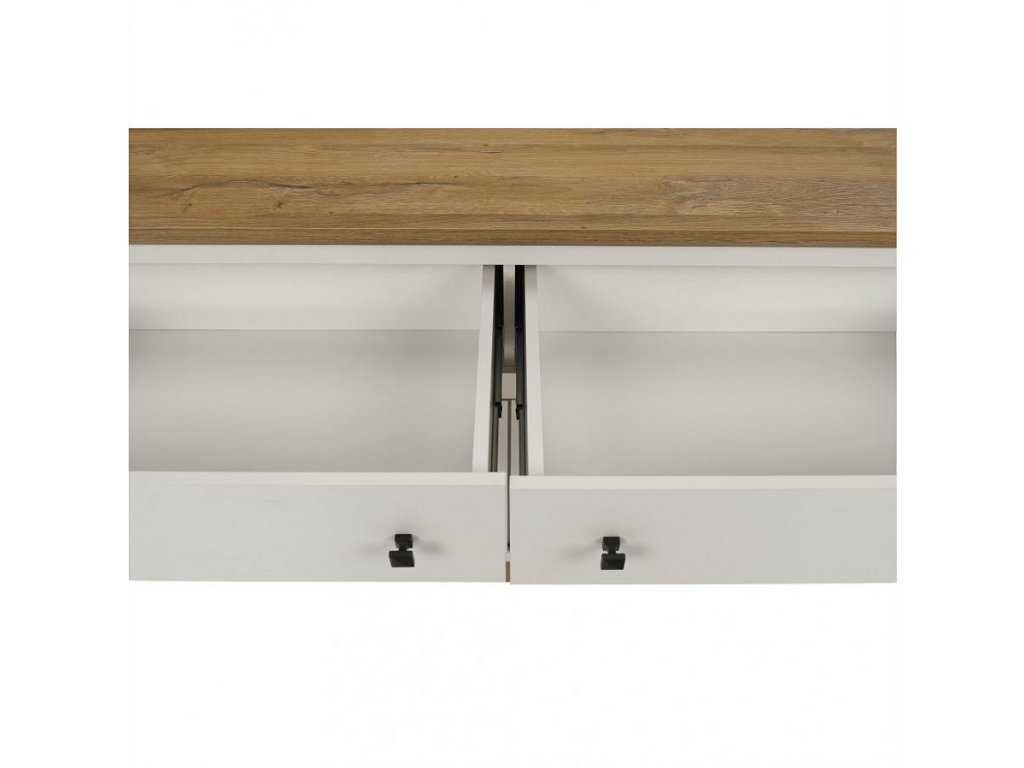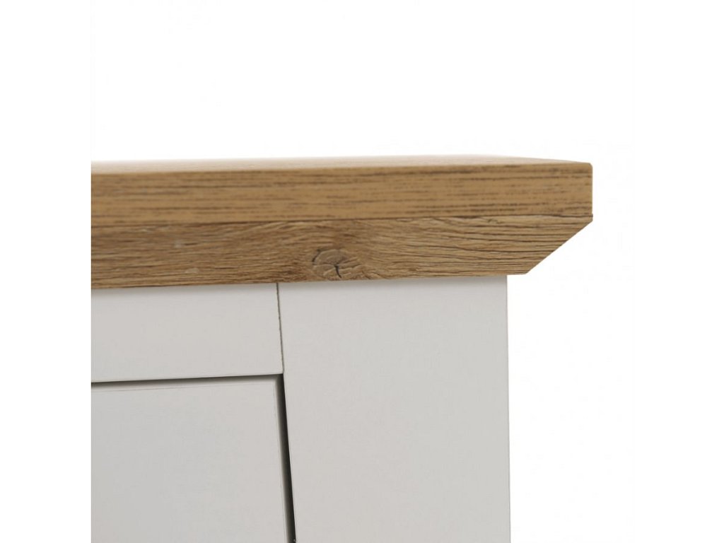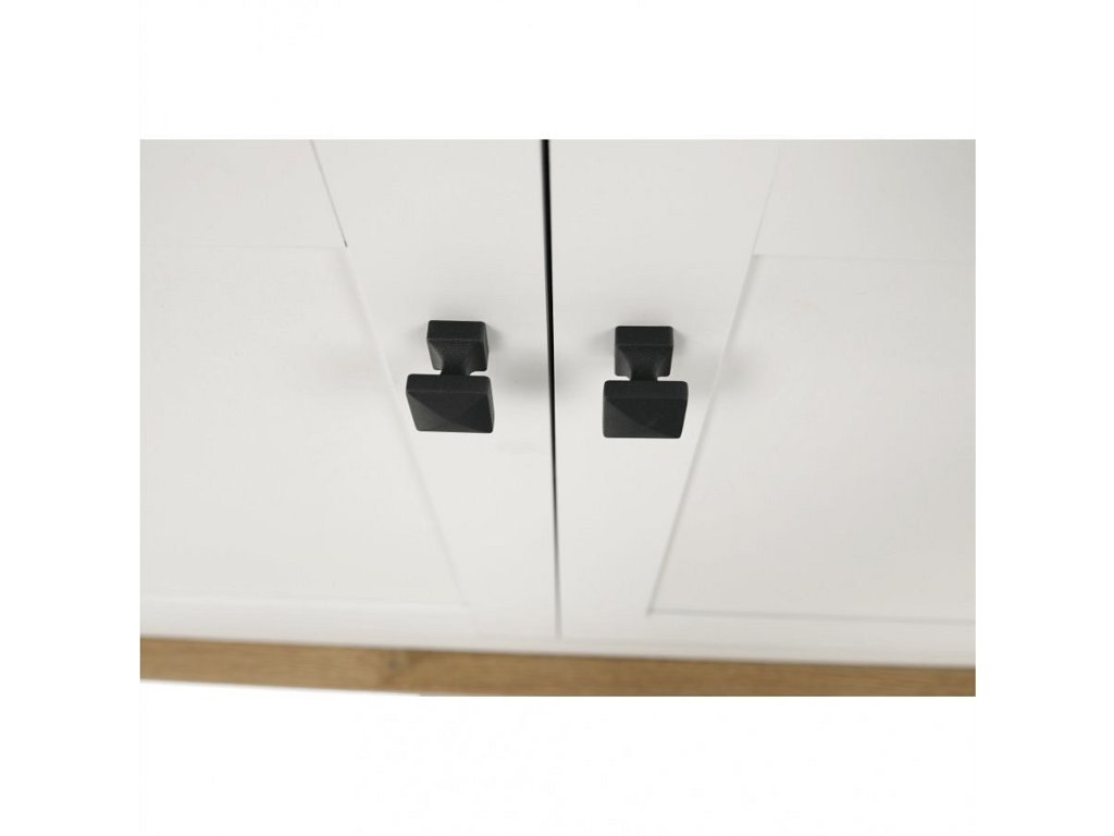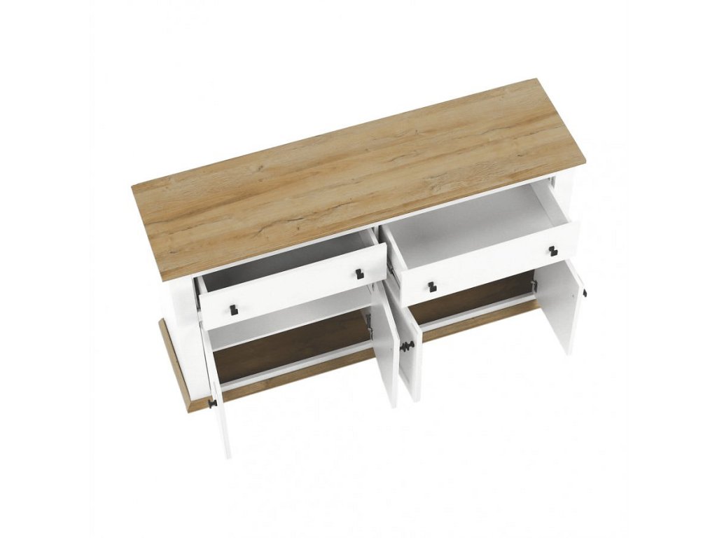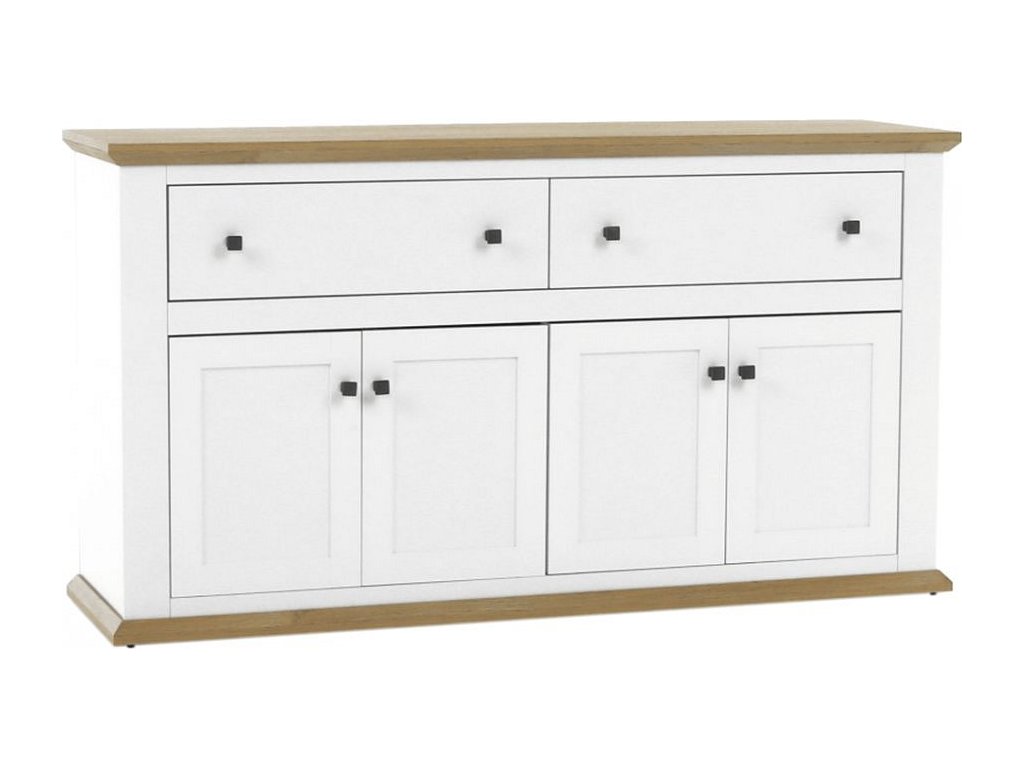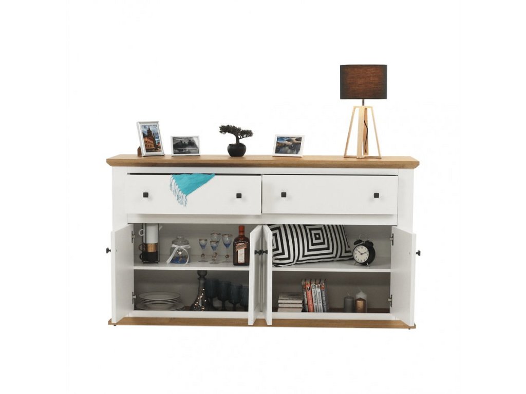 Materiál: DTD laminovaná / ABS hrany Barva: bílá / dub grand Rozměry (ŠxHxV): 160x45x87 cm Tloušťka materiálu: 40 mm čtyřdveřová čtyři skříňky dva šuplíky S úchytkami S 3D efektem elegantní V provensálském stylu kovové úchytky Dodávané v demontu