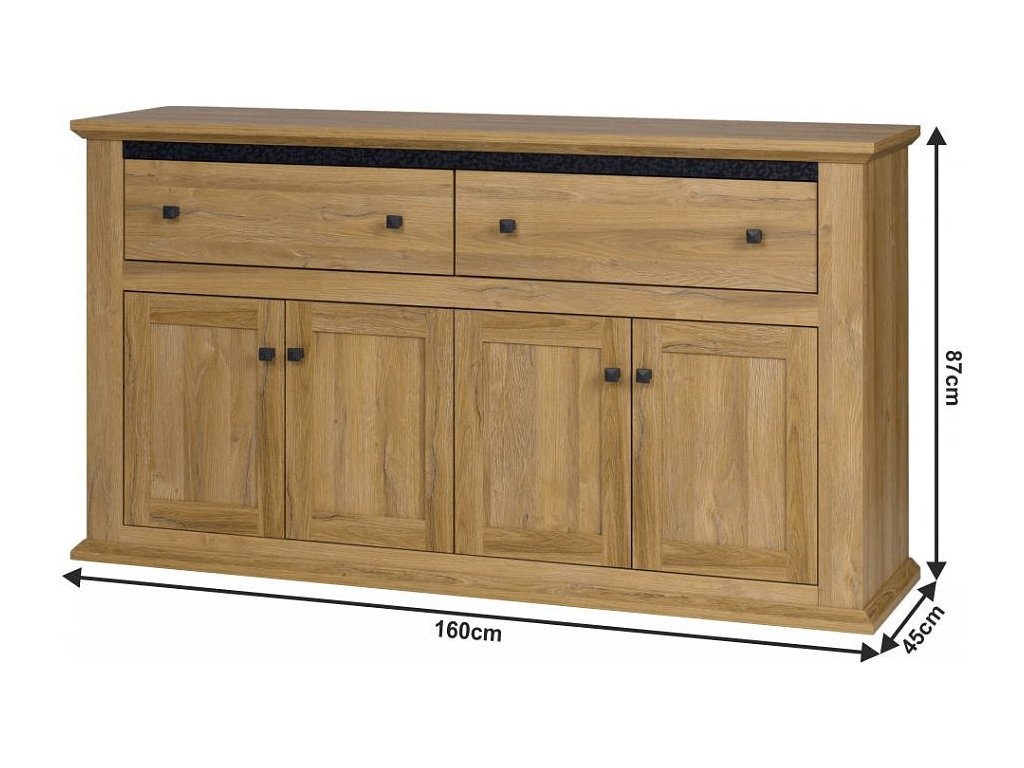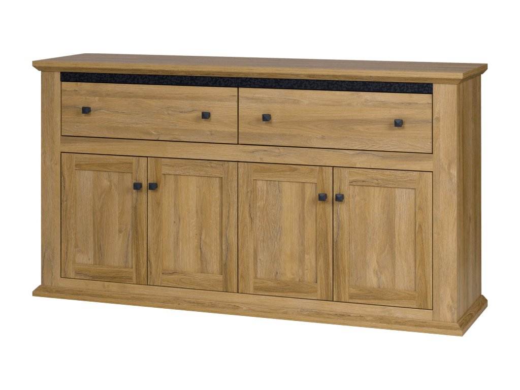 Materiál: DTD laminovaná / ABS hrany Barva: dub grand Rozměry (ŠxHxV): 160x45x87 cm Tloušťka materiálu: 40 mm čtyřdveřová čtyři skříňky dva šuplíky S úchytkami S 3D efektem elegantní V provensálském stylu kovové úchytky Dodávané v demontu