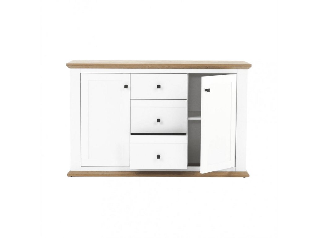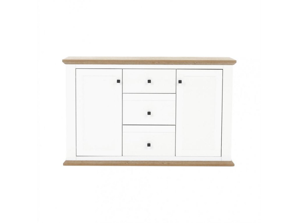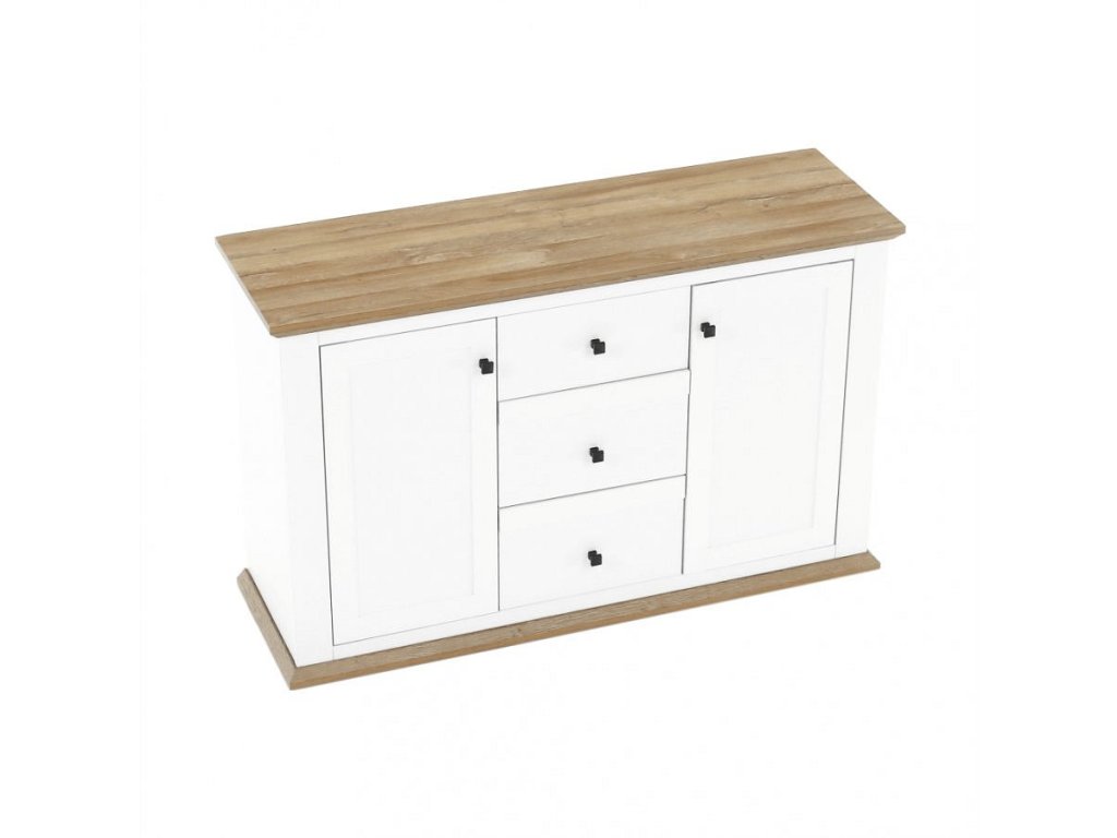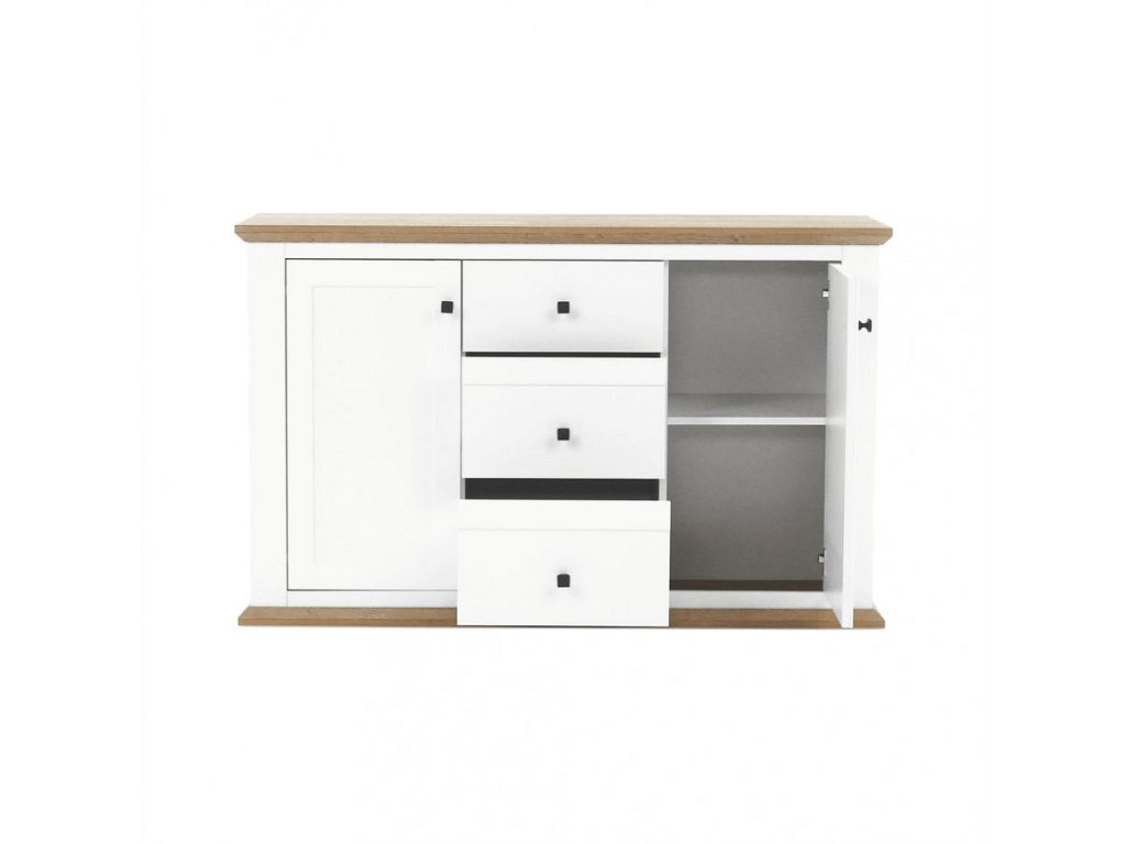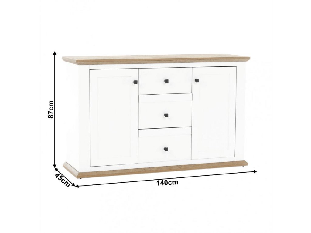 Materiál: DTD laminovaná / ABS hrany Barva: bílá / dub grand Rozměry (ŠxHxV): 140x45x87 cm Tloušťka materiálu: 40 mm dvoudveřová dvě skříňky tři šuplíky S úchytkami S 3D efektem elegantní V provensálském stylu kovové úchytky Dodávané v demontu