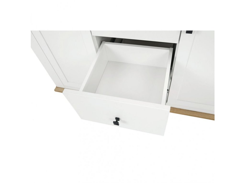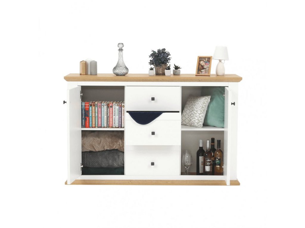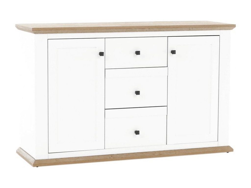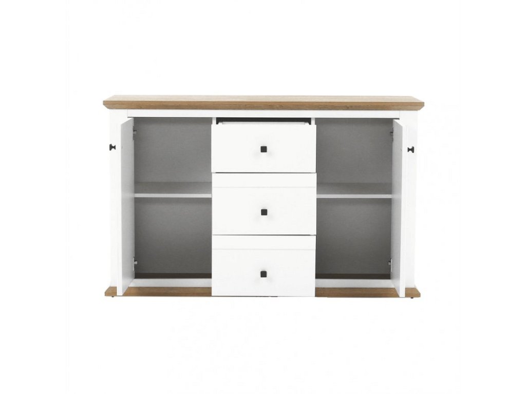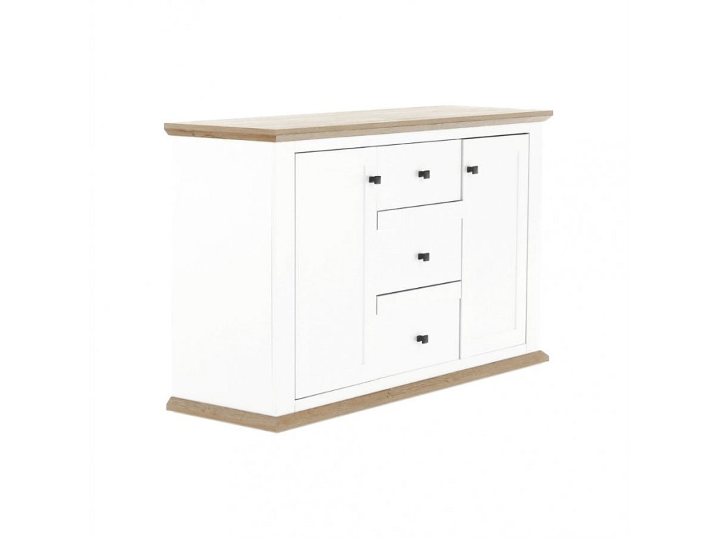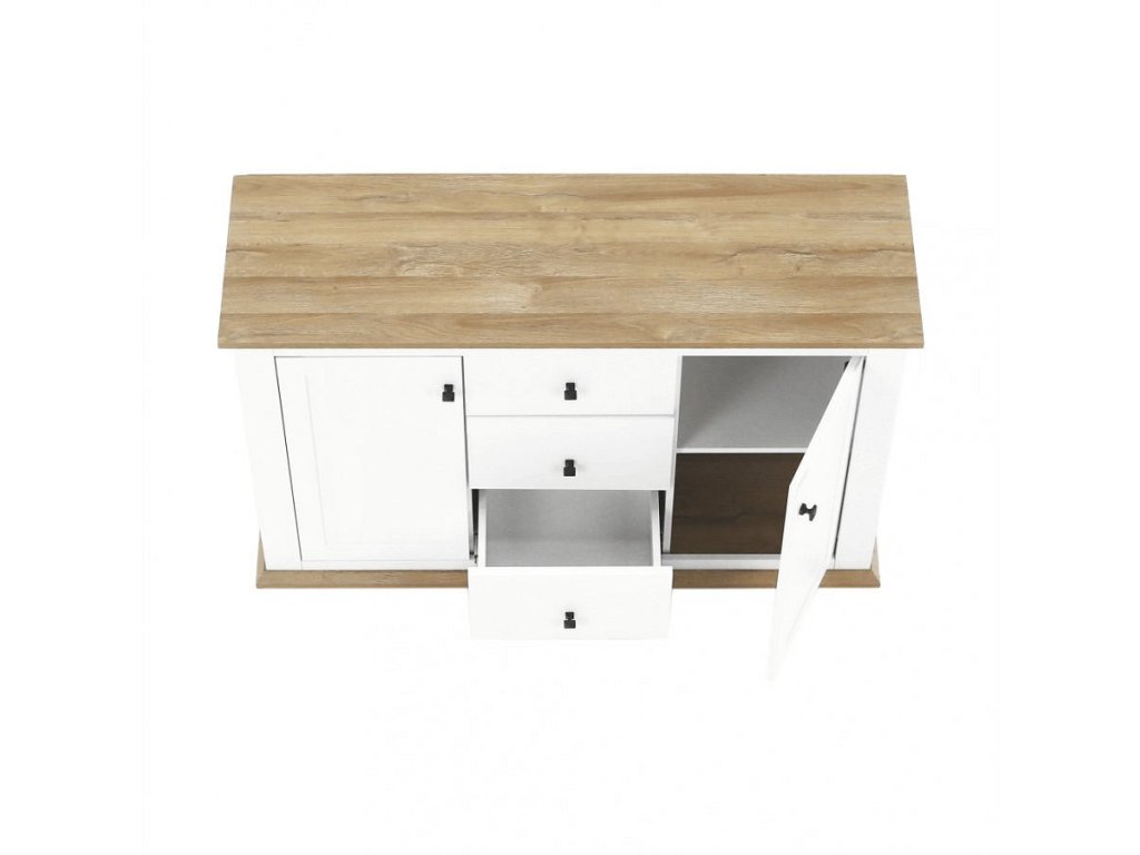 Materiál: DTD laminovaná / ABS hrany Barva: bílá / dub grand Rozměry (ŠxHxV): 140x45x87 cm Tloušťka materiálu: 40 mm dvoudveřová dvě skříňky tři šuplíky S úchytkami S 3D efektem elegantní V provensálském stylu kovové úchytky Dodávané v demontu