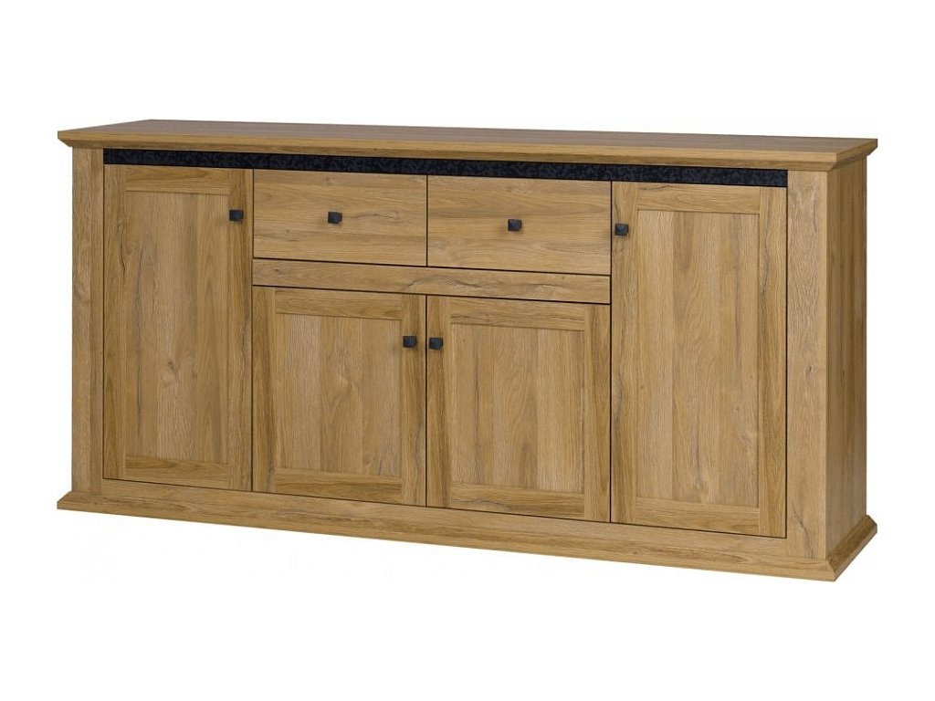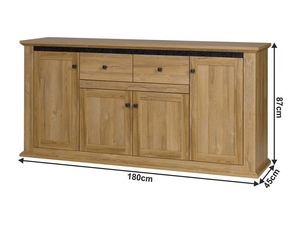 Materiál: DTD laminovaná / ABS hrany Barva: dub grand Rozměry (ŠxHxV): 180x45x87 cm Tloušťka materiálu: 40 mm čtyřdveřová čtyři skříňky dva šuplíky S úchytkami S 3D efektem elegantní V provensálském stylu kovové úchytky Dodávané v demontu