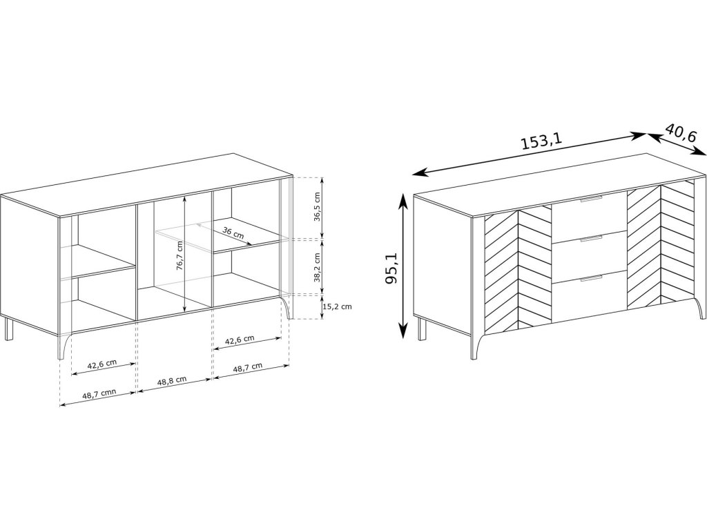 Díky třem prostorným zásuvkám a dvěma skříňkám s vnitřními policemi budete mít ve věcech konečně pořádek. Kvalitní výsuvy (soft close) a panty s tichým dovíráním se postarají o každodenní komfort. Rozměry viz obrázek.