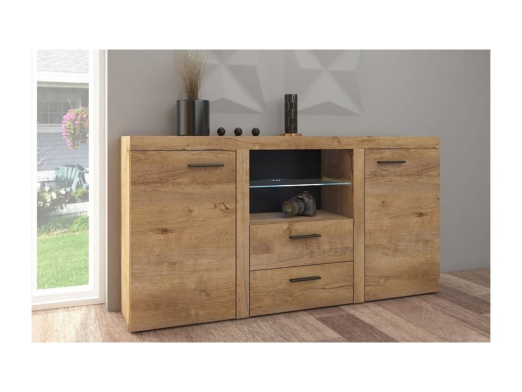 Komoda v moderním provedení. Korpus i dvířka jsou vyrobeny z kvalitního lamina v barvě dub lefkas. Úchyty jsou plastové černé. Dodáváme v demontovaném stavu.Doplňkové parametry