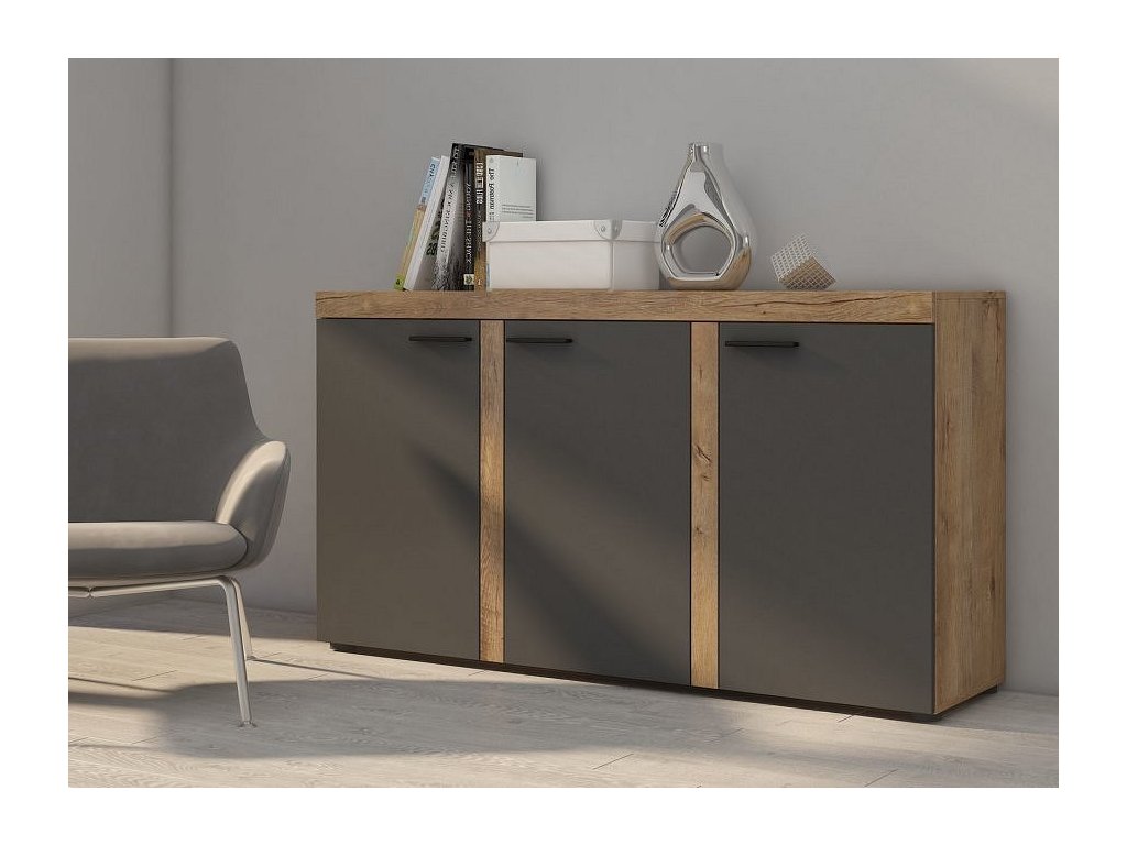 Komoda třfídveřová v moderním provedení. Korpus je vyroben z kvalitního lamina v barvě dub lefkas, dvířka jsou vyrobena v barvě grafit. Úchyty jsou plastové černé. Dodáváme v demontovaném stavu.Doplňkové parametry