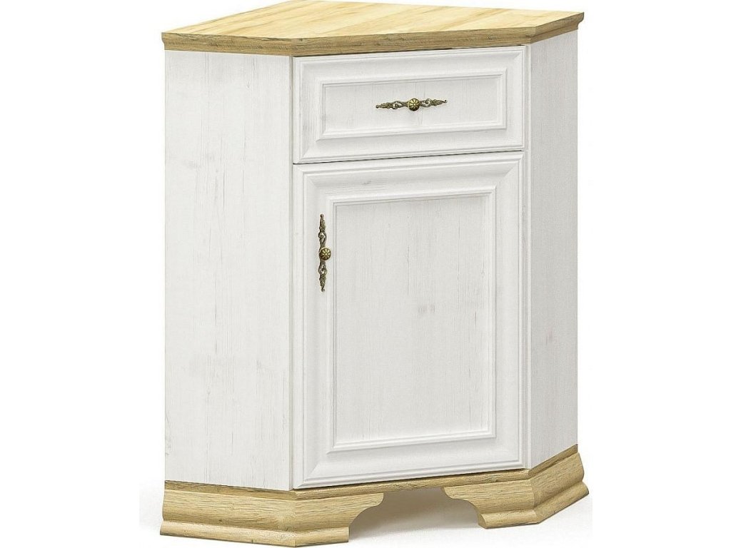 Komoda rohová jednodveřová se zásuvkou ze sektorové řady nábytku v romantickém stylu. Nábytek je vyroben z kvalitní LTD v kombinaci s MDF v barevné kombinaci borovice andersen/zlatý dub. V naší nabídce najdete další jednotlivé prvky tohoto nábytku, ze kterého si můžete zařídit obývací pokoj dle vlastních potřeb. Dodáváme v demontovaném stavu.Doplňkové parametry