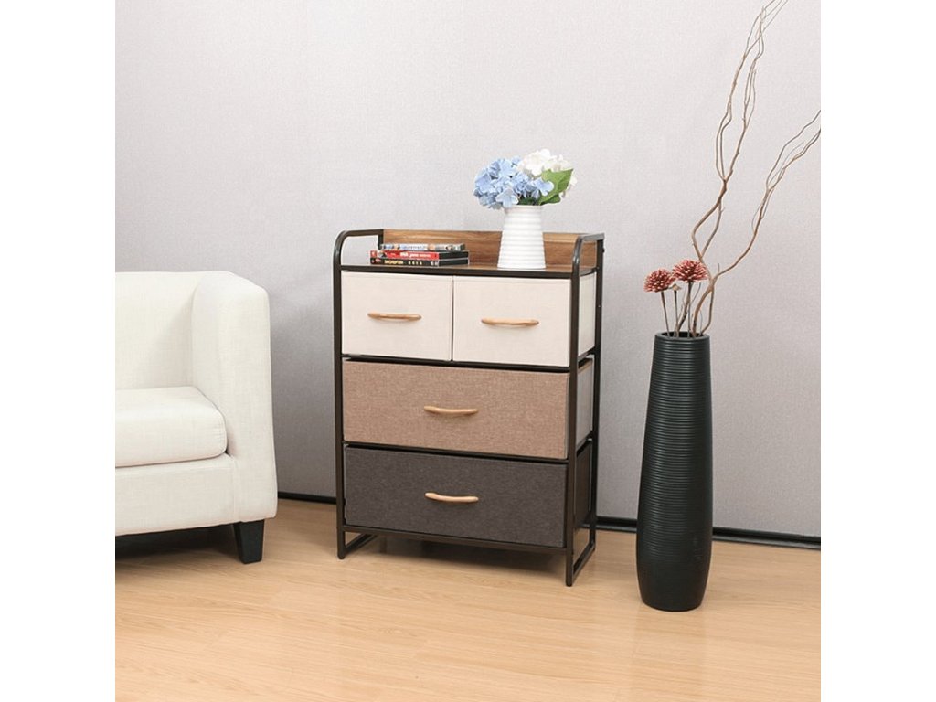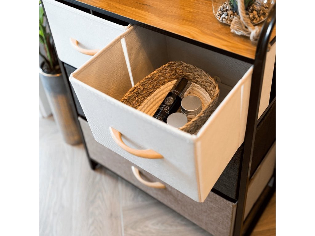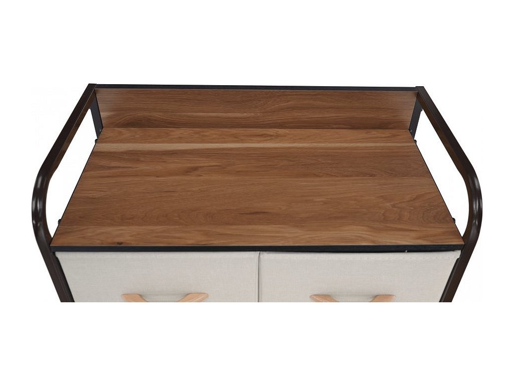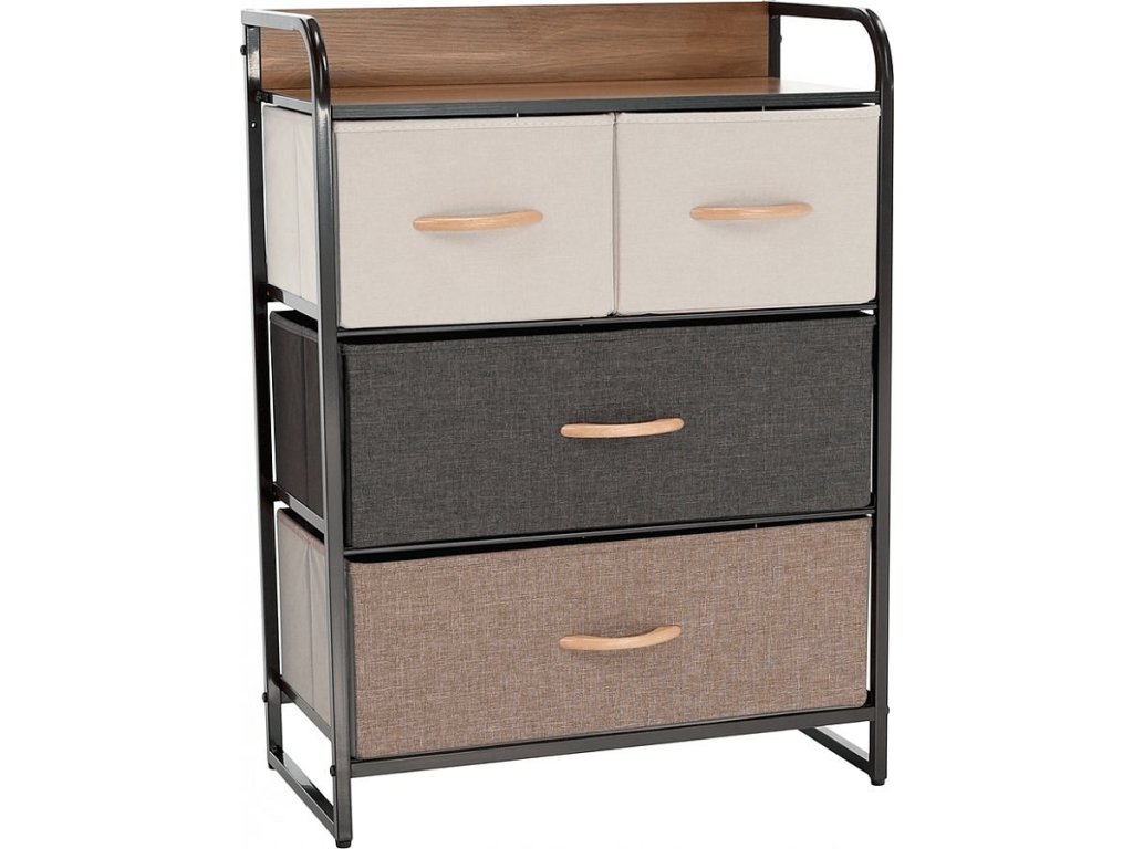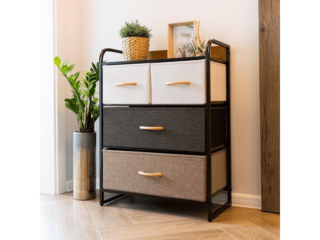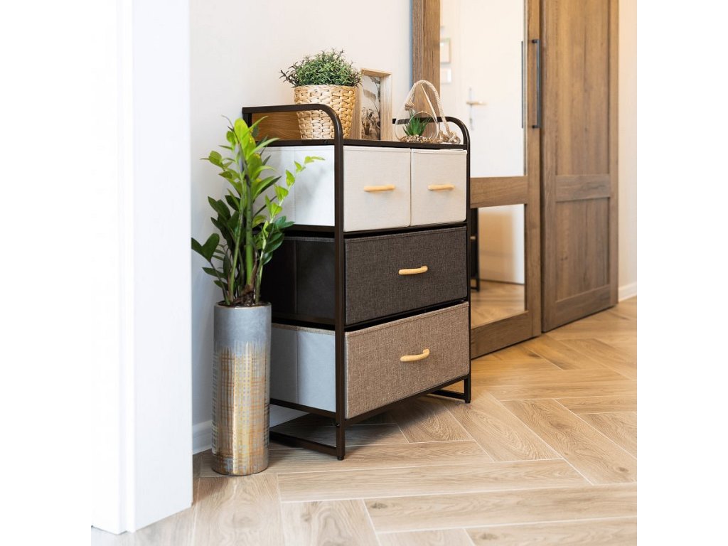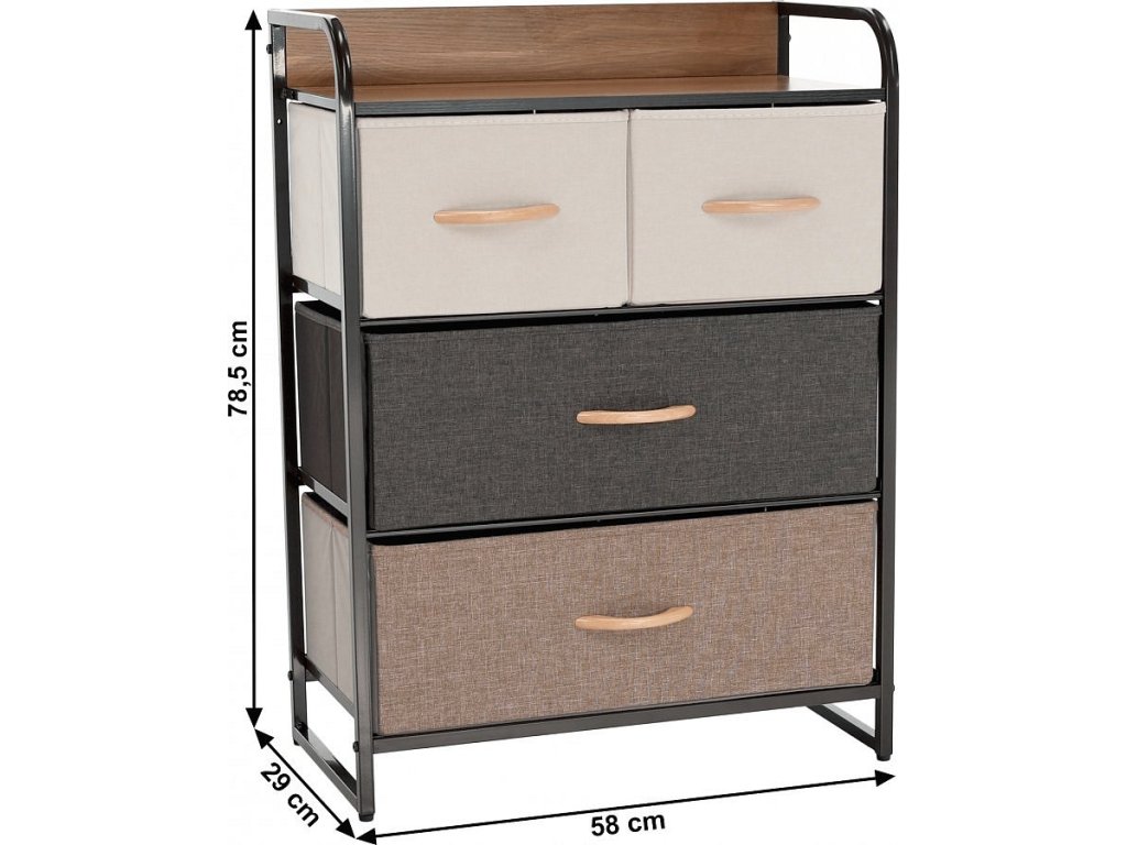 Materiál: MDF / kov / látka / plast Barva: béžová / světlehnědá / tmavohnědá Rozměry (ŠxHxV): 58x29x78,5 cm Tloušťka vrchního plátu: 1,2 cm čtyři šuplíky kovová konstrukce látkové šuplíky S dřevěnými úchytkami Dodávané v demontu