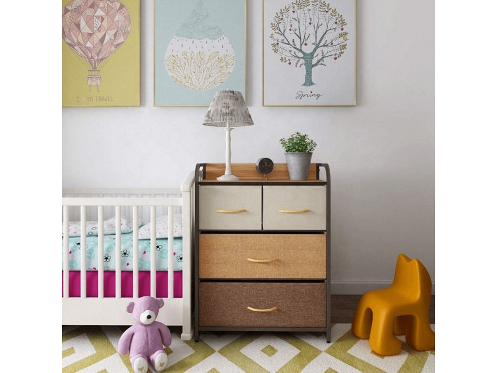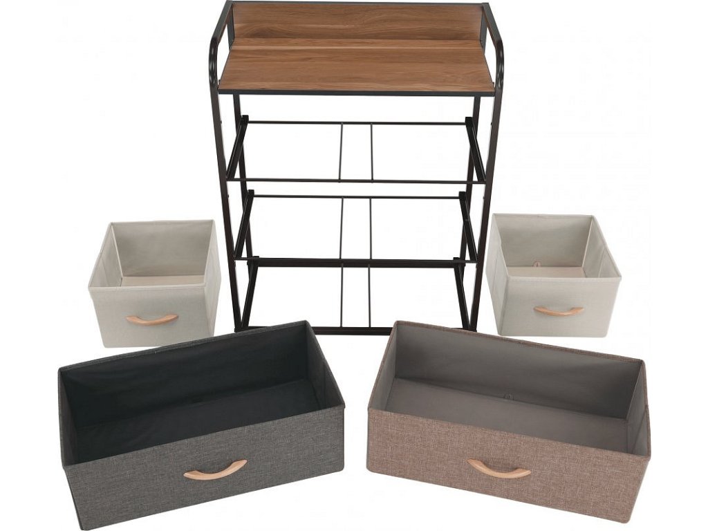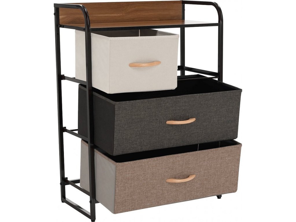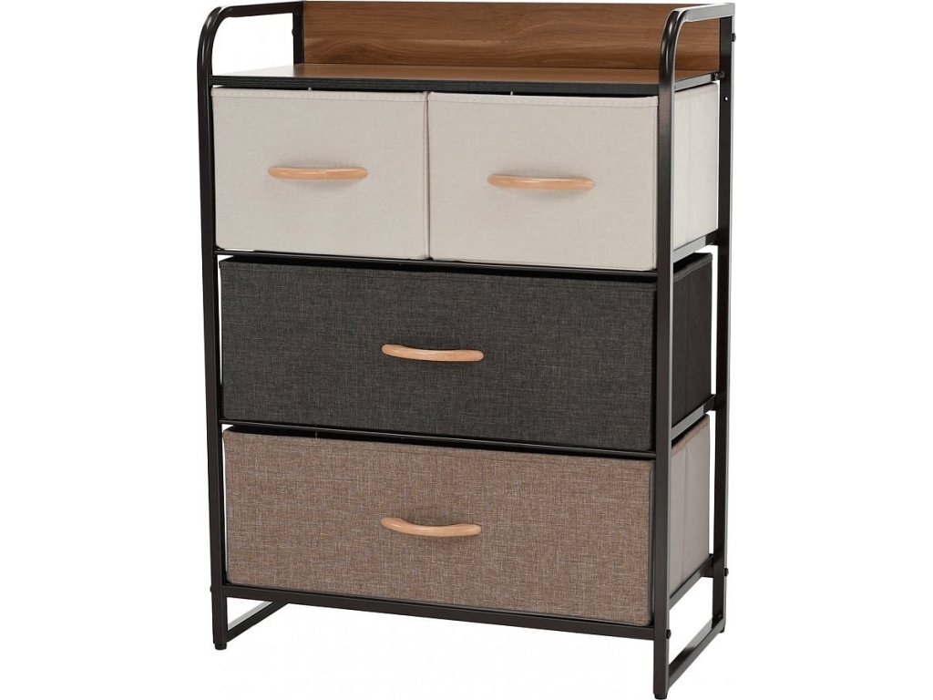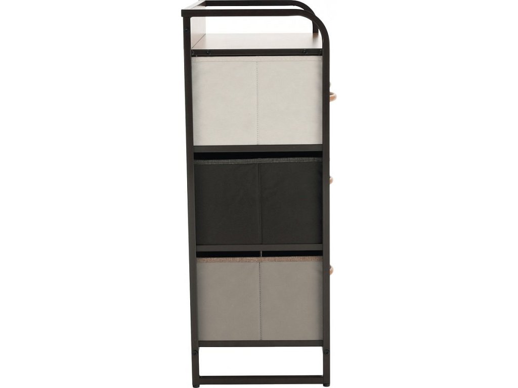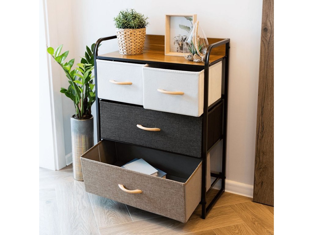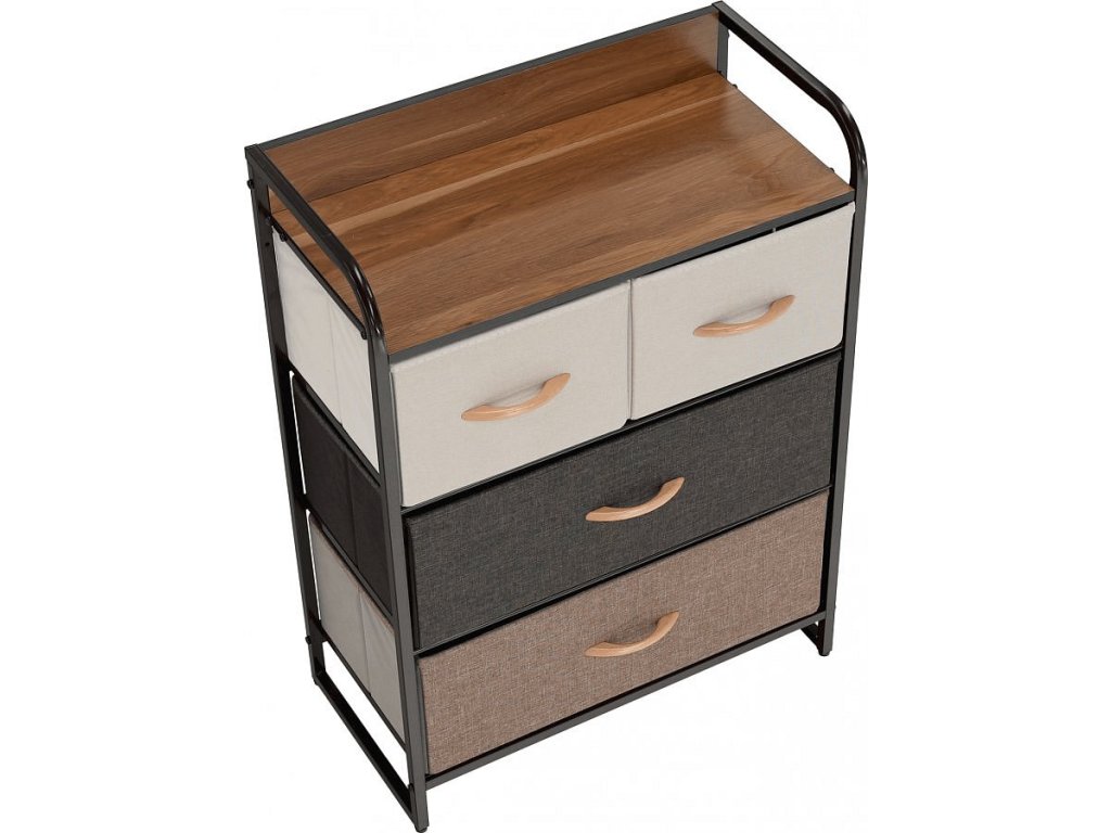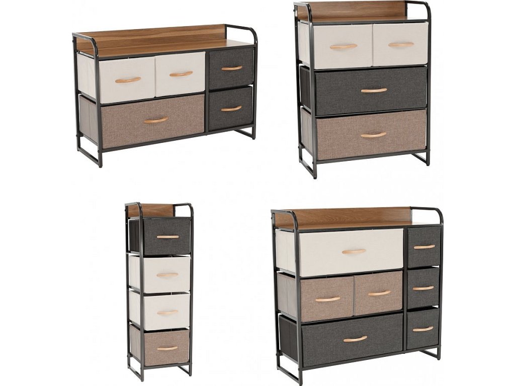 Materiál: MDF / kov / látka / plast Barva: béžová / světlehnědá / tmavohnědá Rozměry (ŠxHxV): 58x29x78,5 cm Tloušťka vrchního plátu: 1,2 cm čtyři šuplíky kovová konstrukce látkové šuplíky S dřevěnými úchytkami Dodávané v demontu