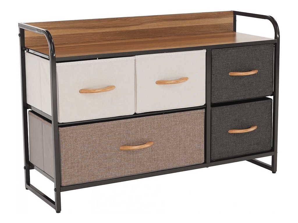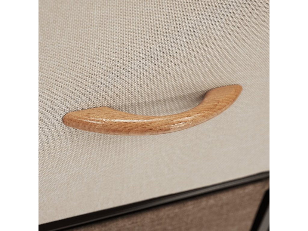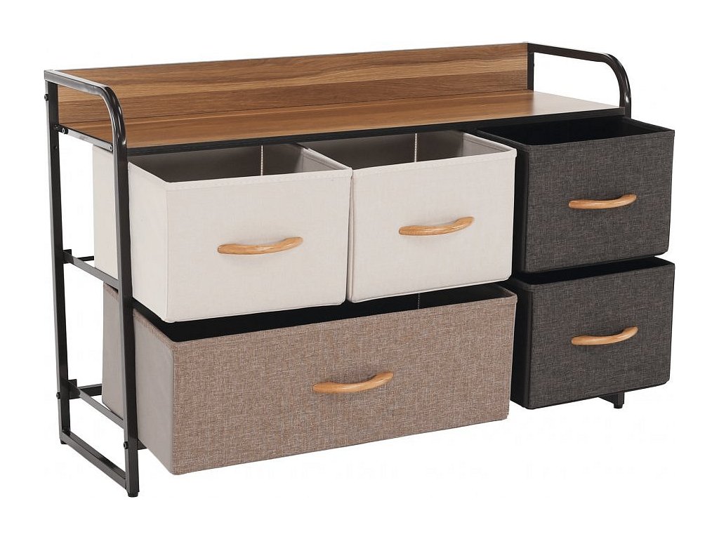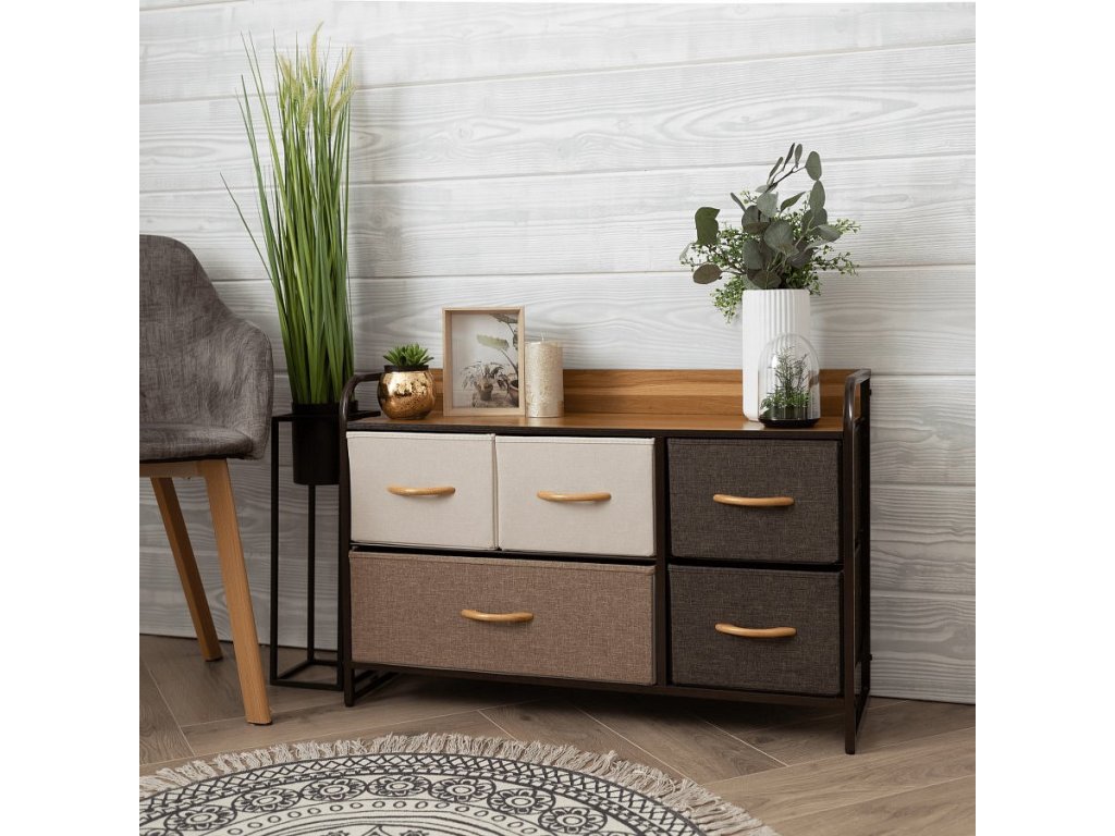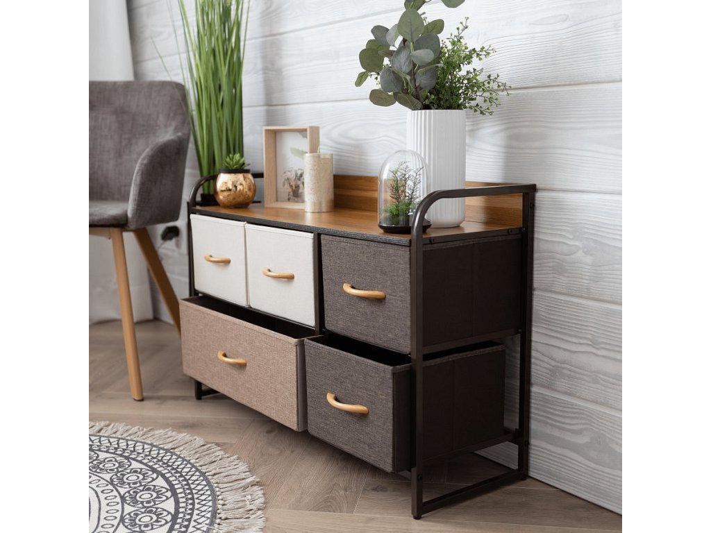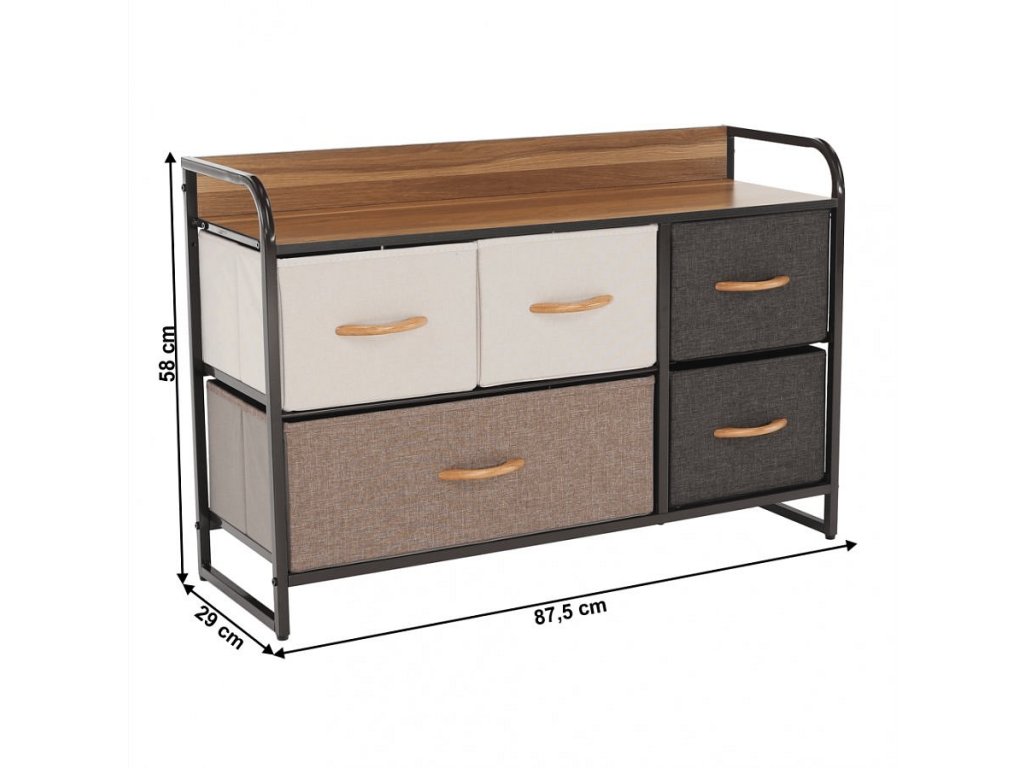Materiál: MDF / kov / látka / plast Barva: béžová / světlehnědá / tmavohnědá Rozměry (ŠxHxV): 87,5x29x58 cm Tloušťka vrchního plátu: 1,2 cm Pět šuplíků kovová konstrukce látkové šuplíky S dřevěnými úchytkami Dodávané v demontu
