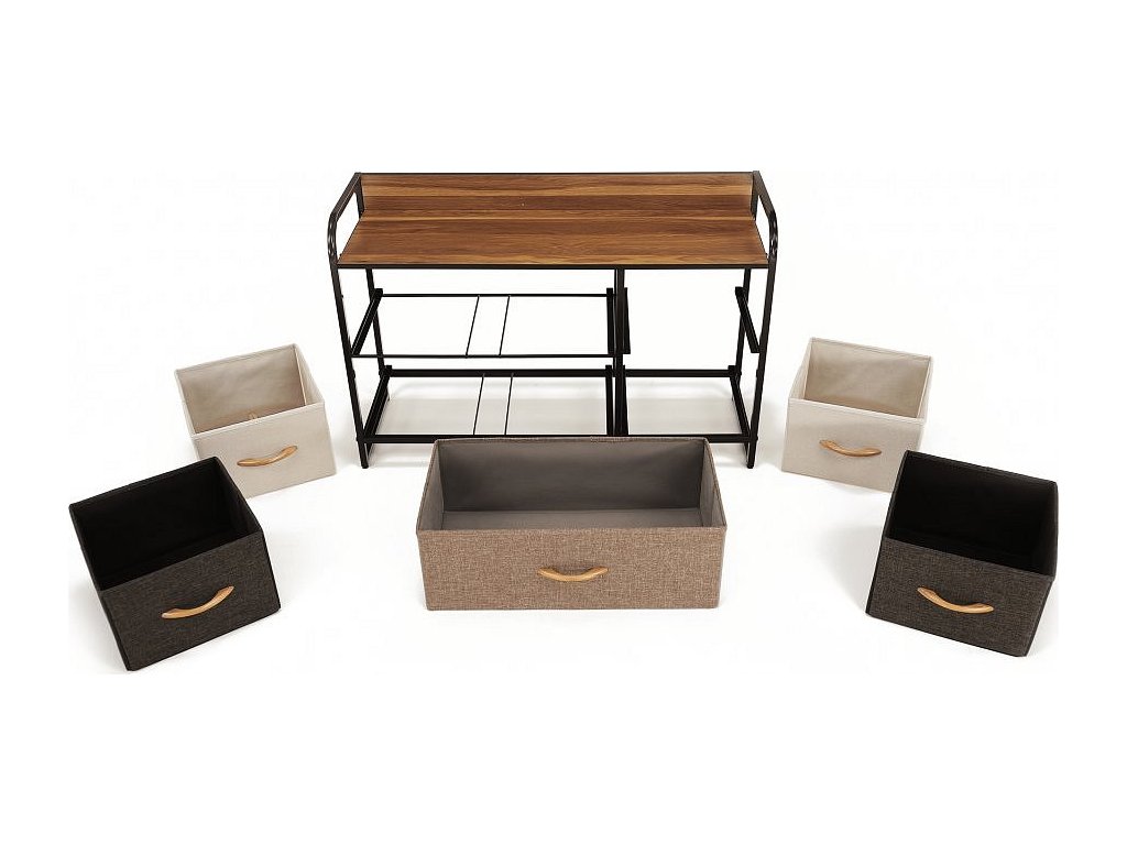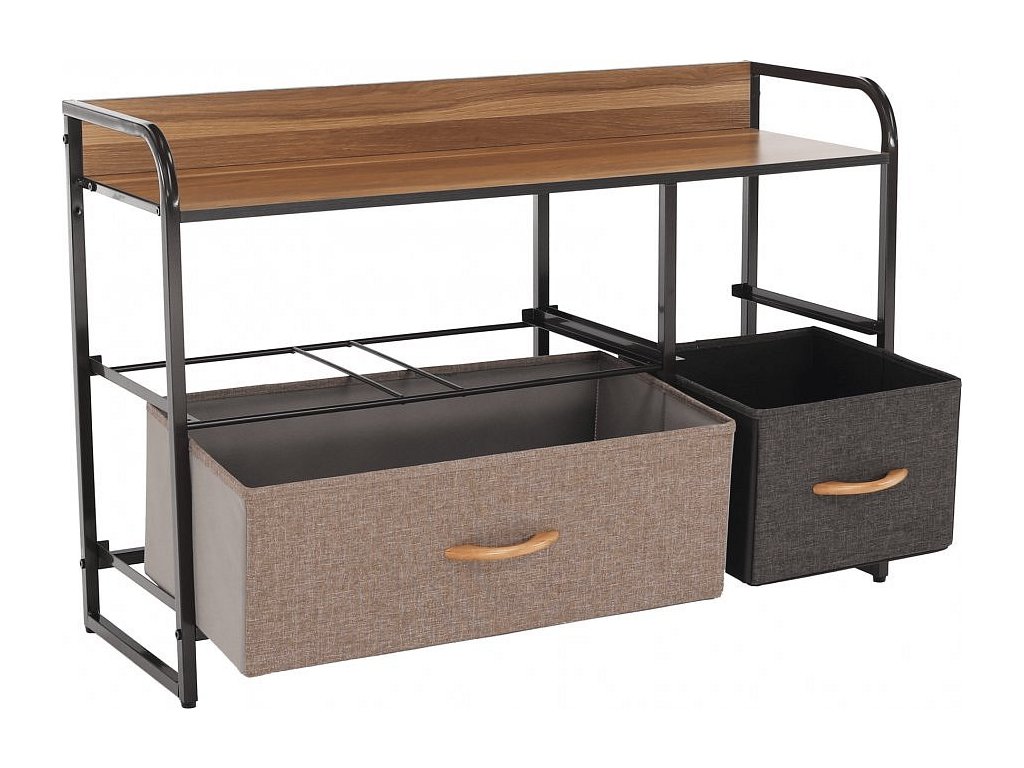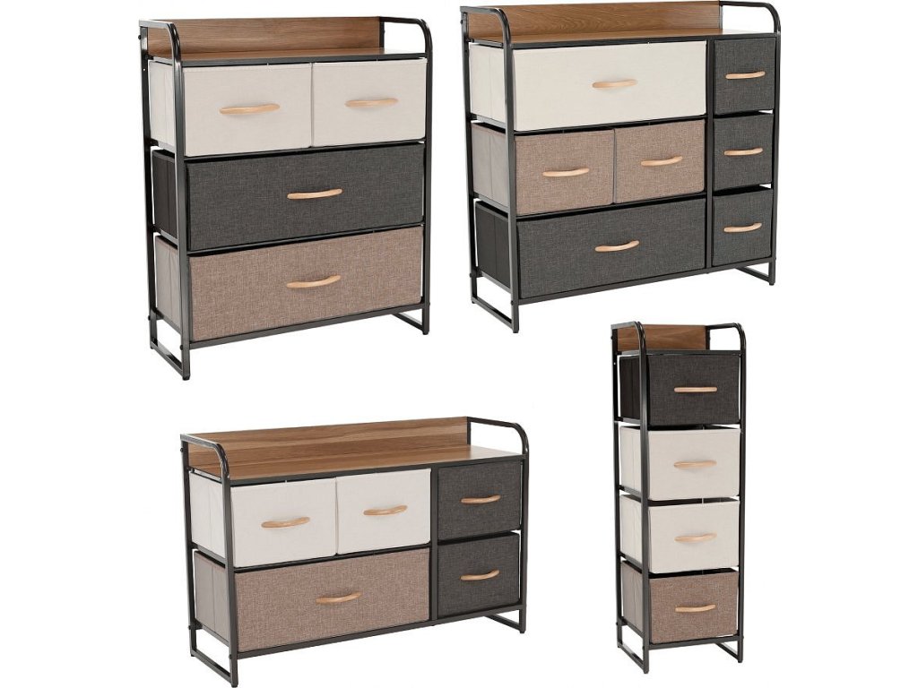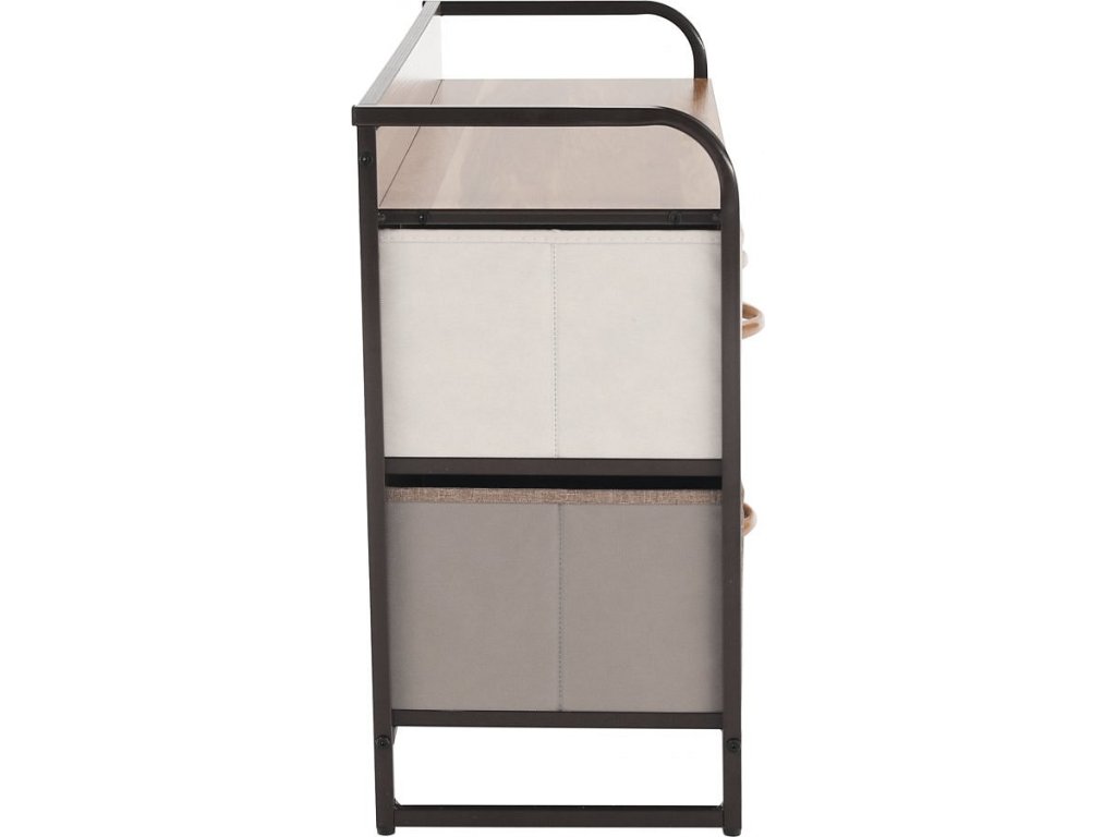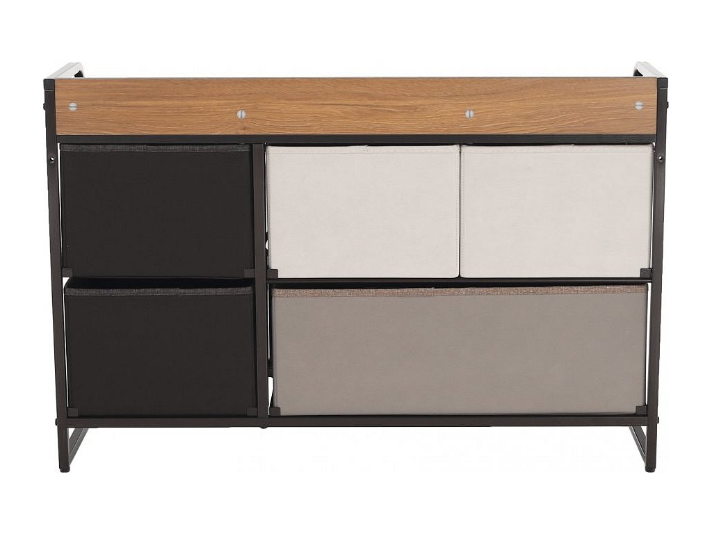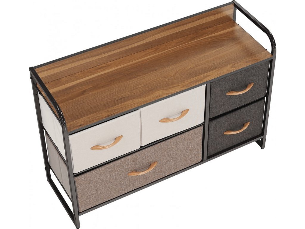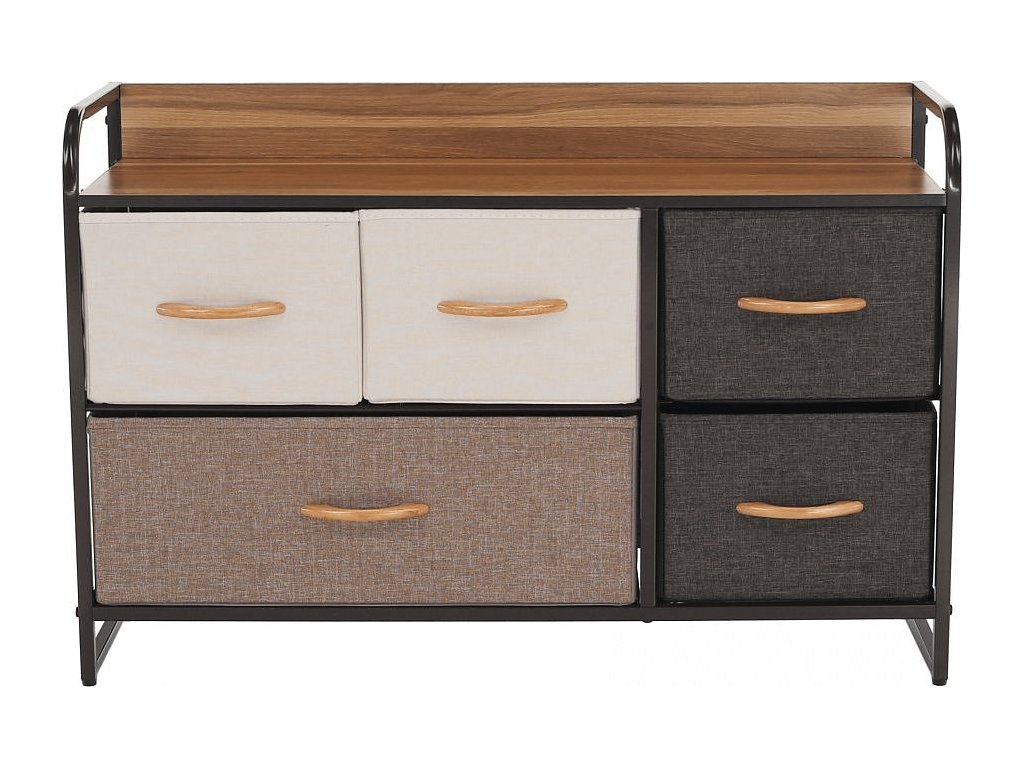 Materiál: MDF / kov / látka / plast Barva: béžová / světlehnědá / tmavohnědá Rozměry (ŠxHxV): 87,5x29x58 cm Tloušťka vrchního plátu: 1,2 cm Pět šuplíků kovová konstrukce látkové šuplíky S dřevěnými úchytkami Dodávané v demontu