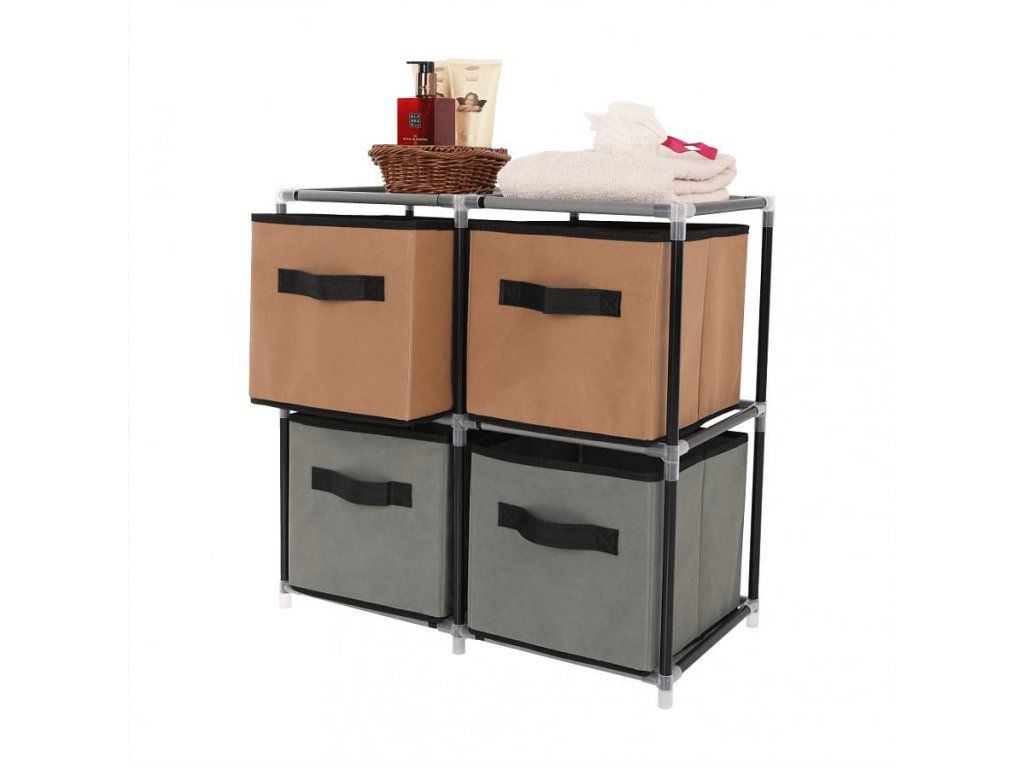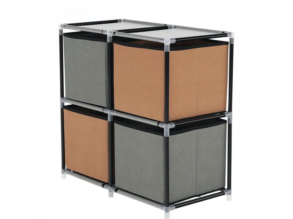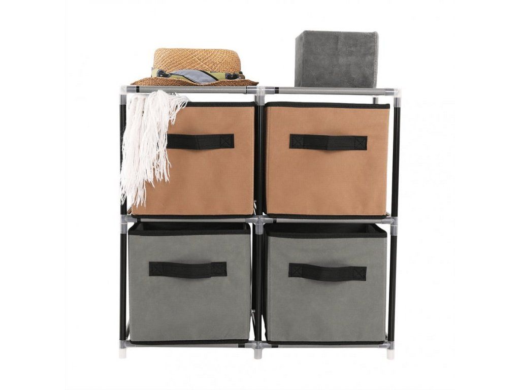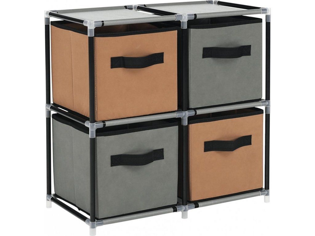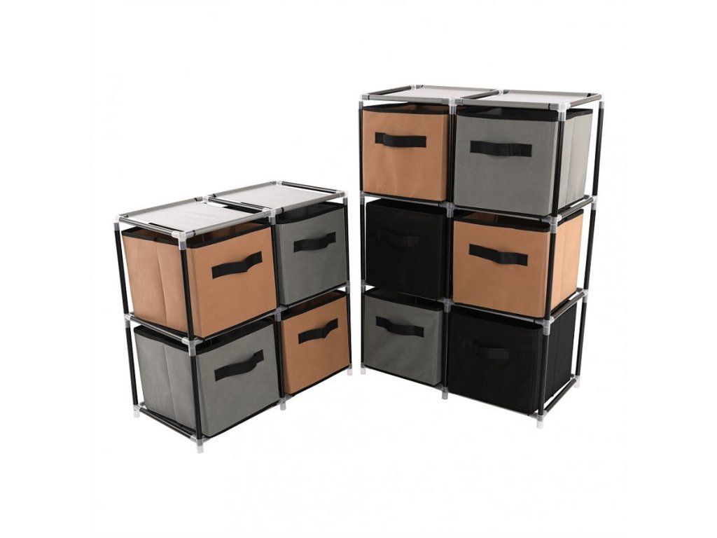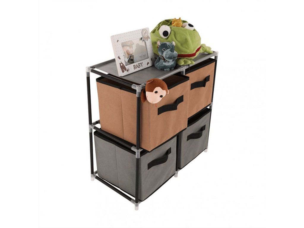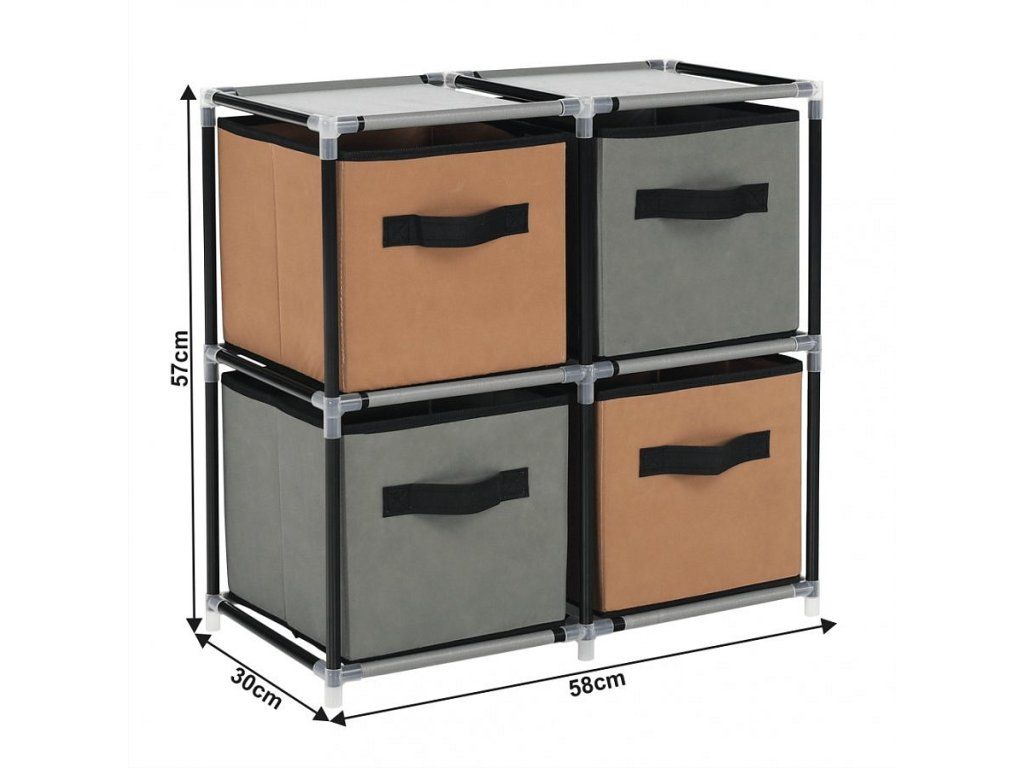 Materiál konstrukce: kov Barva: černá Materiál šuplíky: látka Barva: hnědá / šedá Materiál spojovací díly: plast Rozměry (ŠxHxV): 58x30x57 cm čtyři šuplíky Praktická kovová konstrukce látkové šuplíky S úchytkami Plastové spojovací díly jednoduchá montáž Různé varianty poskládání Dodávané v demontu