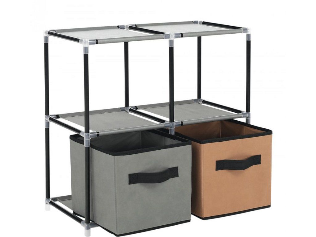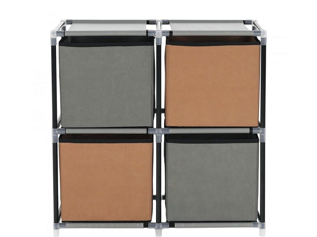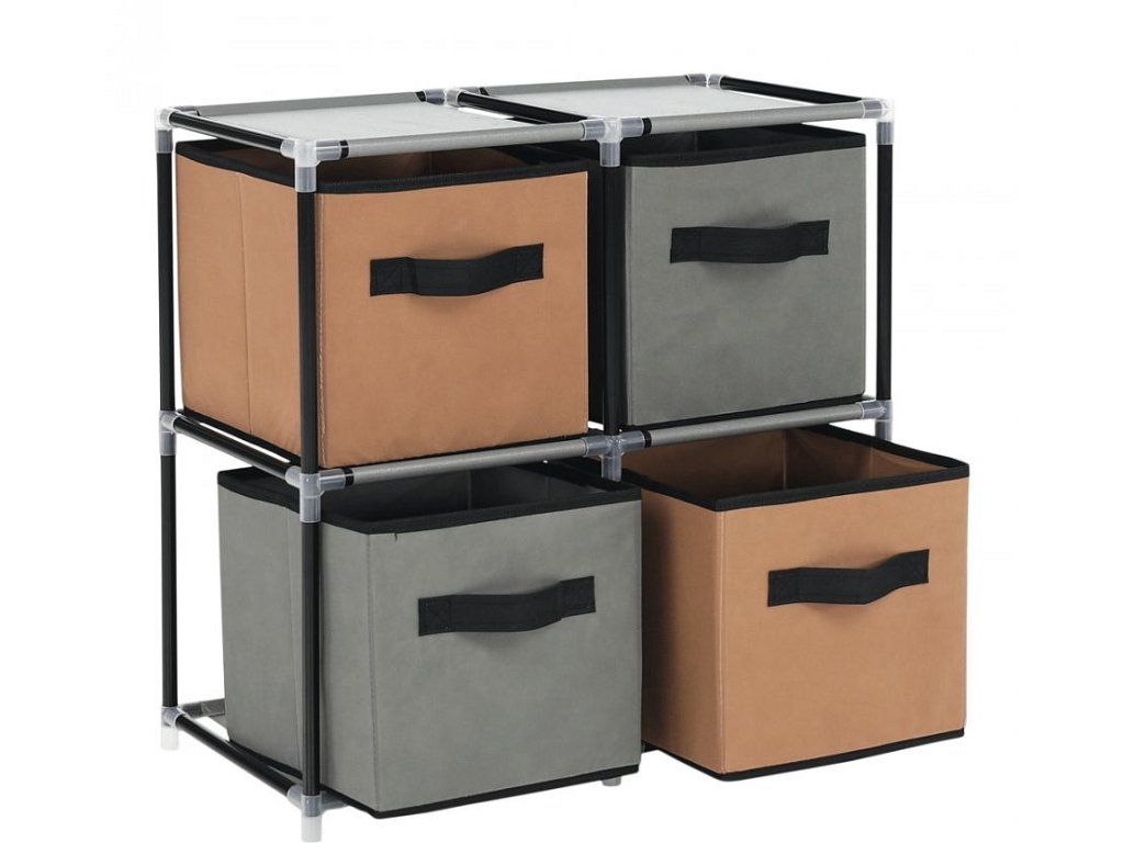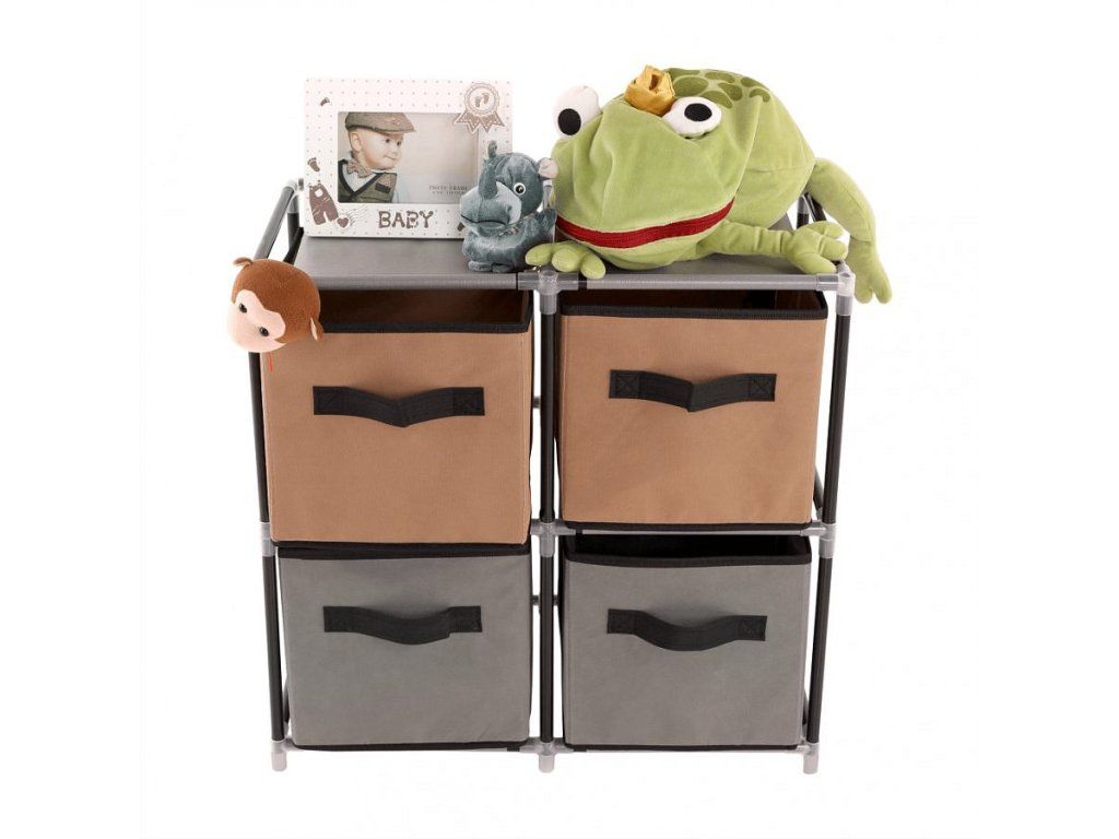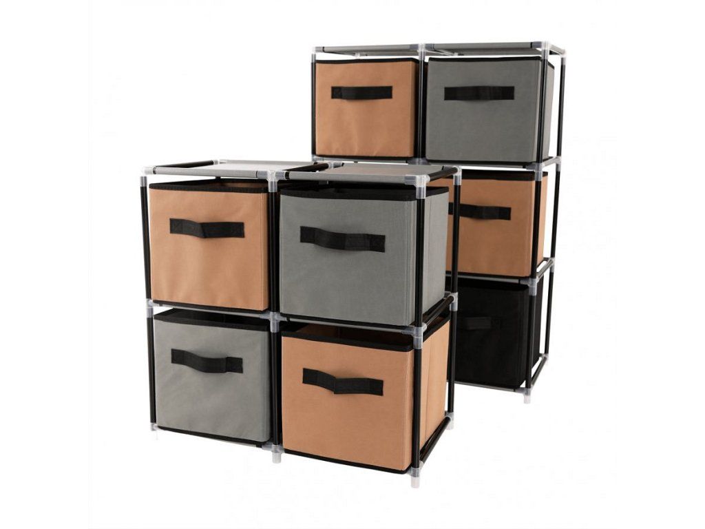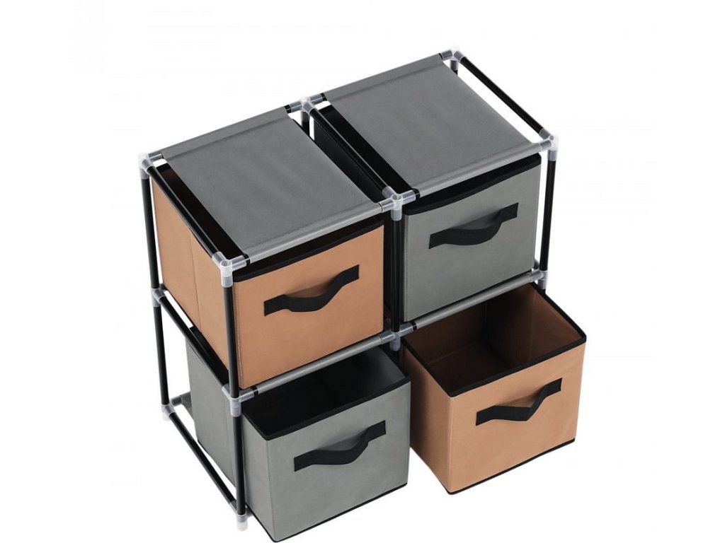 Materiál konstrukce: kov Barva: černá Materiál šuplíky: látka Barva: hnědá / šedá Materiál spojovací díly: plast Rozměry (ŠxHxV): 58x30x57 cm čtyři šuplíky Praktická kovová konstrukce látkové šuplíky S úchytkami Plastové spojovací díly jednoduchá montáž Různé varianty poskládání Dodávané v demontu
