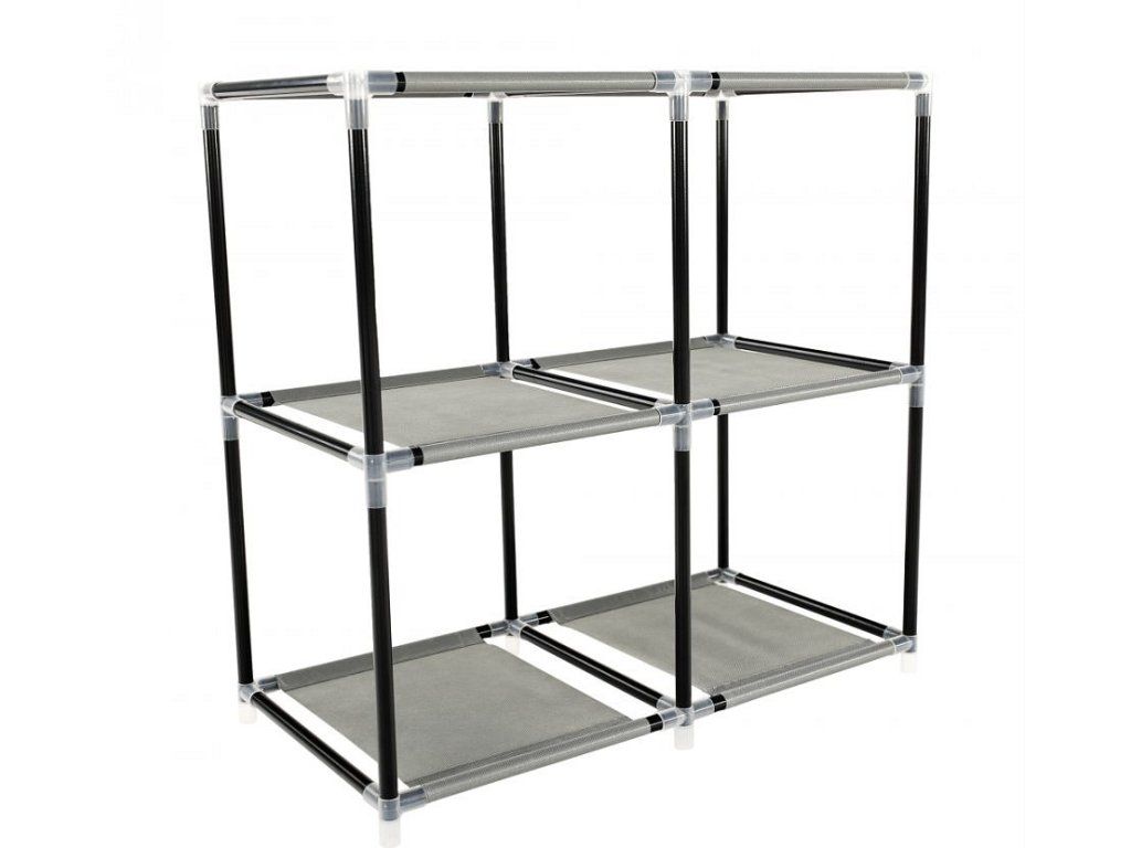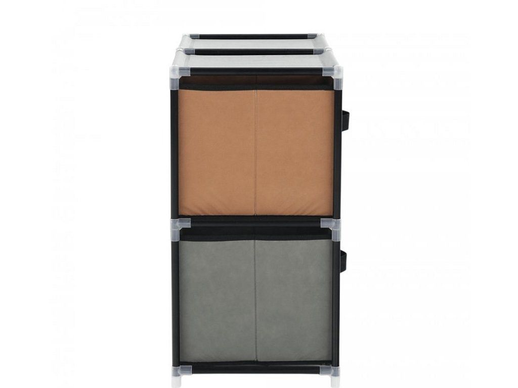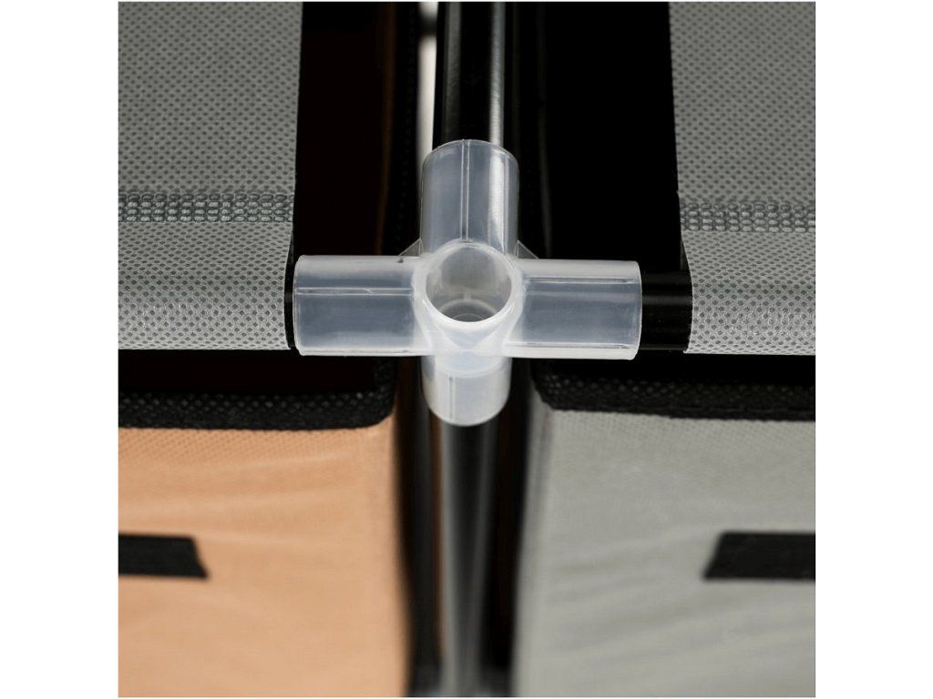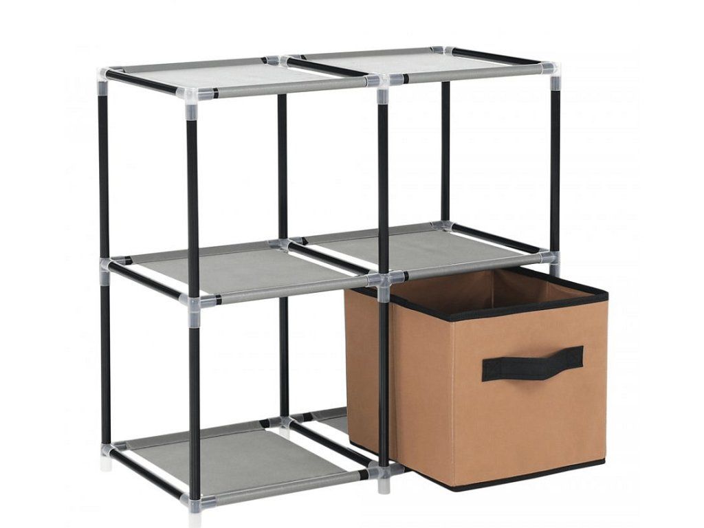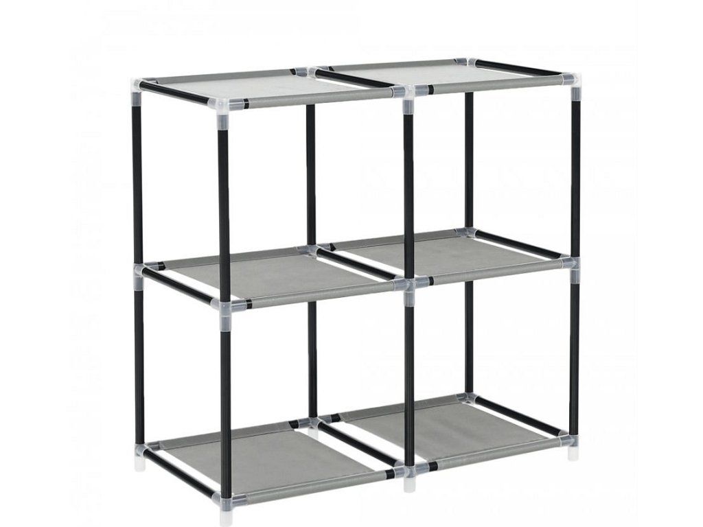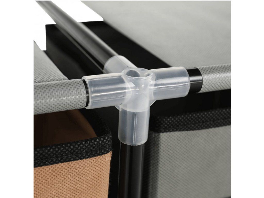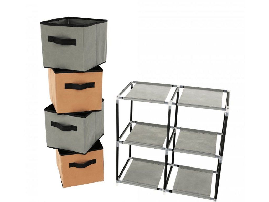 Materiál konstrukce: kov Barva: černá Materiál šuplíky: látka Barva: hnědá / šedá Materiál spojovací díly: plast Rozměry (ŠxHxV): 58x30x57 cm čtyři šuplíky Praktická kovová konstrukce látkové šuplíky S úchytkami Plastové spojovací díly jednoduchá montáž Různé varianty poskládání Dodávané v demontu