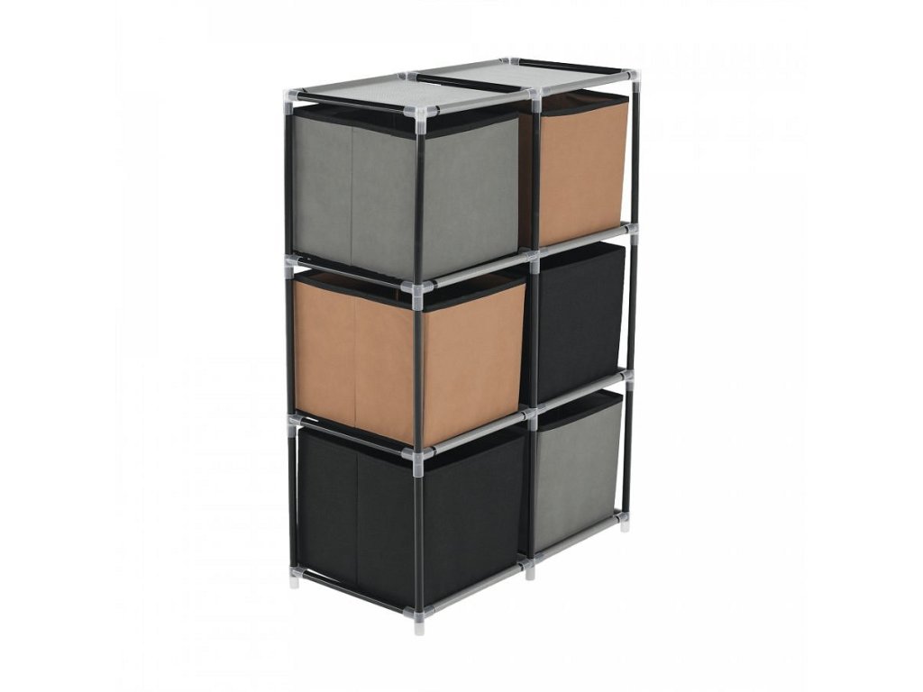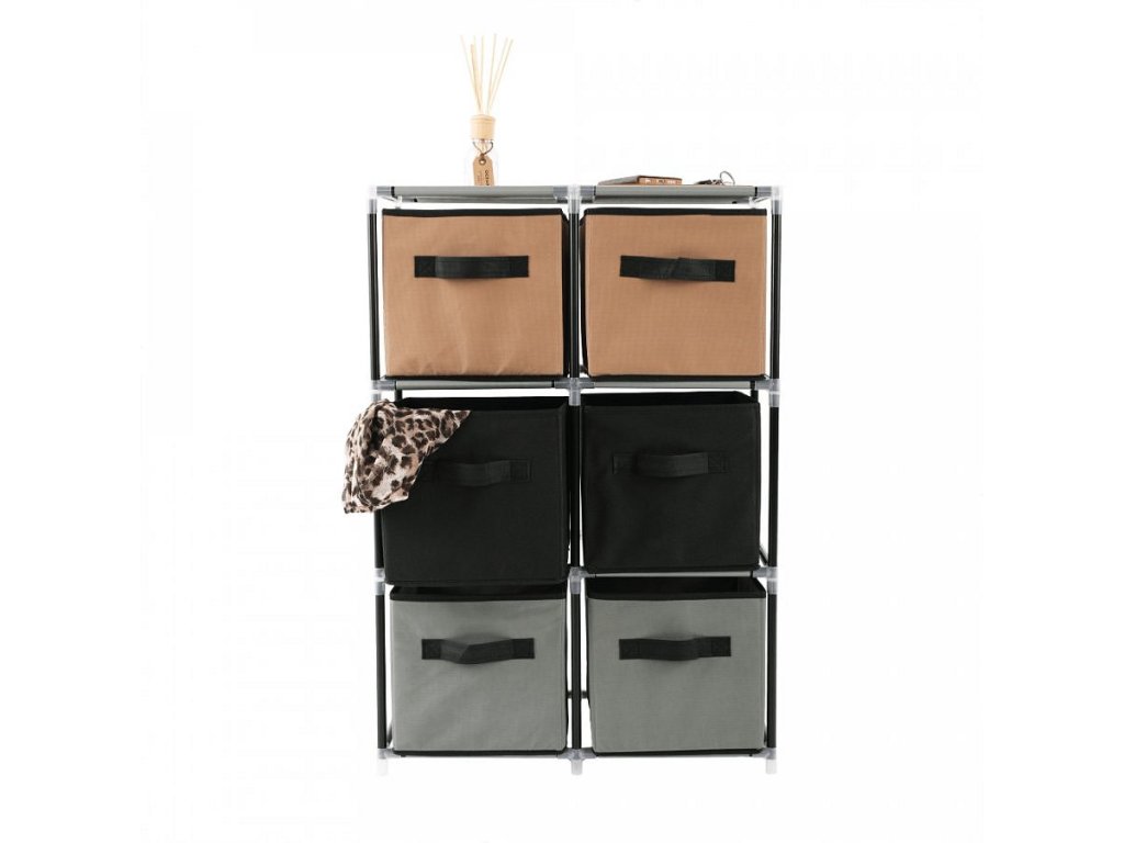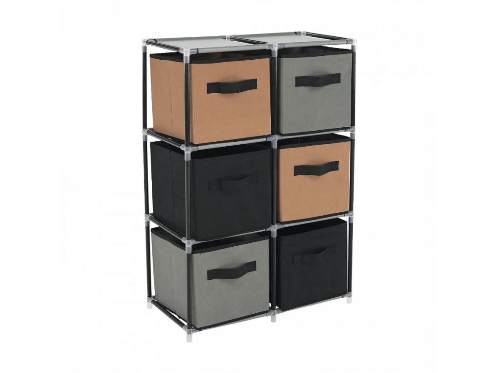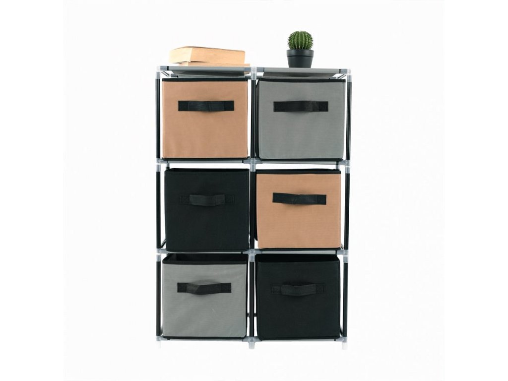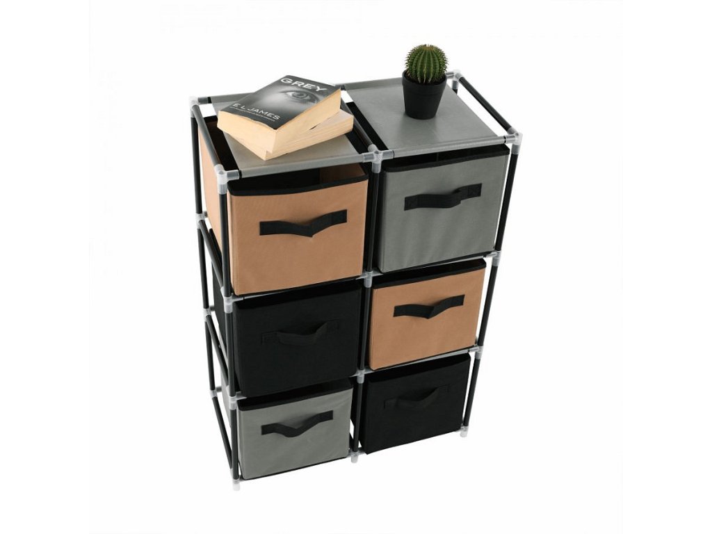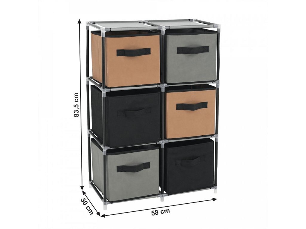 Materiál konstrukce: kov Barva: černá Materiál šuplíky: látka Barva: hnědá / šedá Materiál spojovací díly: plast Rozměry (ŠxHxV): 58x30x83,5 cm šest šuplíků Praktická kovová konstrukce látkové šuplíky S úchytkami Plastové spojovací díly jednoduchá montáž Různé varianty poskládání Dodávané v demontu