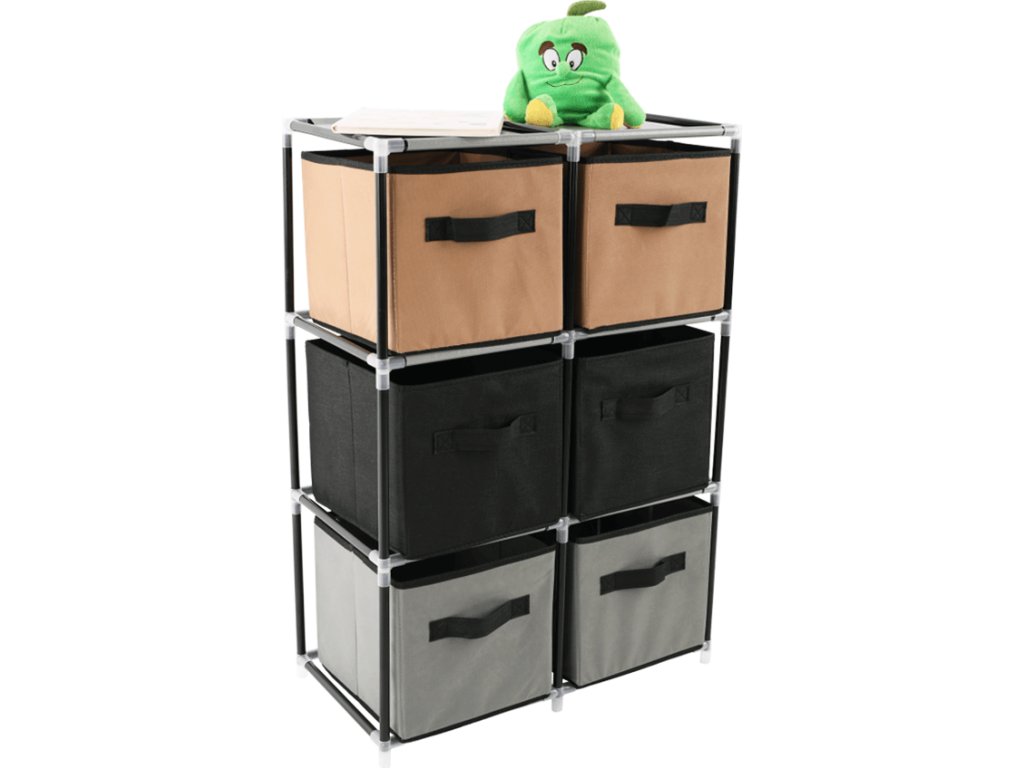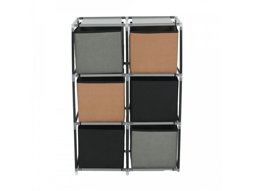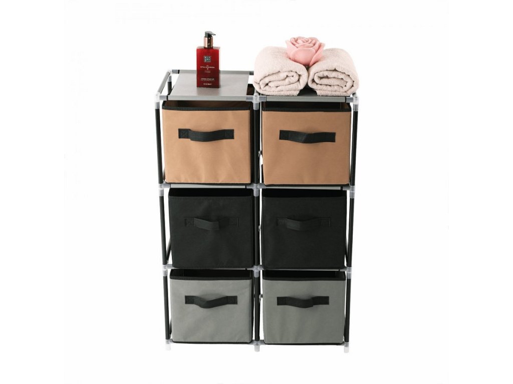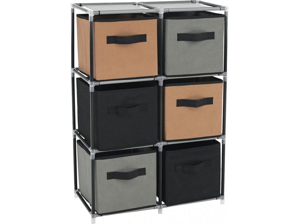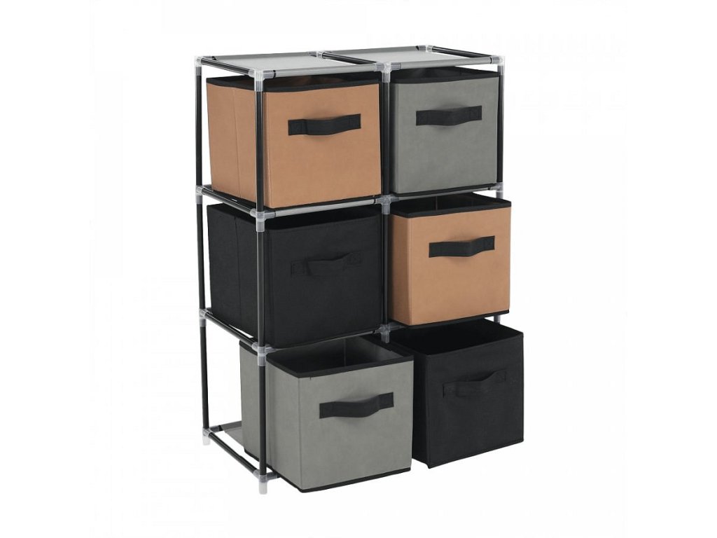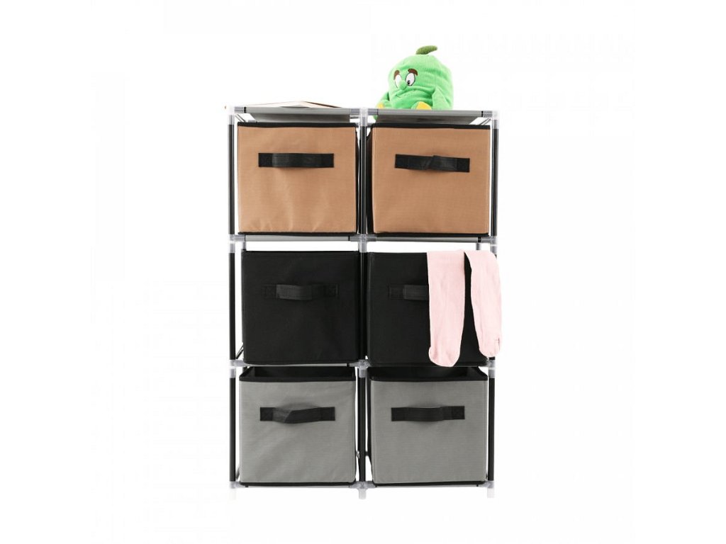 Materiál konstrukce: kov Barva: černá Materiál šuplíky: látka Barva: hnědá / šedá Materiál spojovací díly: plast Rozměry (ŠxHxV): 58x30x83,5 cm šest šuplíků Praktická kovová konstrukce látkové šuplíky S úchytkami Plastové spojovací díly jednoduchá montáž Různé varianty poskládání Dodávané v demontu