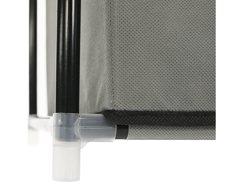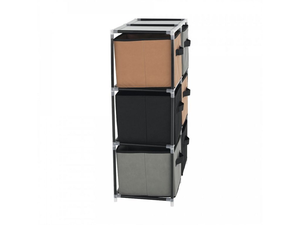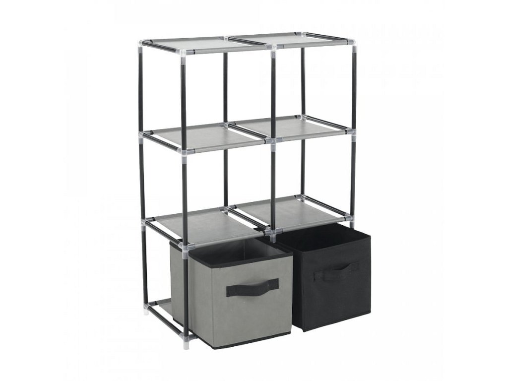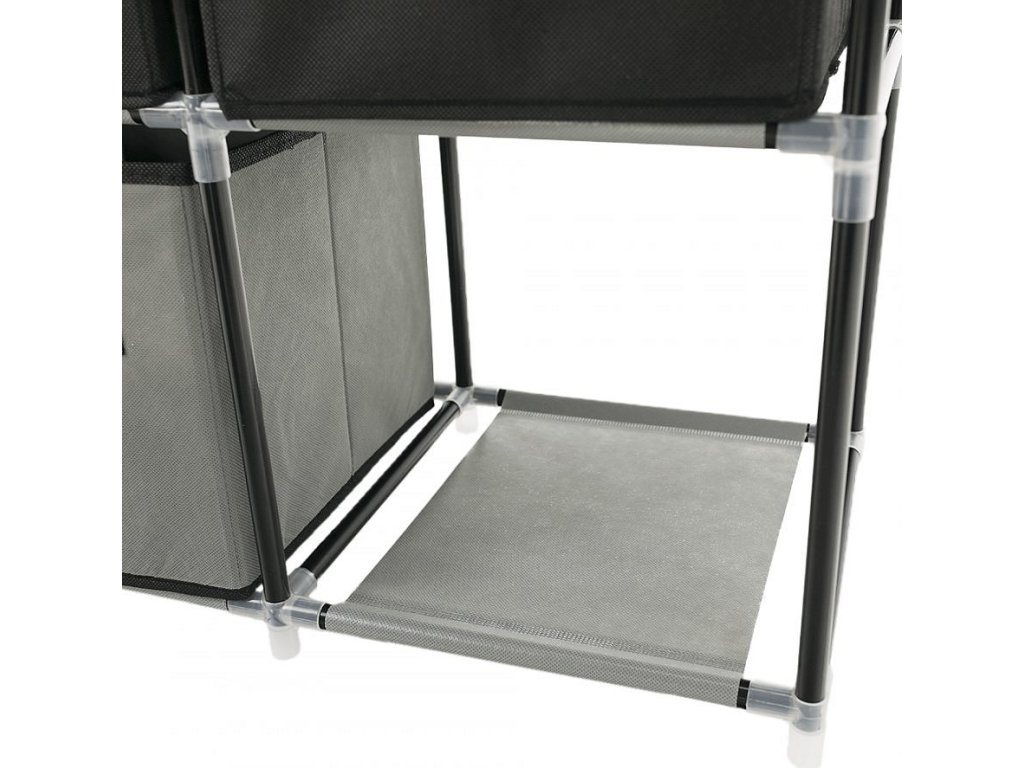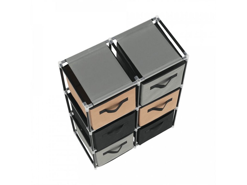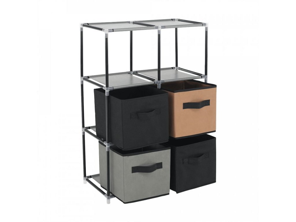 Materiál konstrukce: kov Barva: černá Materiál šuplíky: látka Barva: hnědá / šedá Materiál spojovací díly: plast Rozměry (ŠxHxV): 58x30x83,5 cm šest šuplíků Praktická kovová konstrukce látkové šuplíky S úchytkami Plastové spojovací díly jednoduchá montáž Různé varianty poskládání Dodávané v demontu