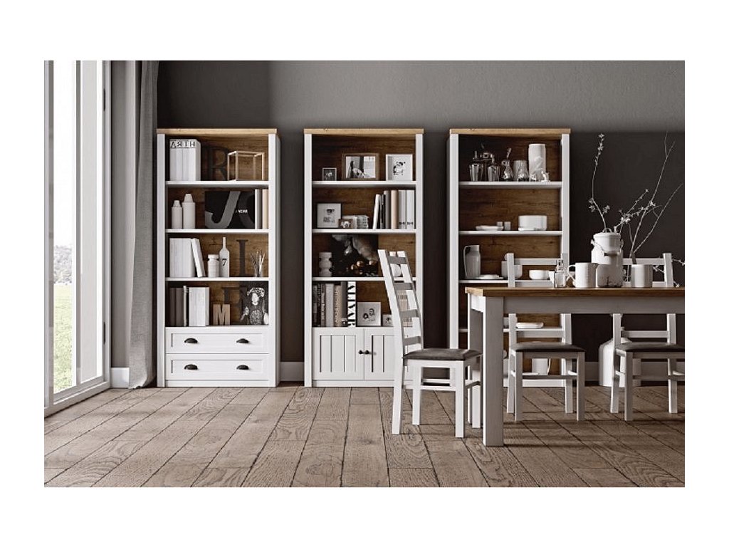 Regál R1 ze sektorového systému PROVANCE v provedení sosna andersen / dub lefkas. Materiál: DTD laminovaná Rozměry (ŠxHxV): 90x43x198 cm Tloušťka materiálu korpus: 15 mm Tloušťka materiálu vrchní desky: 36 mm