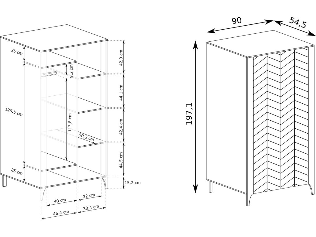 Díky šatní tyčí v jedné polovině a s vnitřními policemi v druhé budete mít ve věcech konečně pořádek. Kvalitní výsuvy (soft close) a panty s tichým dovíráním se postarají o každodenní komfort. Rozměry viz obrázek.
