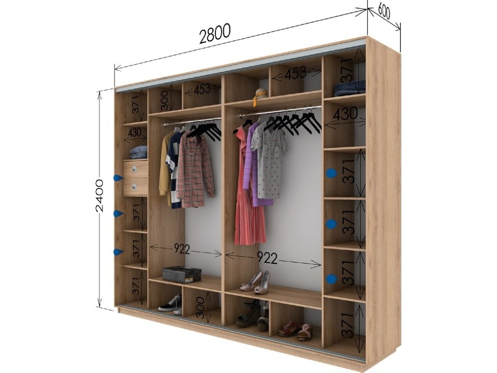 Šatní skříň s posuvnými dveřmi v moderním provedení. Nezvyklá výška 240 cm a šířka 280 cm Vám nabídne opravdu velký úložný prostor. Korpus i dveře jsou z kvalitní LTD desky v barvě bílá (Nymphea Alba). Skříň má aluminiové kování a lišty. Uspořádání polic viz. obrázek. Dodáváme v demontovaném stavu. Možnost dokoupení praktických zásuvek do vnitřního prostoru skříně (modrá barva na perokresbě naznačuje, kam lze zásuvky umístit), obojí naleznete v naší nabídce.Doplňkové parametry